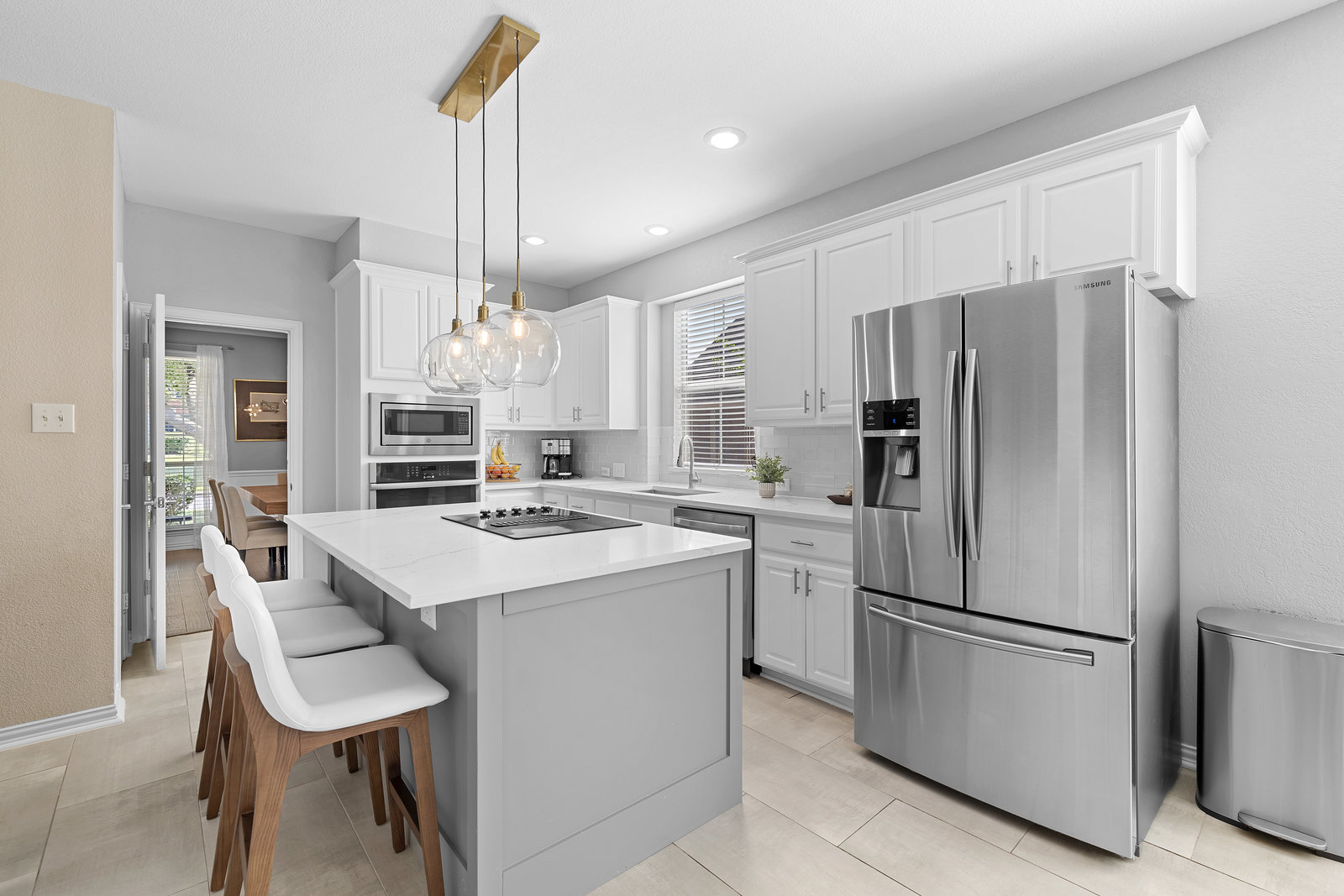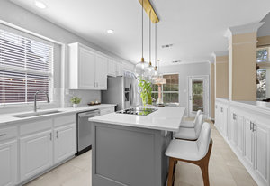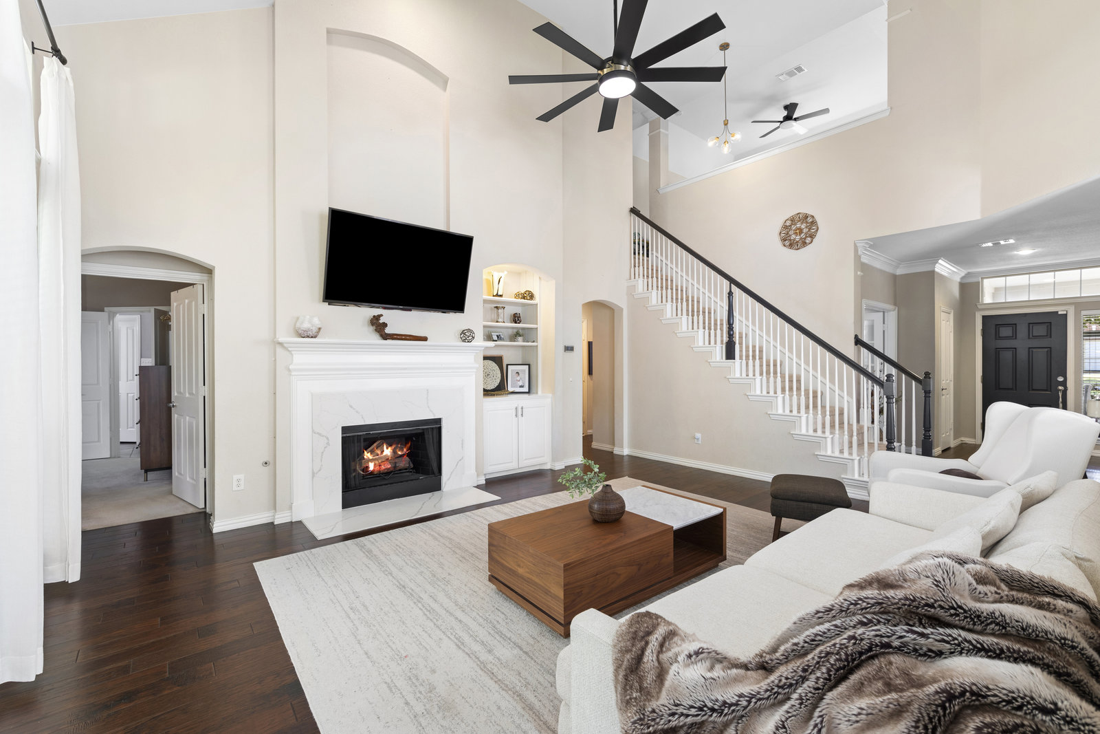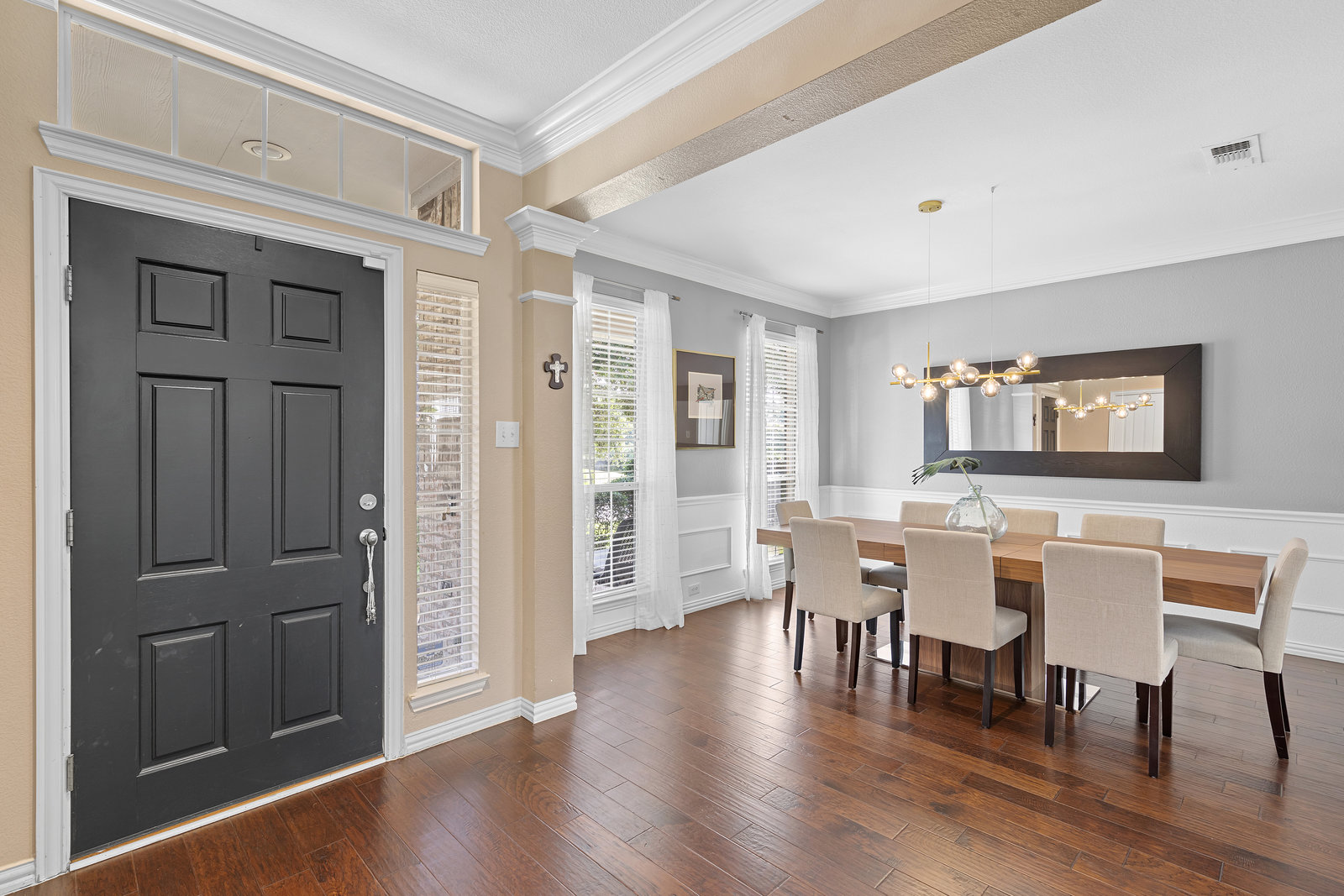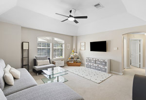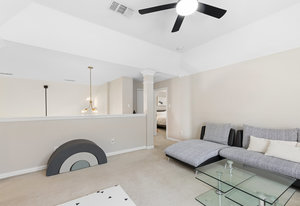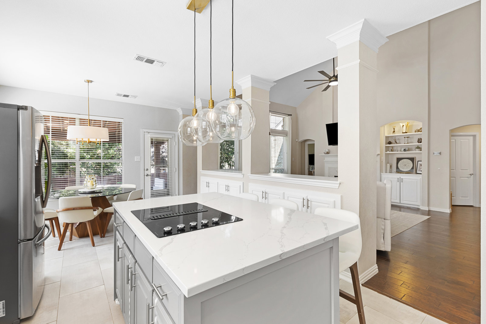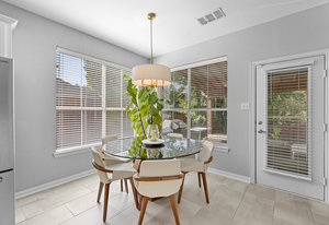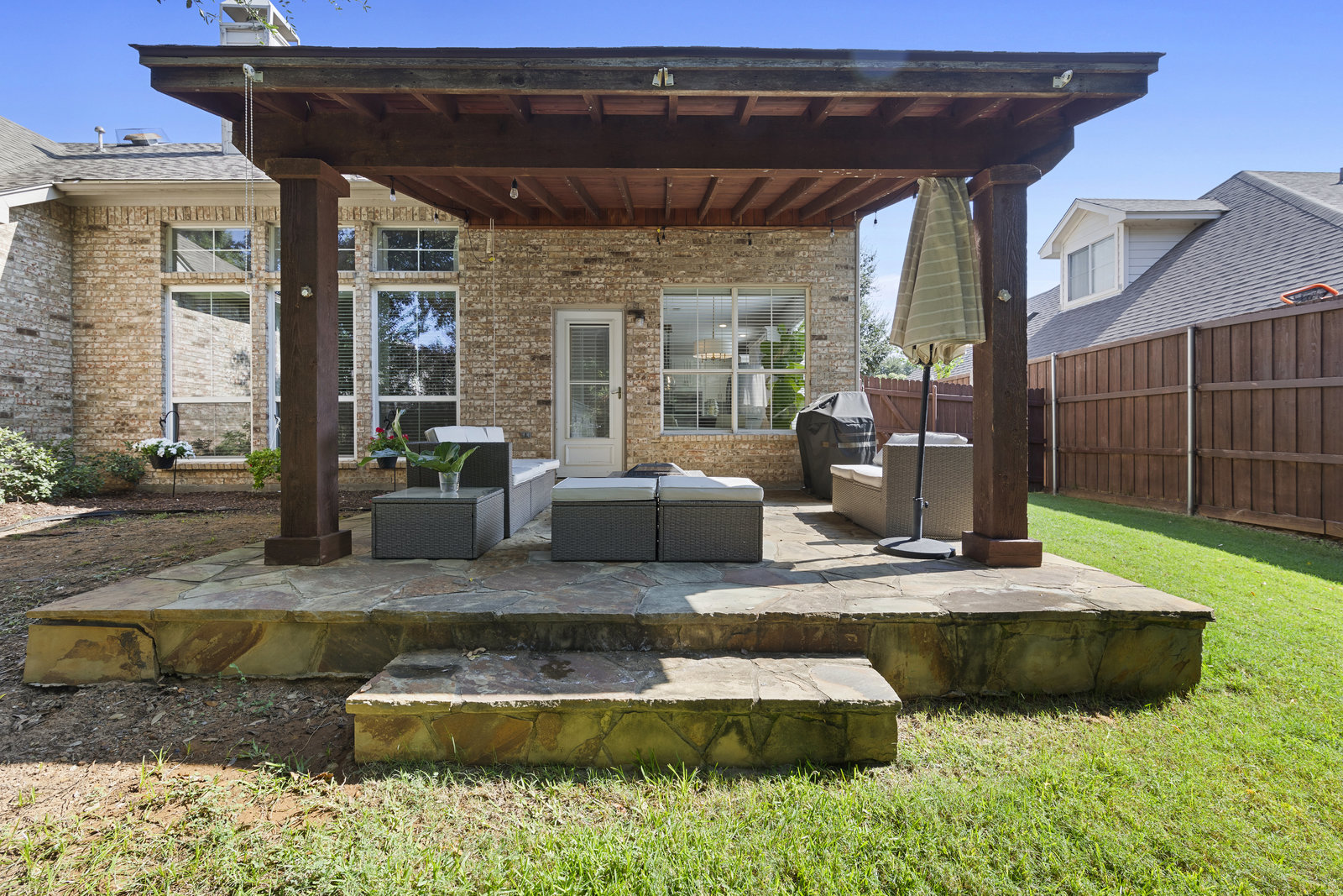 This charming home is filled with upgrades and is just a short walk to the trails of Grapevine Lake and Pickering Park. The welcoming curb appeal features a rare, large covered front porch and beautiful mature trees. Inside, modern and sophisticated updates shine throughout, from the stunning light fixutures to the fresh paint and hardwood floors. The main level provides a spacious primary bedroom, a dedicated office, and a convenient powder bath. The kitchen has been beautifully updated with Quartz countertops, new lighting, a stylish backsplash and udpated appliances. All ceiling fans have been replaced and the secondary bathroom shower tile has been udpated as well. The famiily room is open to the kitchen with a vaulted ciling and cozy wood-burning fireplace, and builtin shelves to display your family treasures. Upstairs has three bedrooms, a full bath and large game room area. And just in time for autumn, you'll enjoy the backyard with a large covered patio and pergola! Don't miss this opportunity to live in a highly desirable neighborhood in North Grapevine!