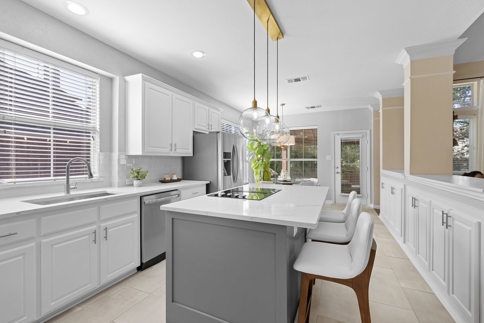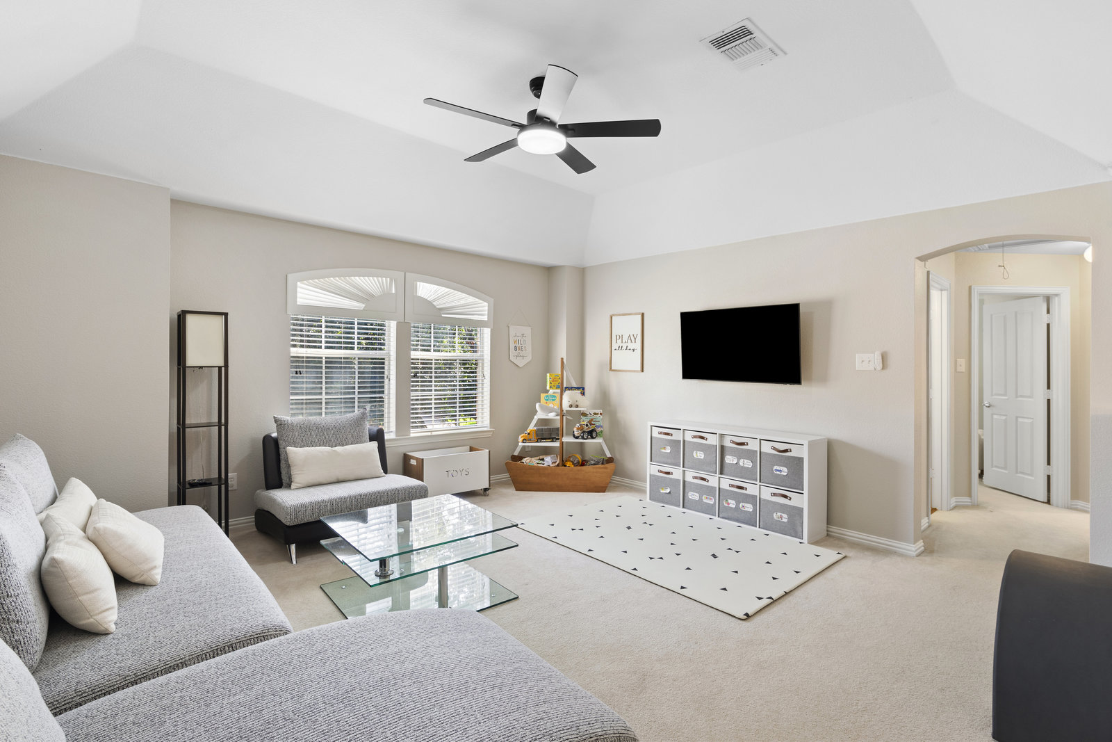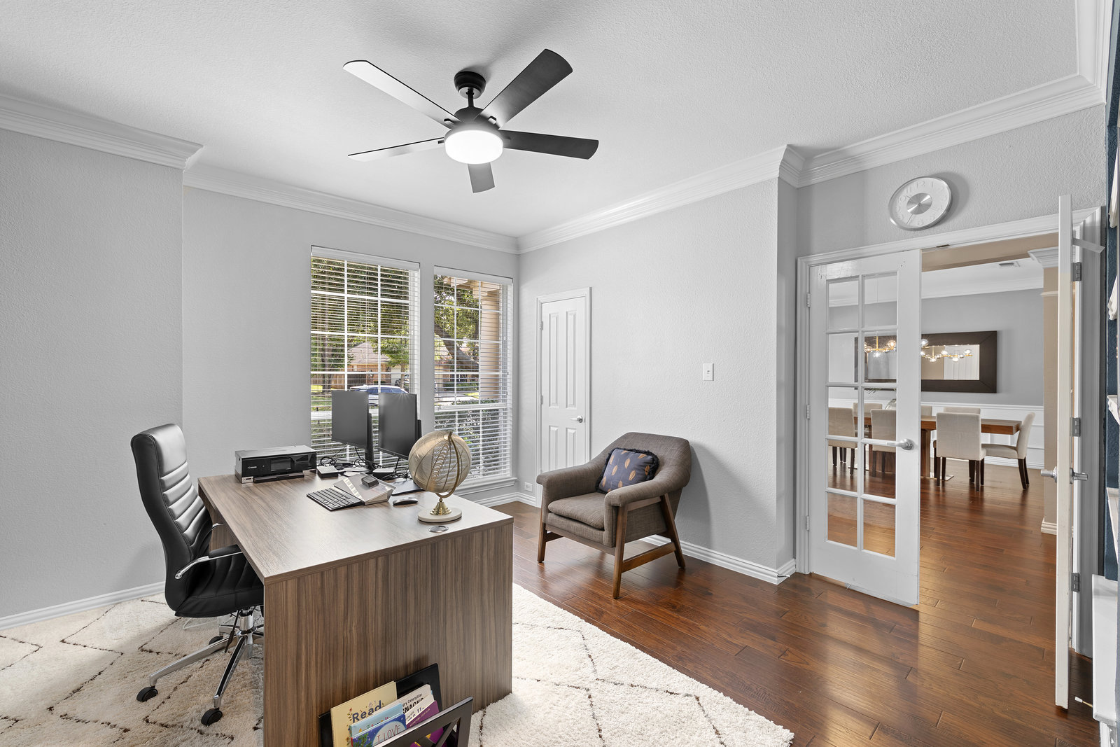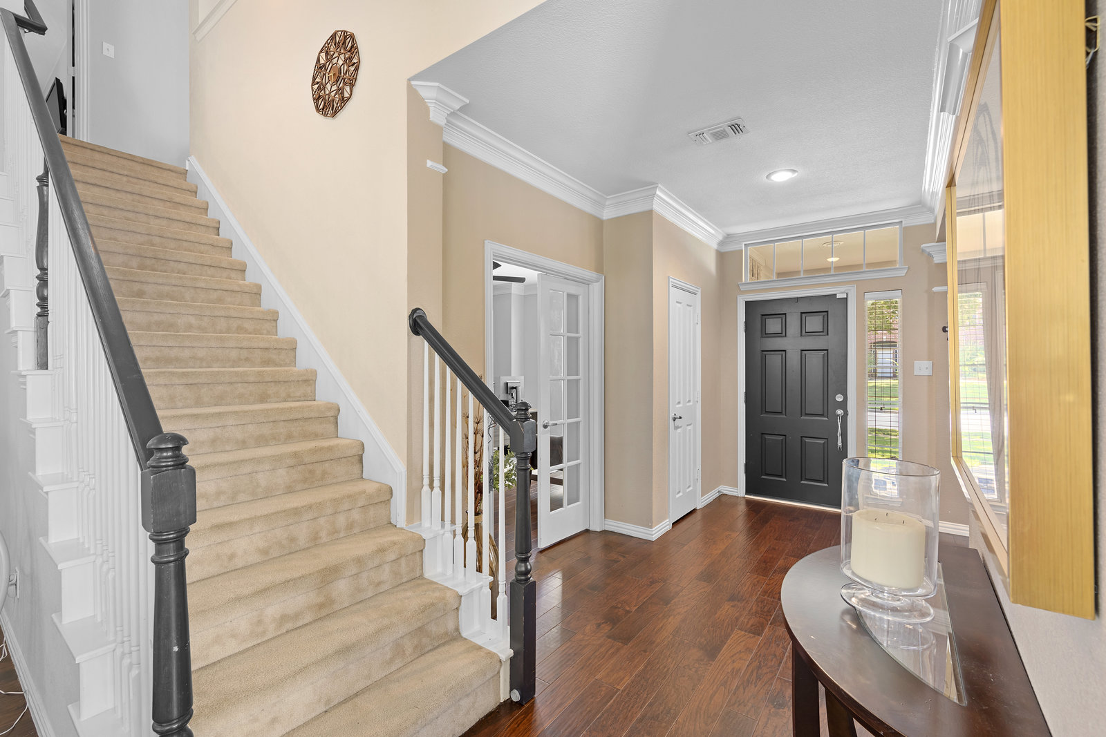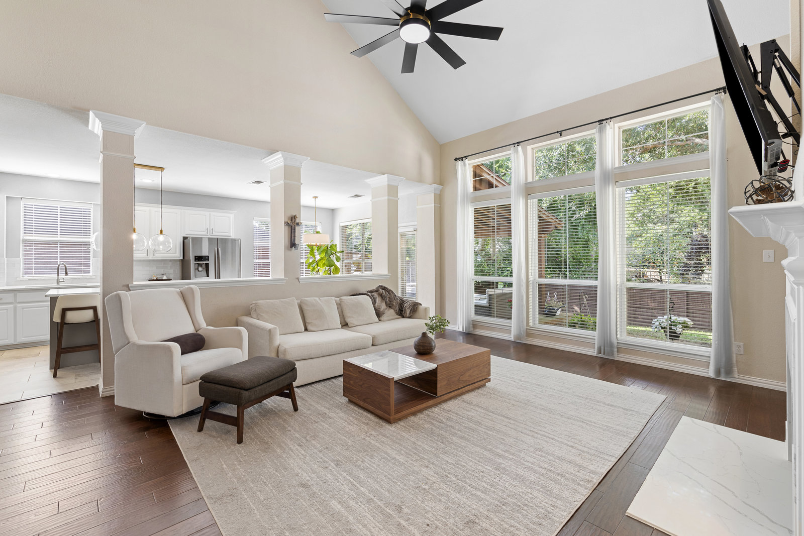 This charming home is filled with upgrades and is just a short walk to the trails of Grapevine Lake and Pickering Park. The welcoming curb appeal features a rare, large covered front porch and beautiful mature trees. Inside, modern and sophisticated updates shine throughout, from the stunning light fixutures to the fresh paint and hardwood floors. The main level provides a spacious primary bedroom, a dedicated office, and a convenient powder bath. The kitchen has been beautifully updated with Quartz countertops, new lighting, a stylish backsplash and udpated appliances. All ceiling fans have been replaced and the secondary bathroom shower tile has been udpated as well. The famiily room is open to the kitchen with a vaulted ciling and cozy wood-burning fireplace, and builtin shelves to display your family treasures. Upstairs has three bedrooms, a full bath and large game room area. And just in time for autumn, you'll enjoy the backyard with a large covered patio and pergola! Don't miss this opportunity to live in a highly desirable neighborhood in North Grapevine!