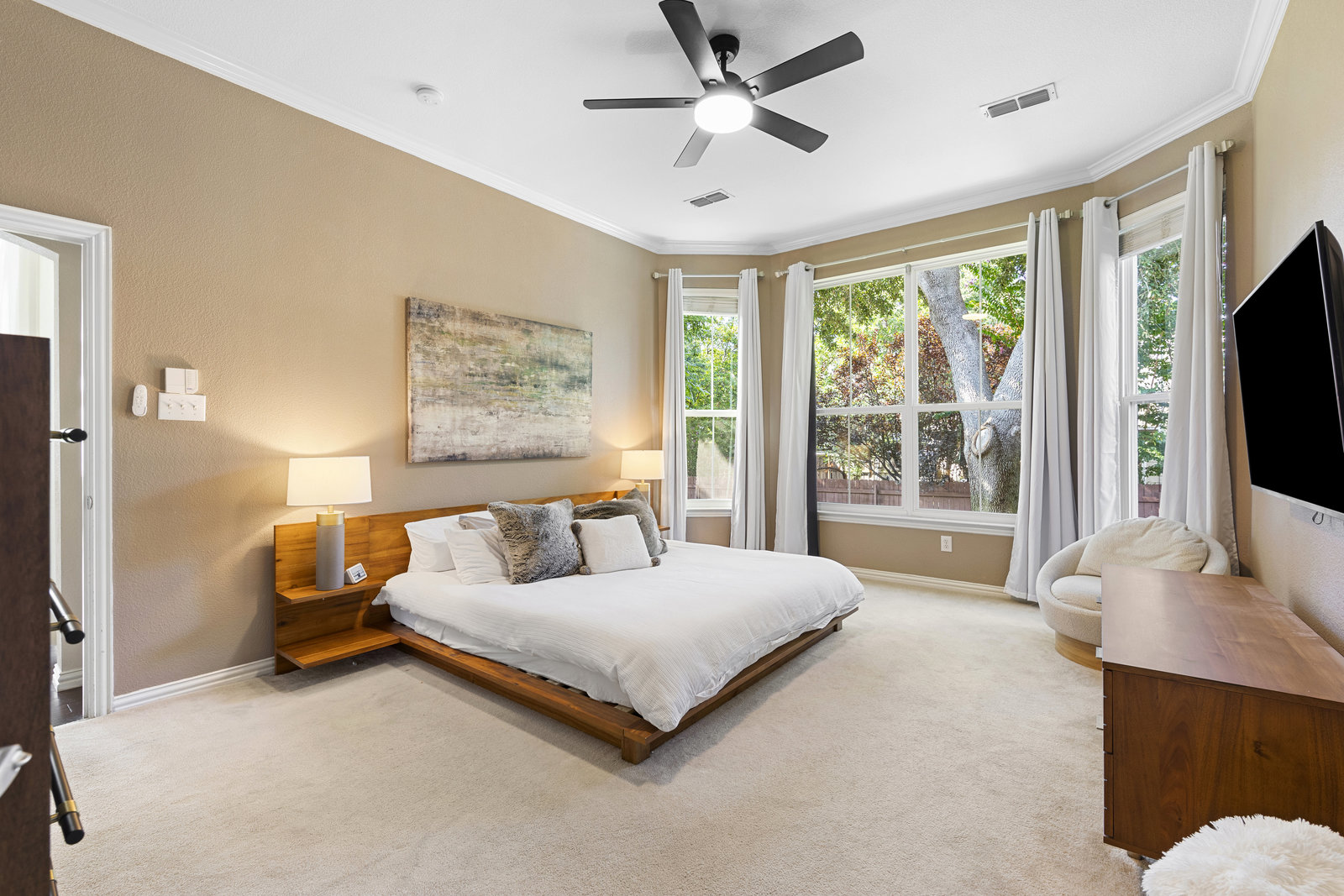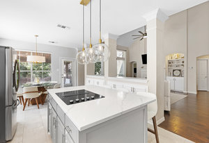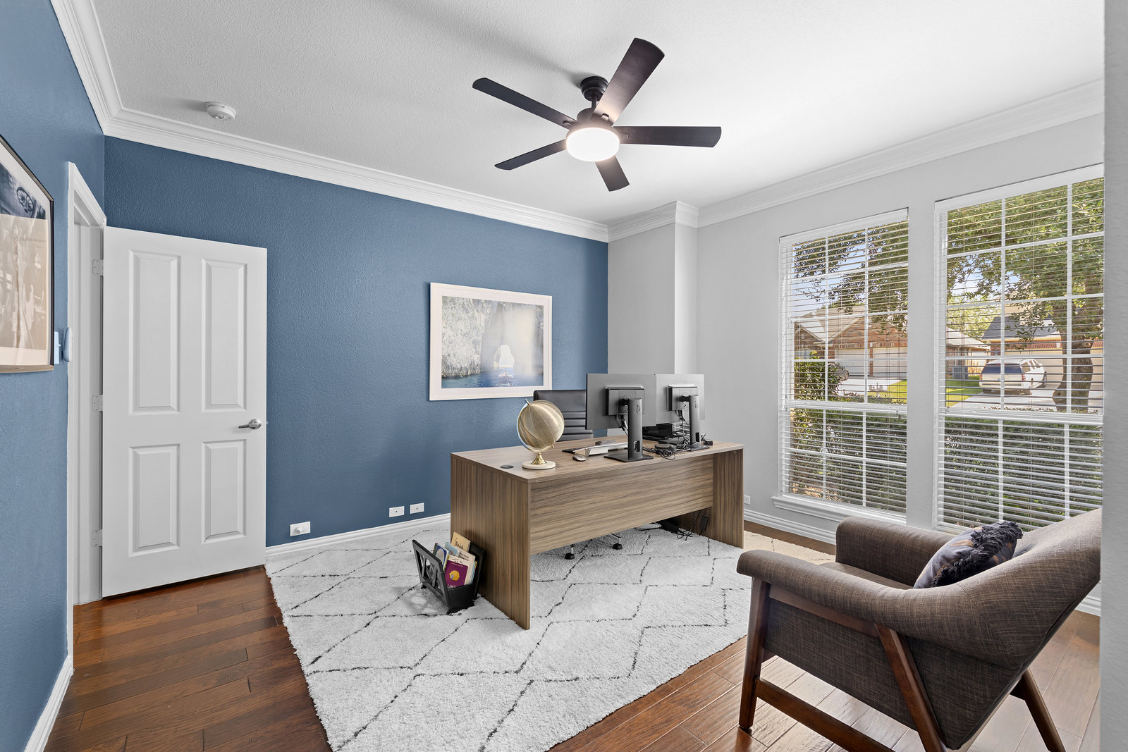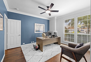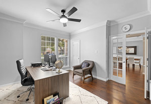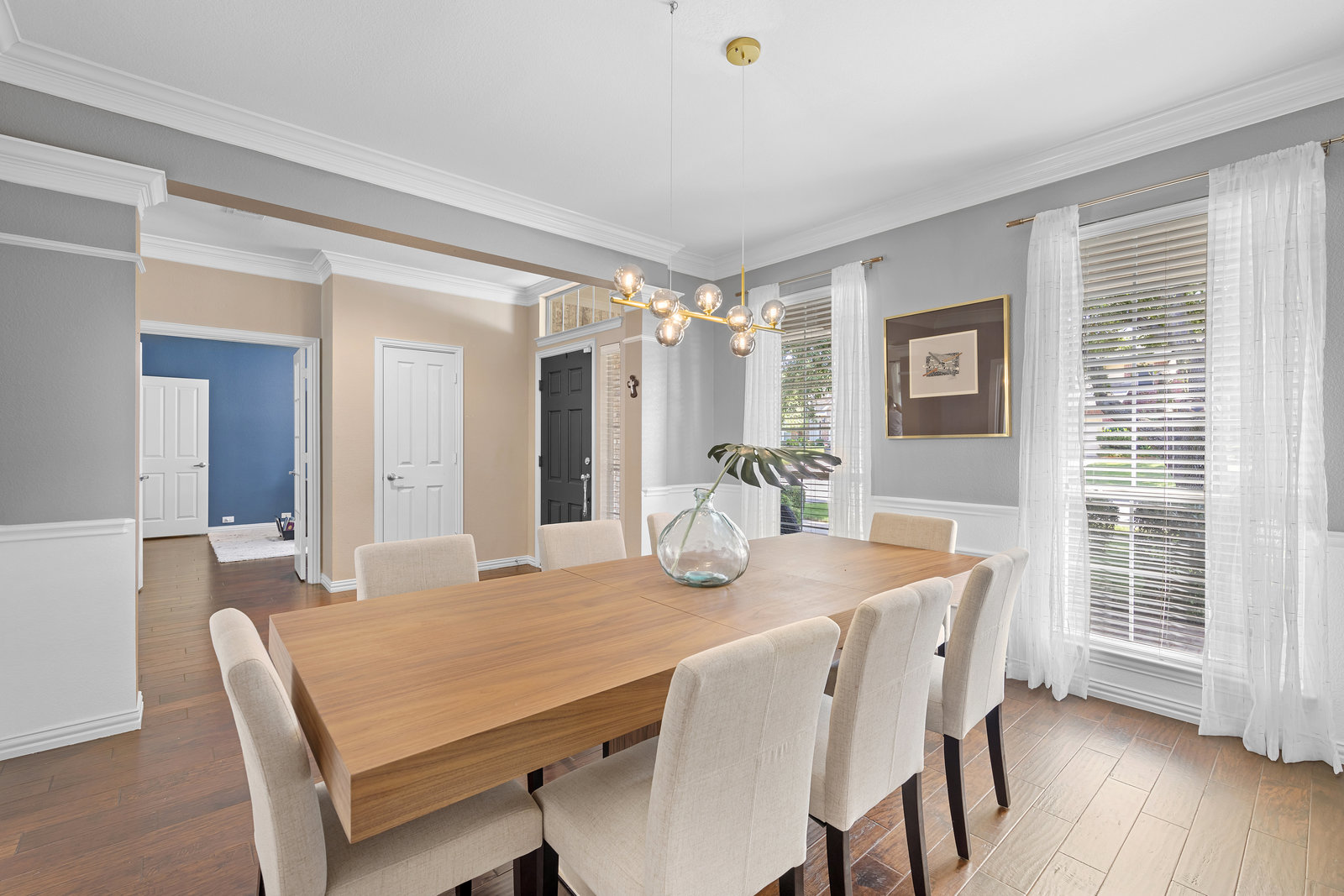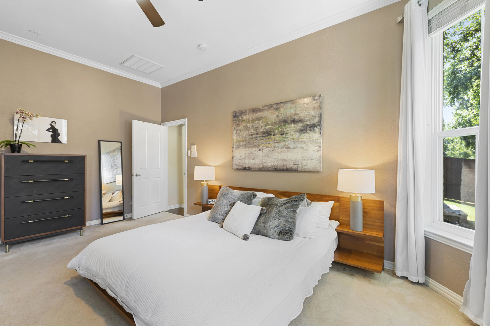 This charming home is filled with upgrades and is just a short walk to the trails of Grapevine Lake and Pickering Park. The welcoming curb appeal features a rare, large covered front porch and beautiful mature trees. Inside, modern and sophisticated updates shine throughout, from the stunning light fixutures to the fresh paint and hardwood floors. The main level provides a spacious primary bedroom, a dedicated office, and a convenient powder bath. The kitchen has been beautifully updated with Quartz countertops, new lighting, a stylish backsplash and udpated appliances. All ceiling fans have been replaced and the secondary bathroom shower tile has been udpated as well. The famiily room is open to the kitchen with a vaulted ciling and cozy wood-burning fireplace, and builtin shelves to display your family treasures. Upstairs has three bedrooms, a full bath and large game room area. And just in time for autumn, you'll enjoy the backyard with a large covered patio and pergola! Don't miss this opportunity to live in a highly desirable neighborhood in North Grapevine!