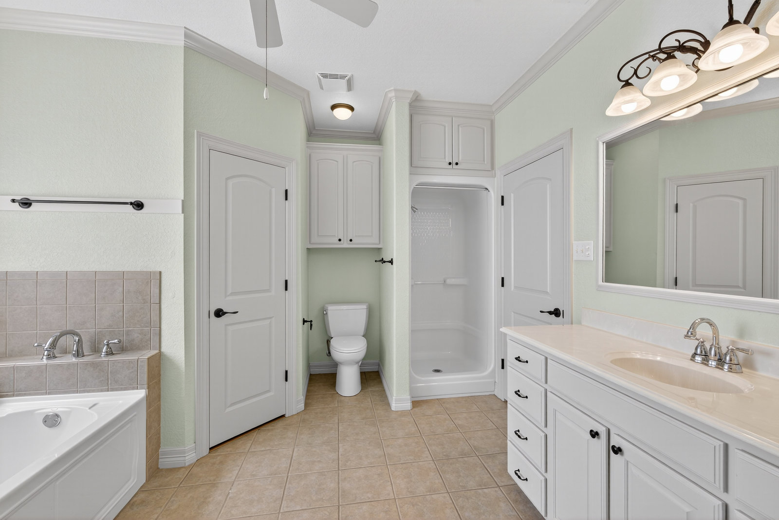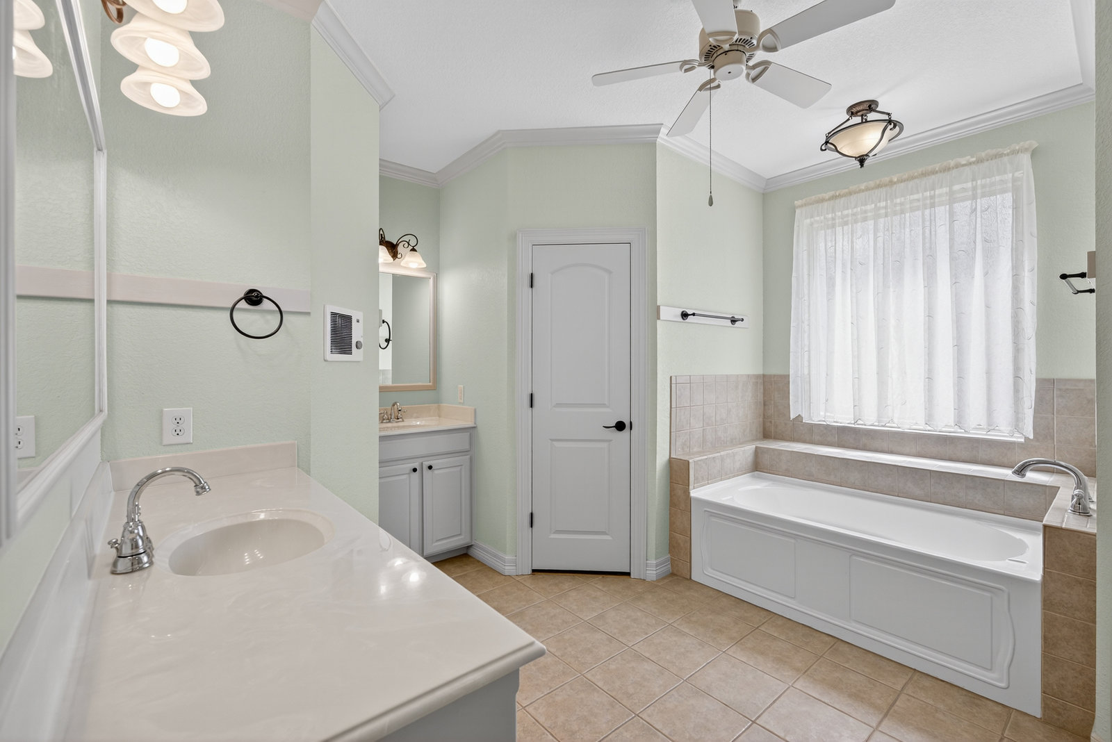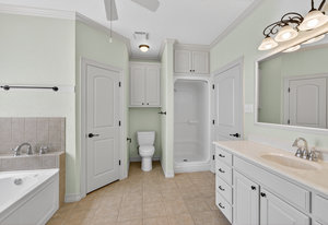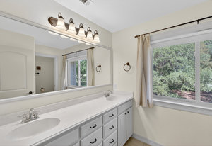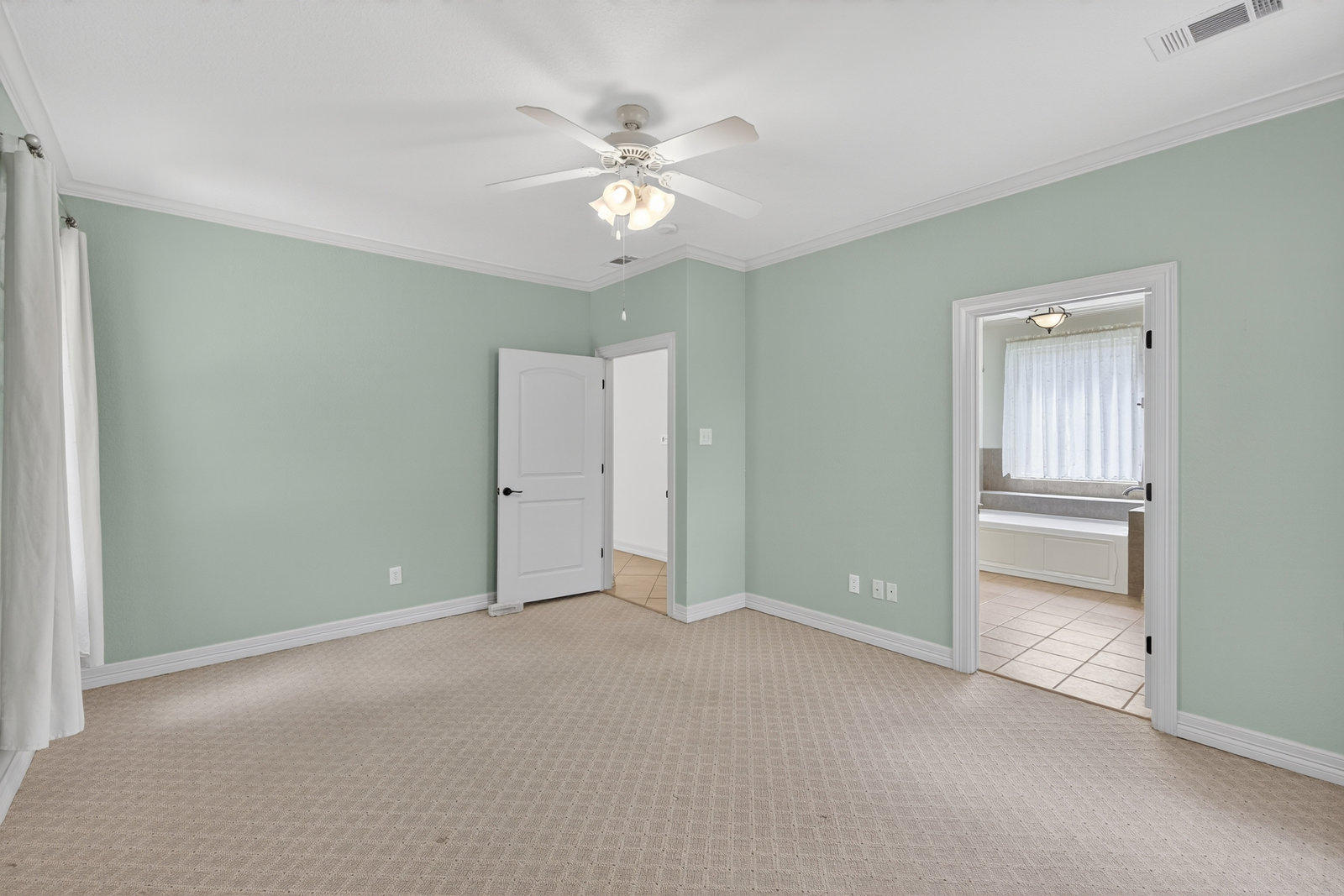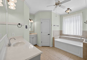The serene primary suite includes large windows, a soaking tub, separate shower, and dual vanities for added comfort. Three additional bedrooms provide plenty of space for family, guests, or a home office.