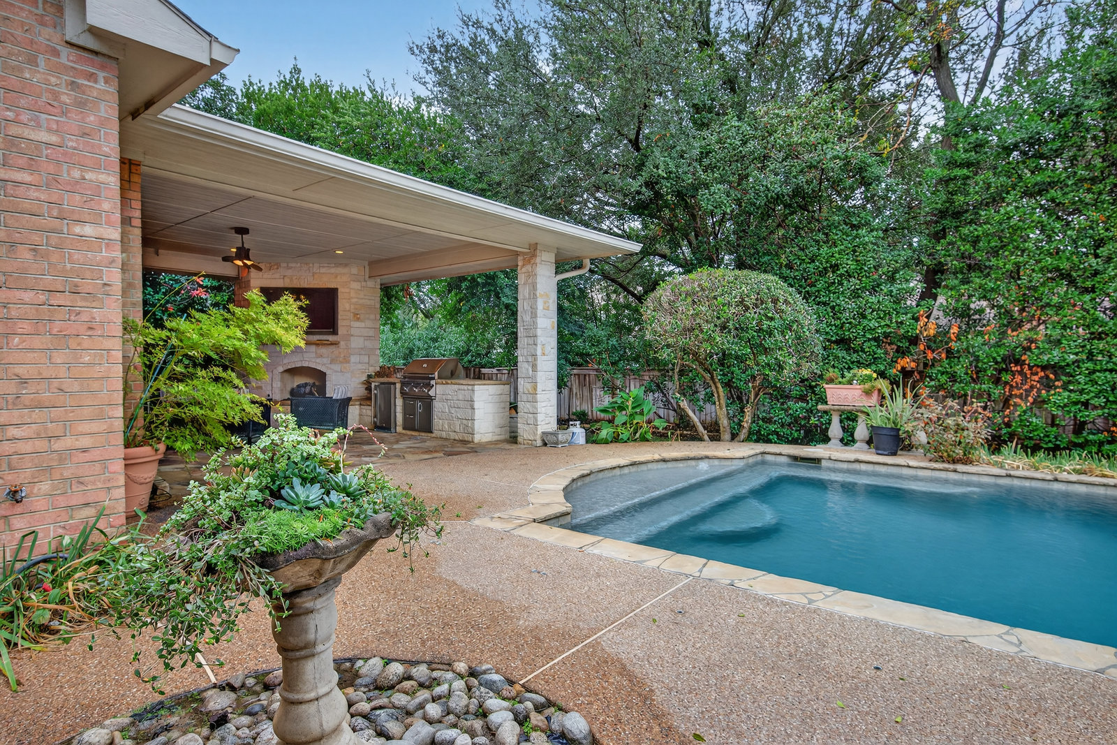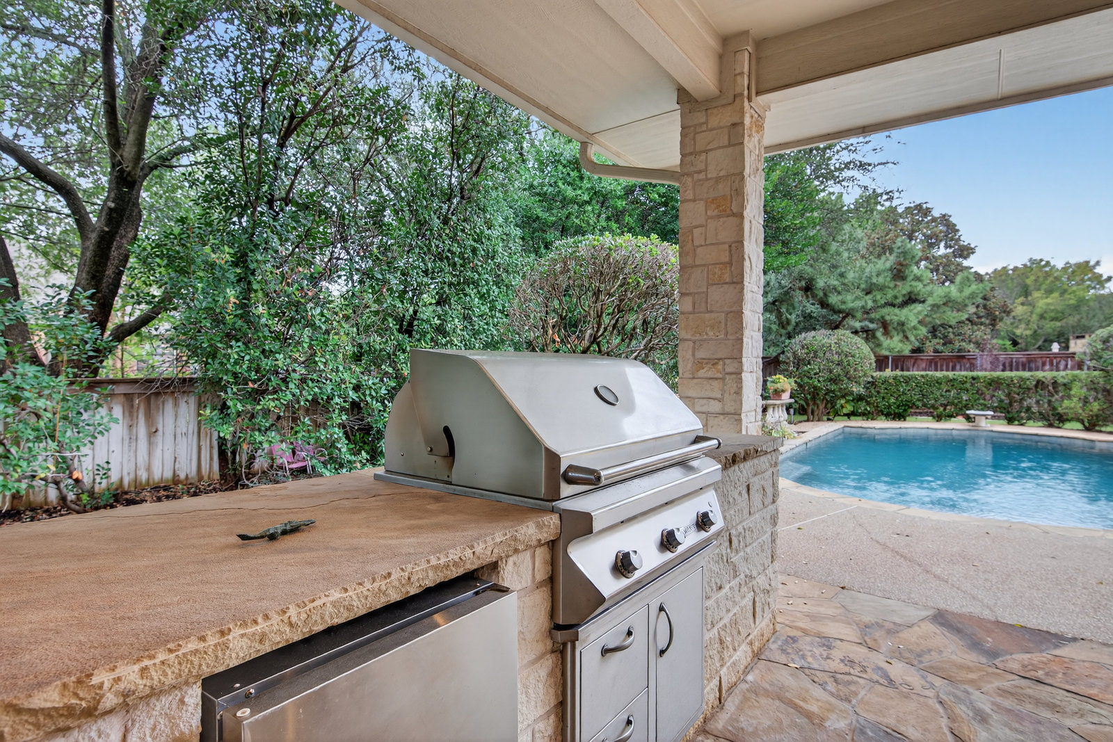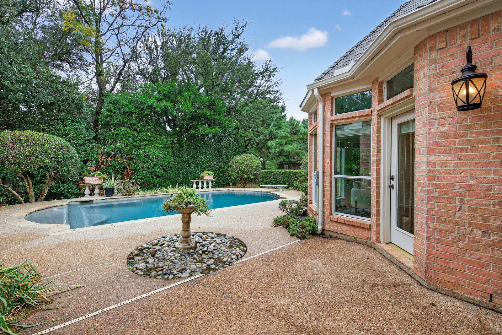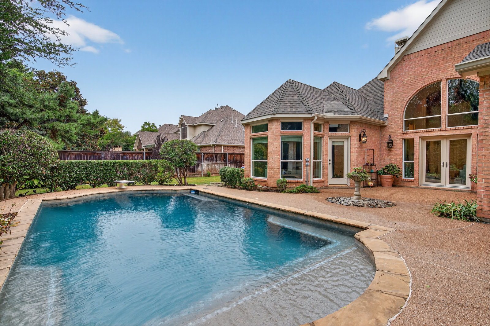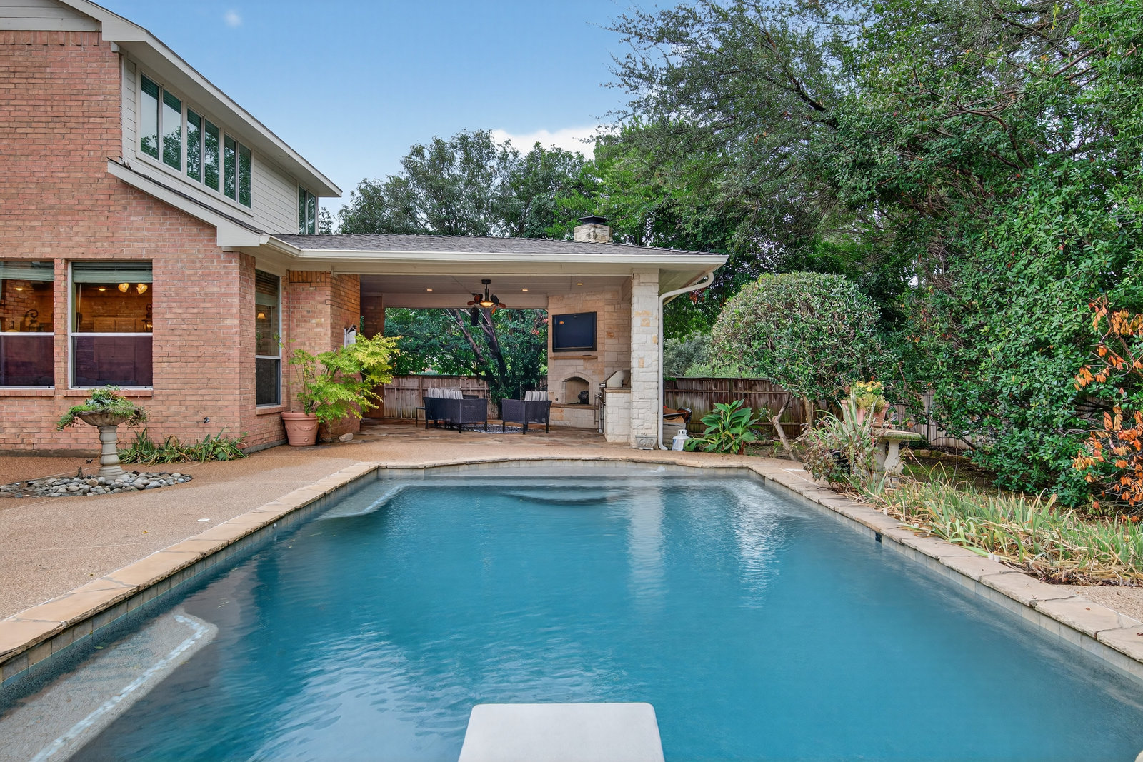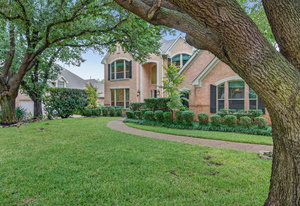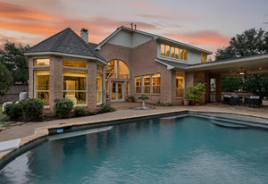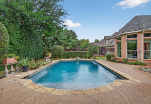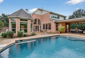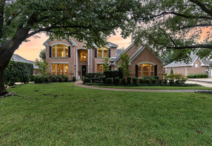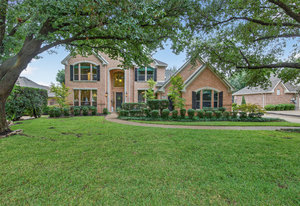 Elegant 4-bedroom, 3.5-bath Southlake home with 3-car garage, sparkling diving pool, and outdoor living area. The grand entry welcomes you with soaring ceilings, a sweeping staircase, and abundant natural light. Features include formal dining, private study, and open living with hardwood floors and a stone fireplace. The chef’s kitchen offers granite counters, stainless steel appliances, double ovens, and crisp white cabinetry. The primary suite overlooks the pool and boasts a fully renovated spa bath with freestanding tub, marble tile, and glass shower. Upstairs are three spacious bedrooms, two updated baths, and a large game room. The backyard is perfect for entertaining with diving pool, and covered patio with fireplace, grill and small refridgerator surrounded by mature trees. Located in highly sought-after Southlake with top-rated Carroll ISD schools — this home combines timeless style, comfort, and resort-like living in one stunning package.