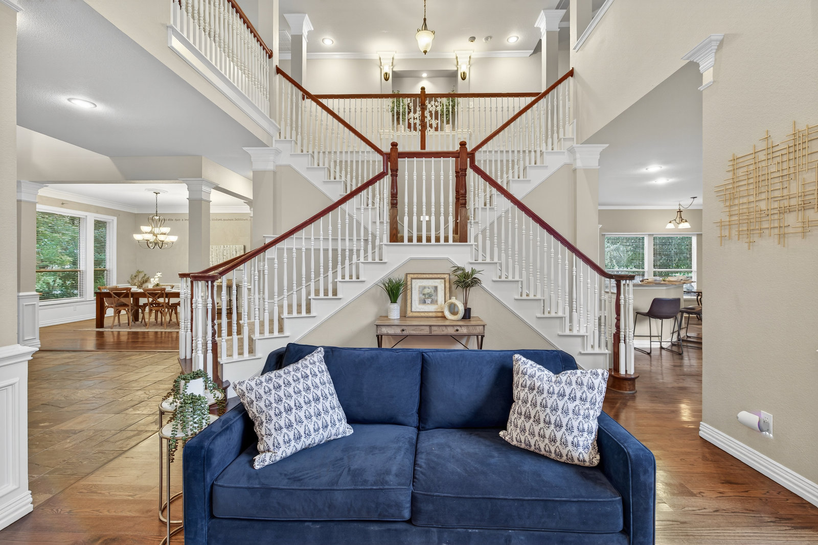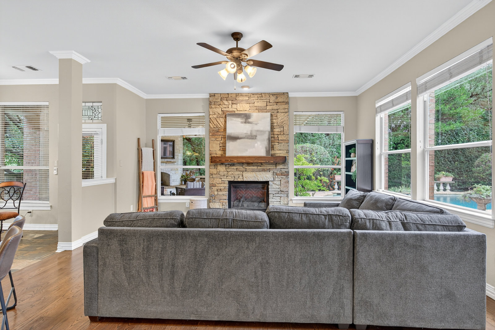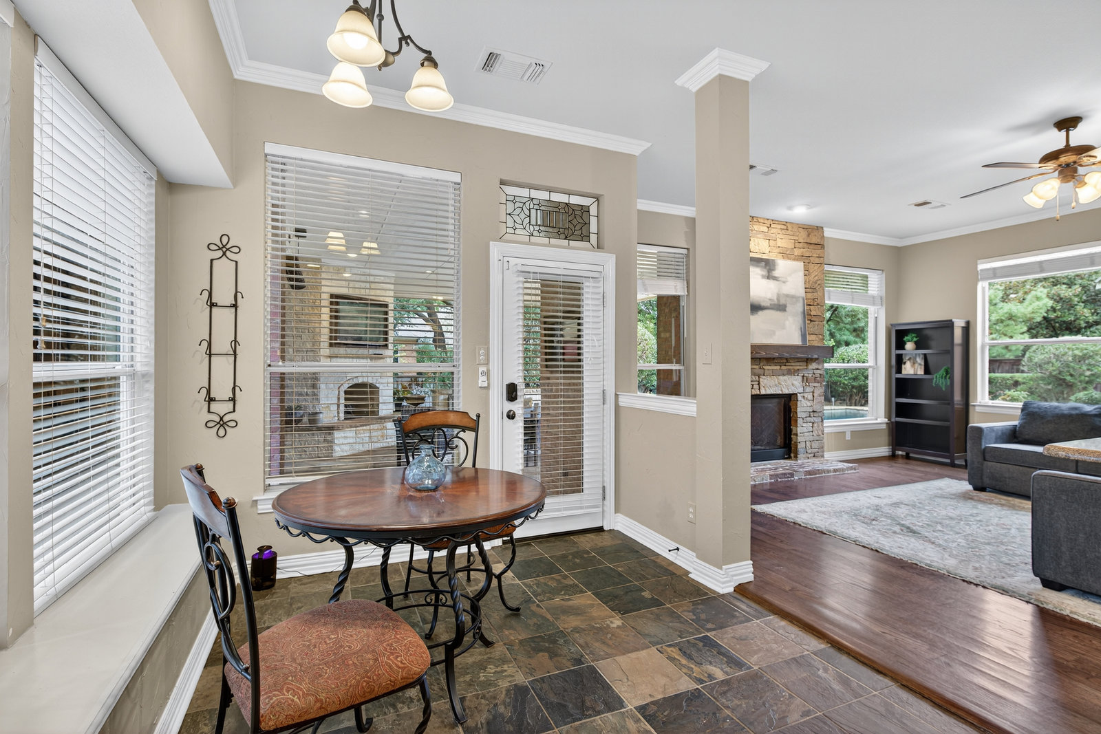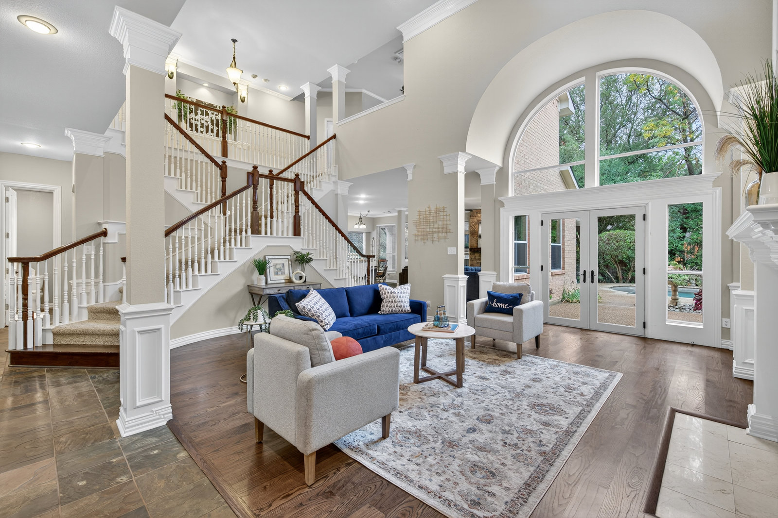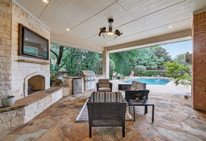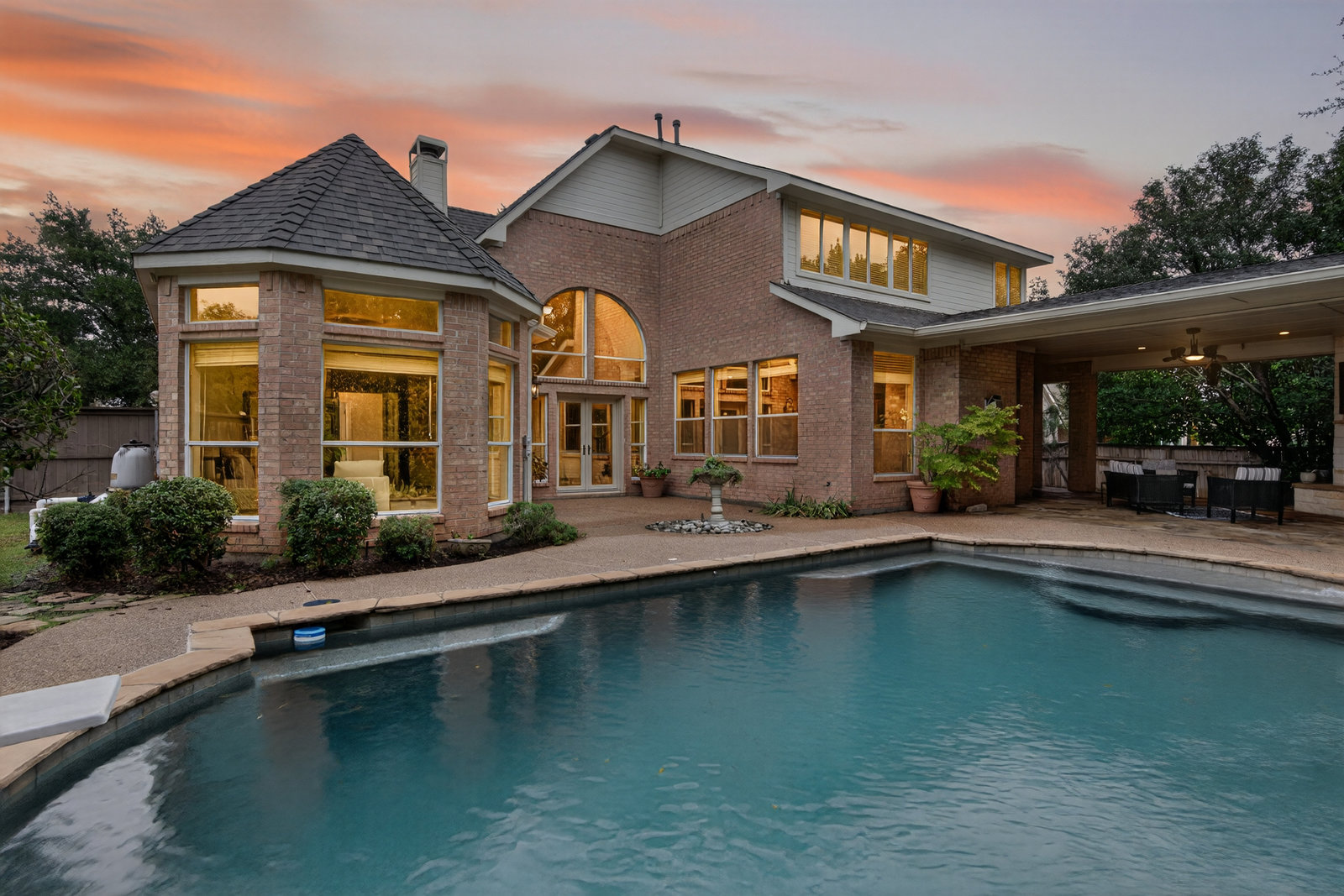 Elegant 4-bedroom, 3.5-bath Southlake home with 3-car garage, sparkling diving pool, and outdoor living area. The grand entry welcomes you with soaring ceilings, a sweeping staircase, and abundant natural light. Features include formal dining, private study, and open living with hardwood floors and a stone fireplace. The chef’s kitchen offers granite counters, stainless steel appliances, double ovens, and crisp white cabinetry. The primary suite overlooks the pool and boasts a fully renovated spa bath with freestanding tub, marble tile, and glass shower. Upstairs are three spacious bedrooms, two updated baths, and a large game room. The backyard is perfect for entertaining with diving pool, and covered patio with fireplace, grill and small refridgerator surrounded by mature trees. Located in highly sought-after Southlake with top-rated Carroll ISD schools — this home combines timeless style, comfort, and resort-like living in one stunning package.