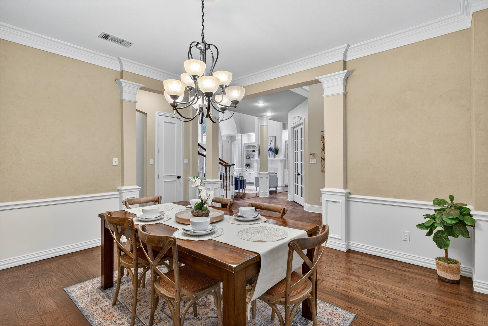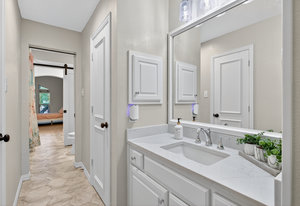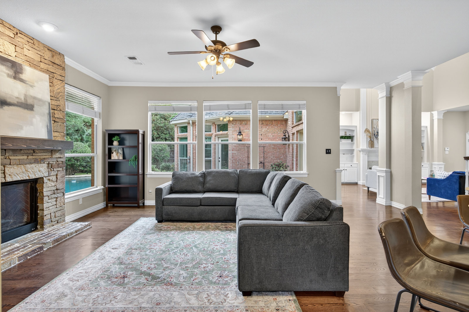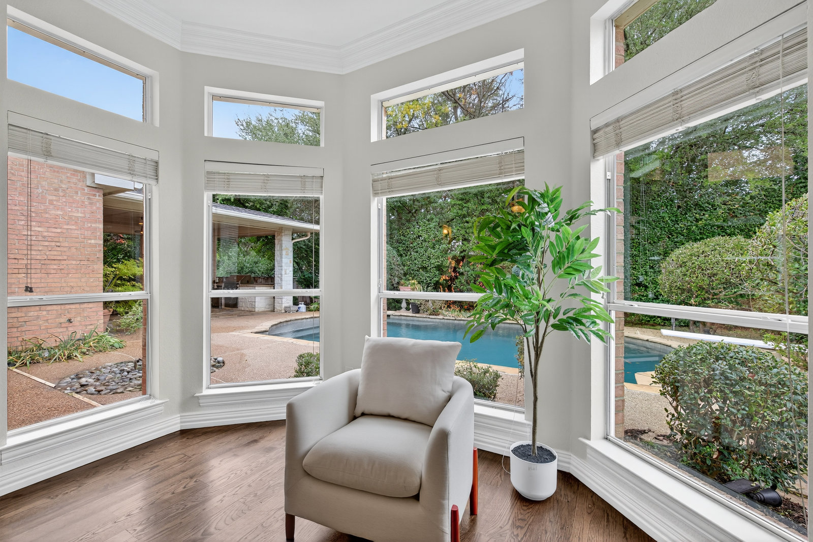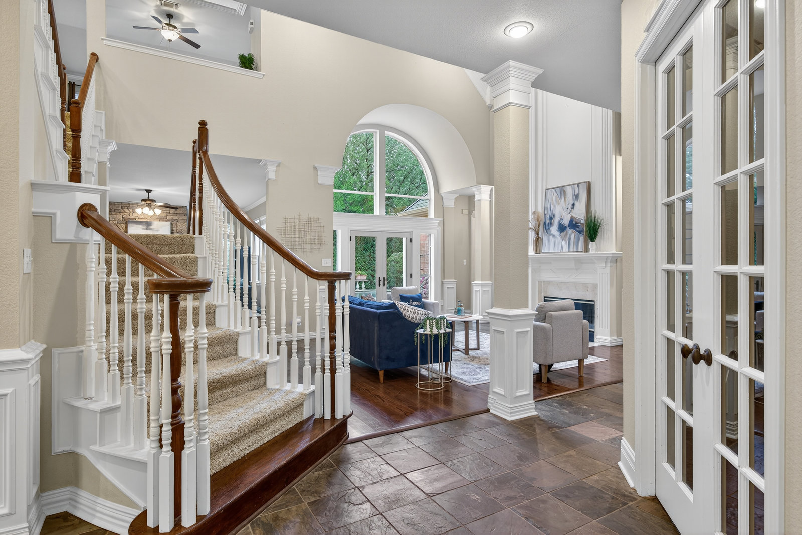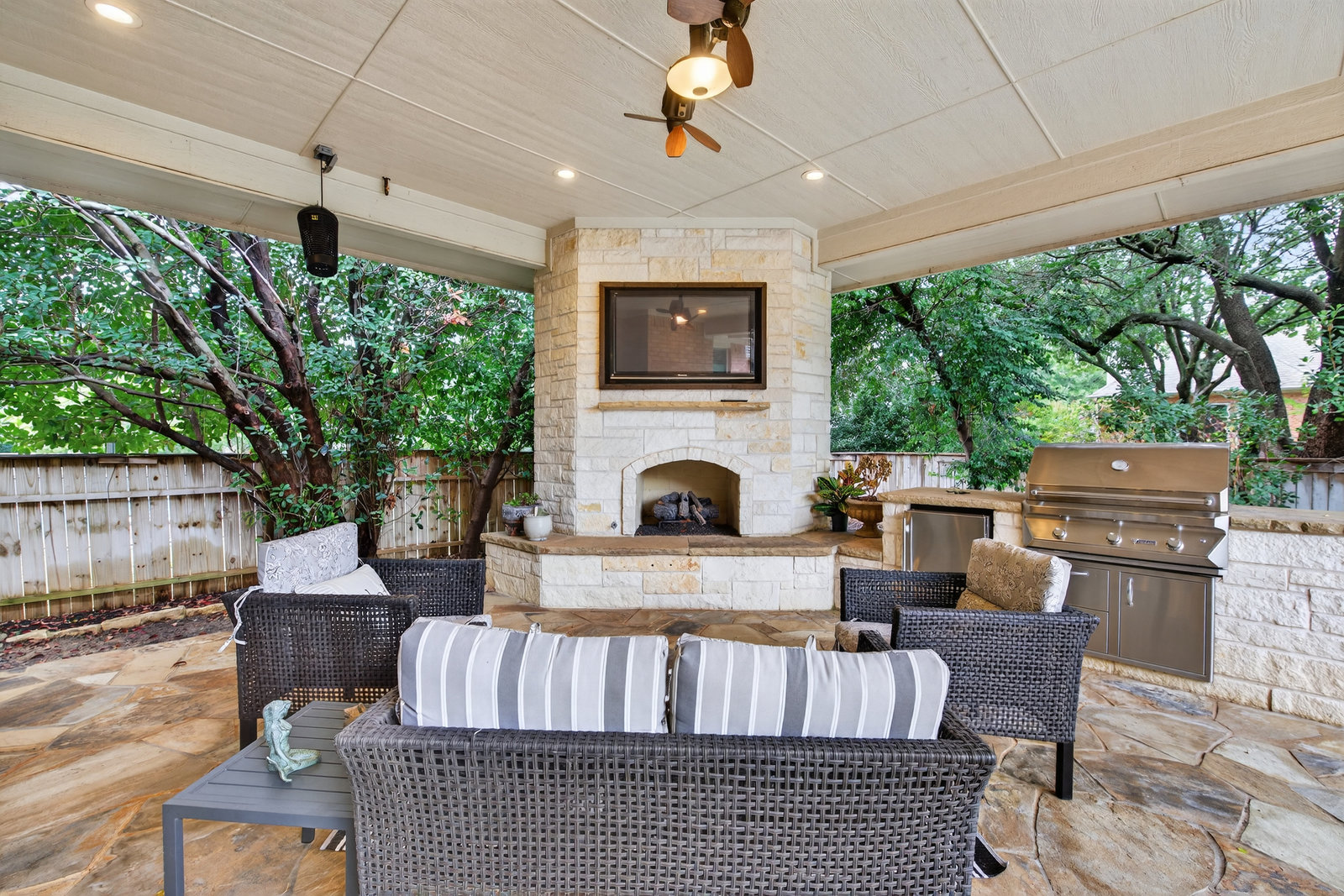 Elegant 4-bedroom, 3.5-bath Southlake home with 3-car garage, sparkling diving pool, and outdoor living area. The grand entry welcomes you with soaring ceilings, a sweeping staircase, and abundant natural light. Features include formal dining, private study, and open living with hardwood floors and a stone fireplace. The chef’s kitchen offers granite counters, stainless steel appliances, double ovens, and crisp white cabinetry. The primary suite overlooks the pool and boasts a fully renovated spa bath with freestanding tub, marble tile, and glass shower. Upstairs are three spacious bedrooms, two updated baths, and a large game room. The backyard is perfect for entertaining with diving pool, and covered patio with fireplace, grill and small refridgerator surrounded by mature trees. Located in highly sought-after Southlake with top-rated Carroll ISD schools — this home combines timeless style, comfort, and resort-like living in one stunning package.