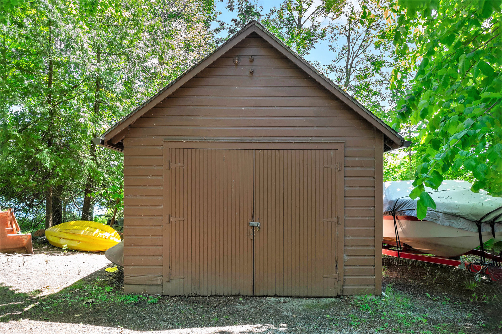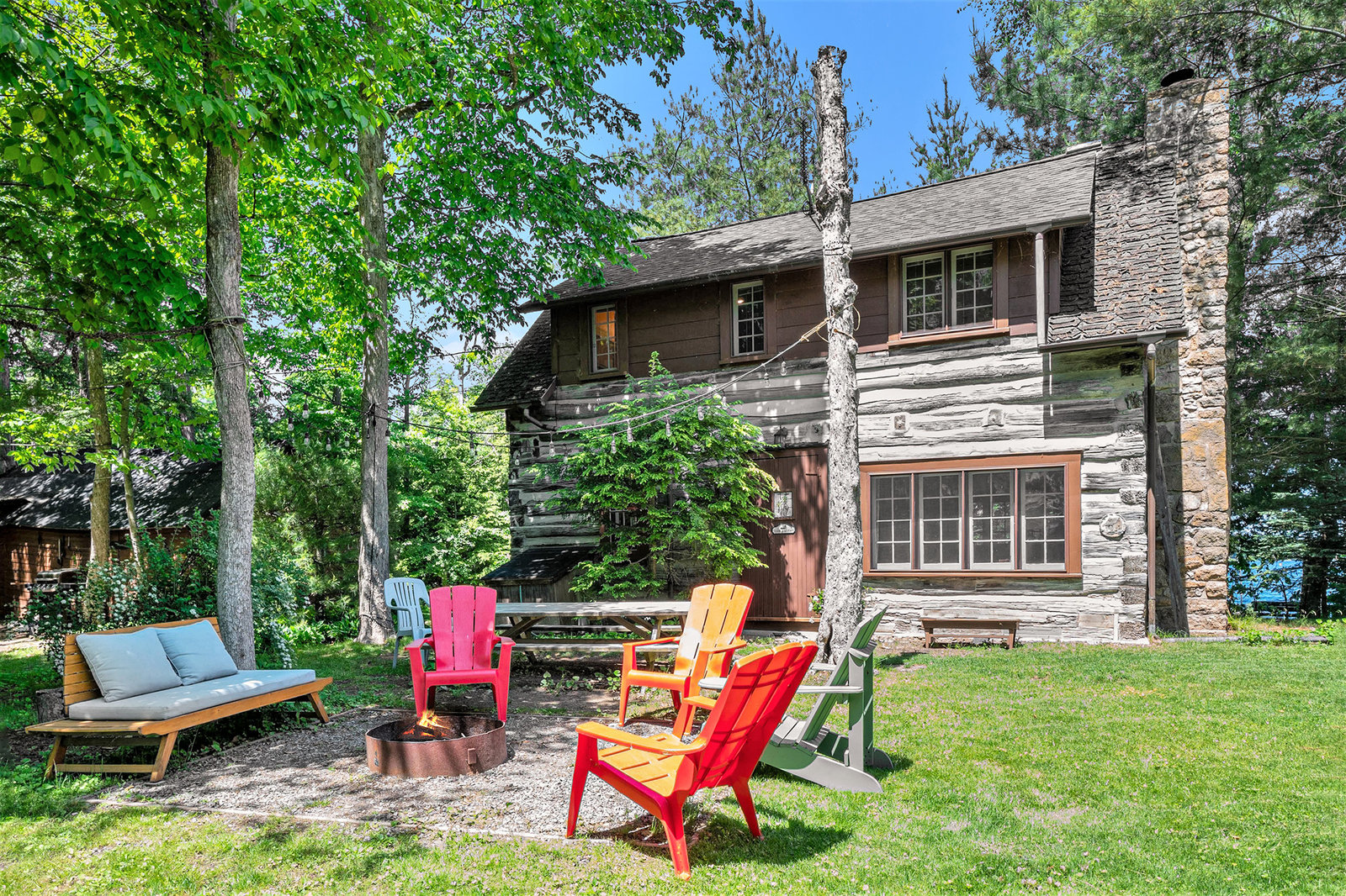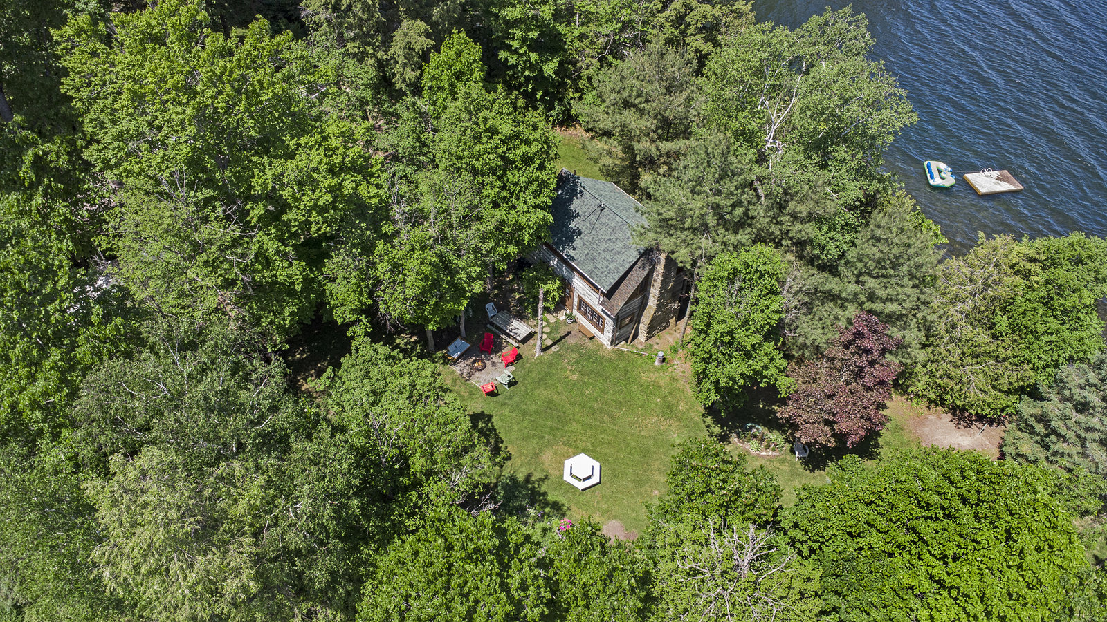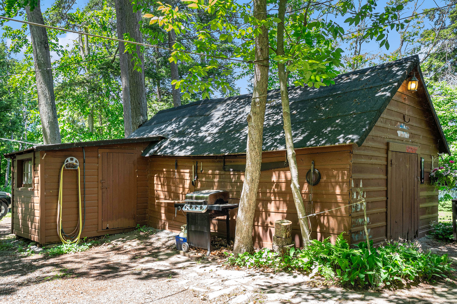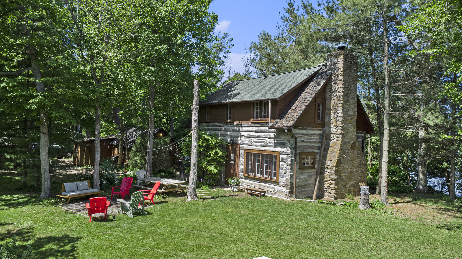 The historic two-story log house was build in the late 1830s by William and Rose (McNally) Kearney. It was located on Lot 2, Concession 5, in North Crosby Township, on the weatern corner of a 112-acre farm purchased by Rose's brohter, Henry McNally, in 1831. The house was replaced by a larger home around 1860. It was then used for farm machinery until 1932, when it was relocated by Joseph V. McNally to the eastern corner of the farm property, on a beautiful treed lot along McNally's Bay near the Rideau Canal at Newboro. Joseph had the log building enlarged and renovated, naming the well-treed lakeshore estate "The Hemlocks". When he died in 1957, he bequeathed the propety to a niece, Gertrude (McNally) Jones. She enjoyed it as a summer home until selling it to Ernest and Lois Weston in 1980. The current owner purchased the hand-hewn squared log cottage two years later as a summer retreat for their family.