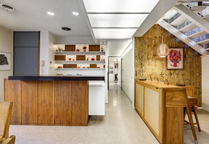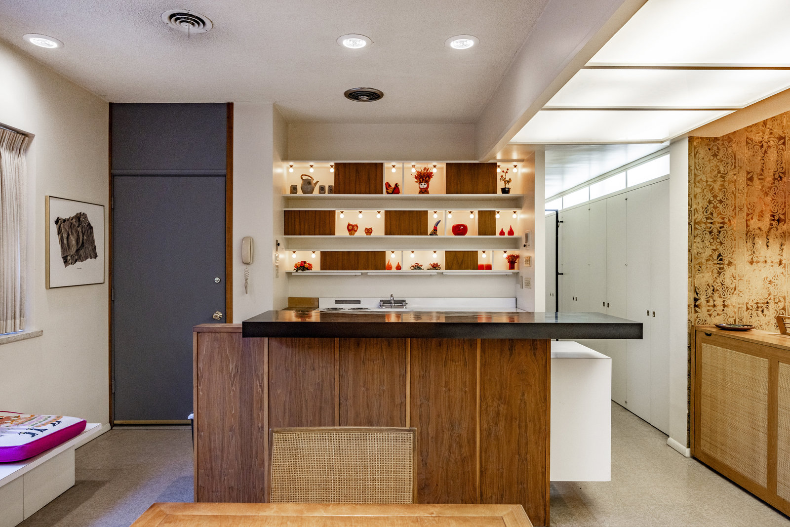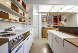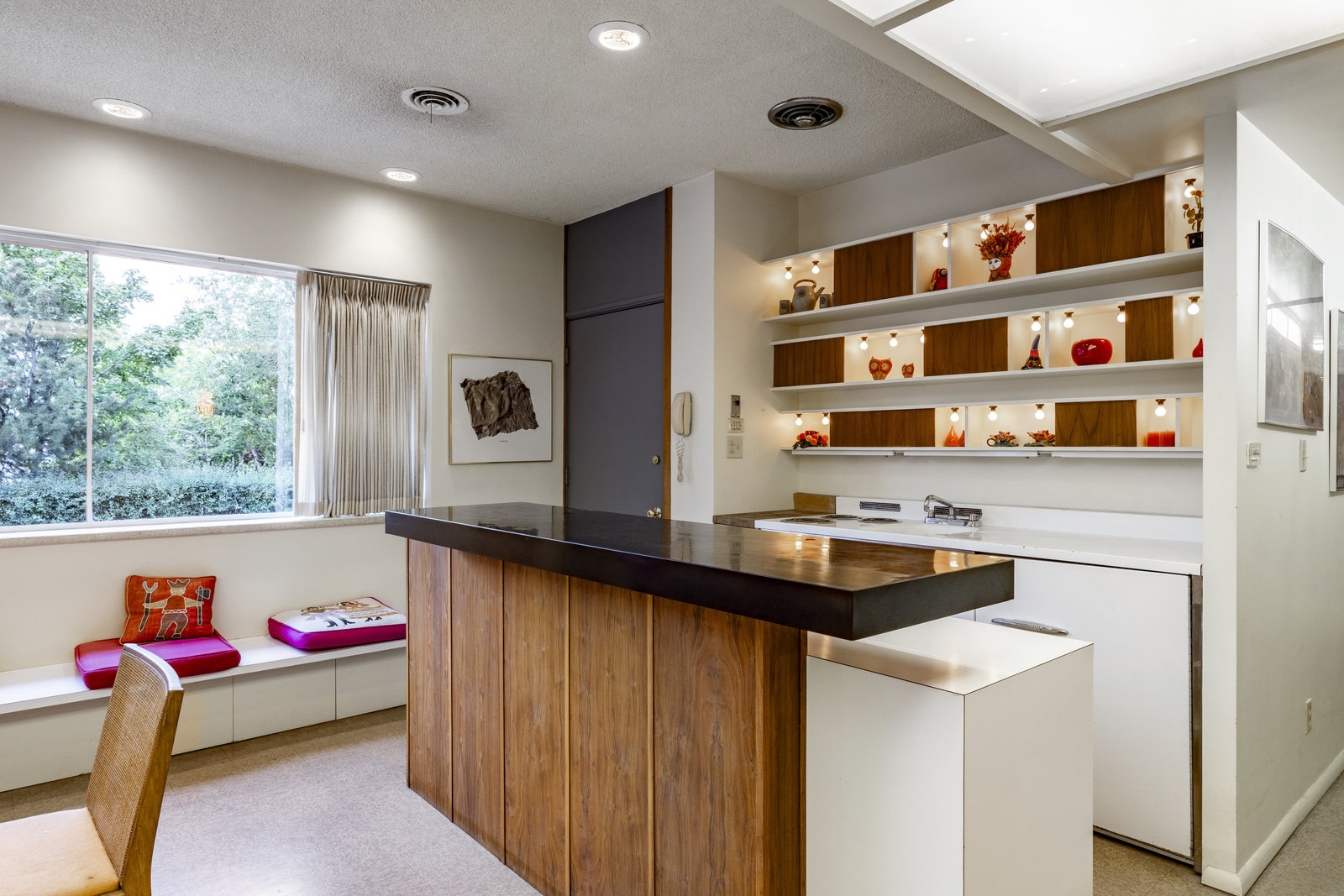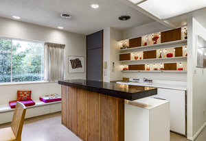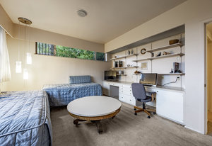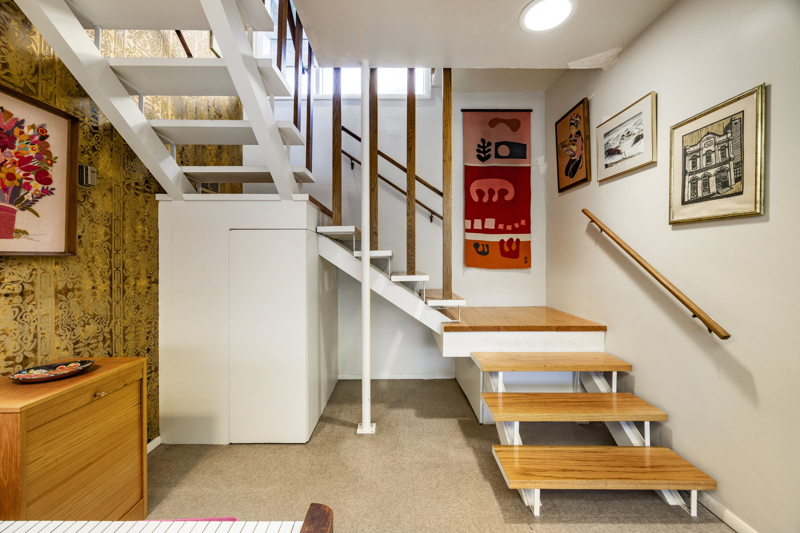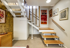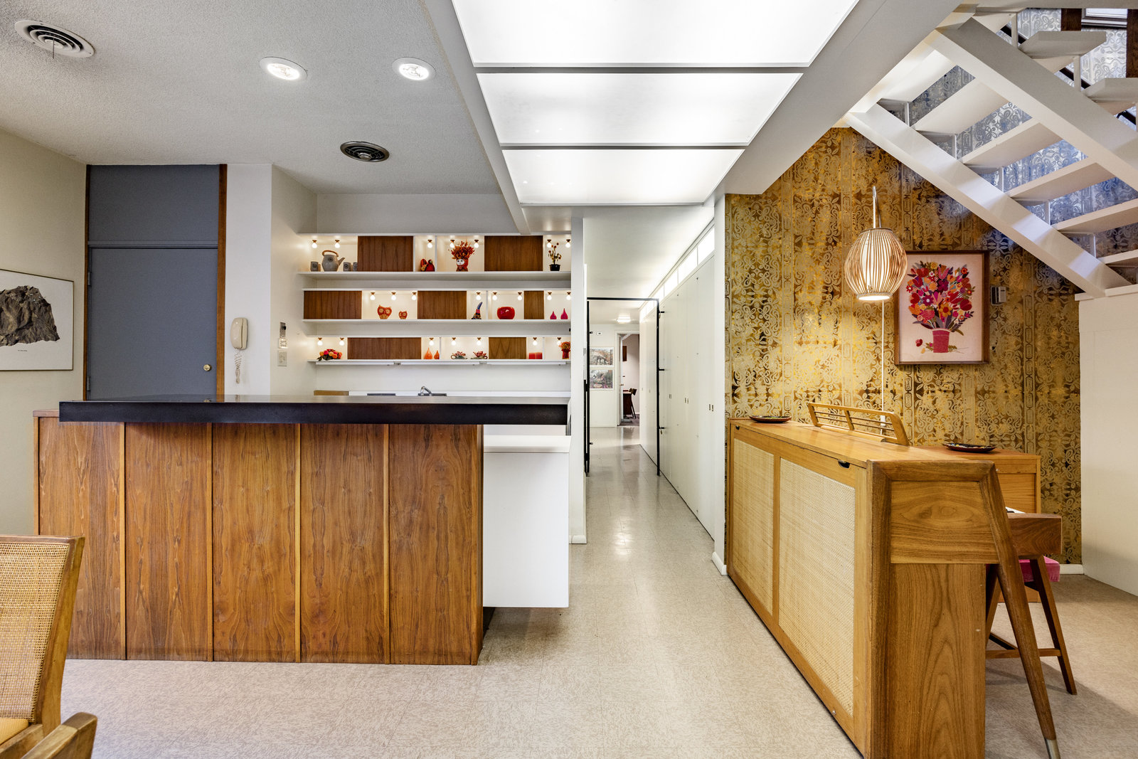 Intent on maximizing convenience, Frances ensured that the home included a main-floor laundry area, complete with a linen cabinet tucked neatly behind the washer and dryer—eliminating the need for trips downstairs. The kitchen is a model of mid-century efficiency, with custom cabinetry for china and linens, along with pull-out worktops at varying heights to accommodate any task. The floating staircase, a bold statement of the era, remains a beloved architectural centerpiece. The unique display window above the stairs offers a glimpse of the home's character, even from the street, teasing its blurred lines and angles. Downstairs, one bedroom includes an entire wall of integrated storage, while other rooms are equipped with built-in desks and drawers, all intended to maximize floor space. Frances enlisted her friend, Merline Leaming of Clark Leaming Design, to assist with the interior design. Together, they created a home that is as functional inside as it is beautiful. "There are 9,000 ways to do a room," Merline would say. "If you don’t like one, we’ll find another." Merline’s design expertise is evident throughout the home, including in the distinctive downstairs bar—a beloved feature for entertaining. Frances’s husband, meticulously planned and installed lighting throughout the house, ensuring every corner was beautifully illuminated and even wiring extra switches in anticipation of future needs.