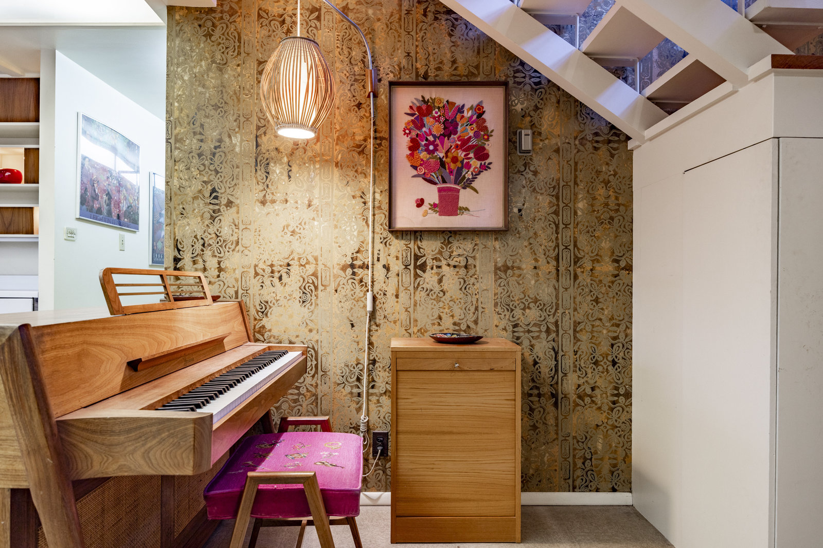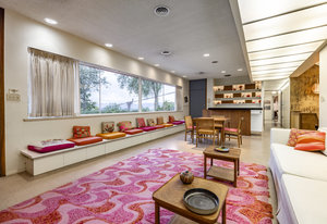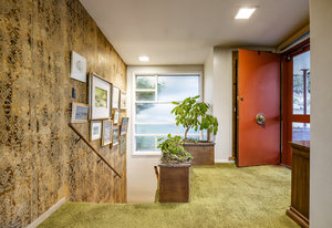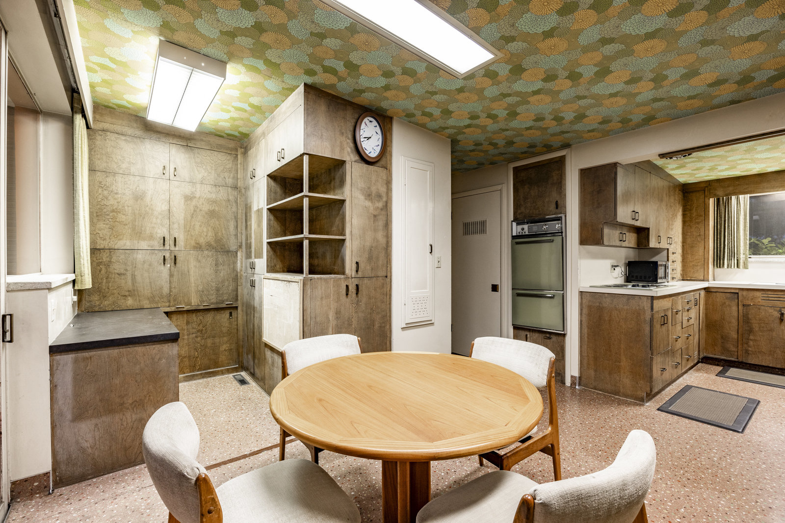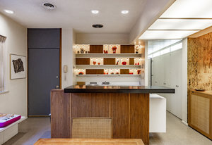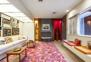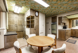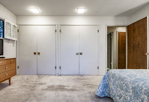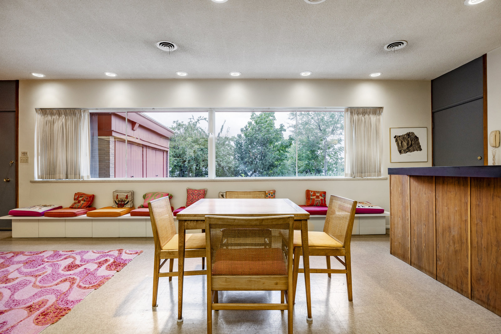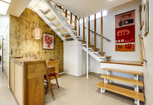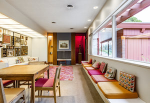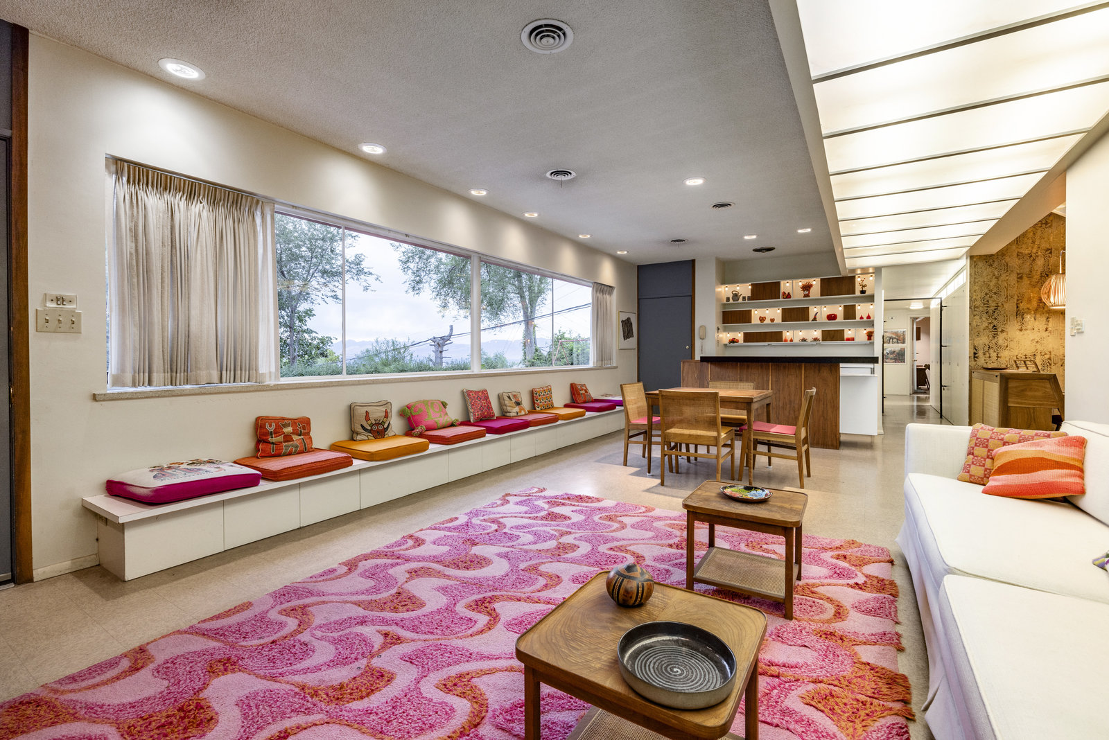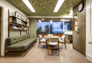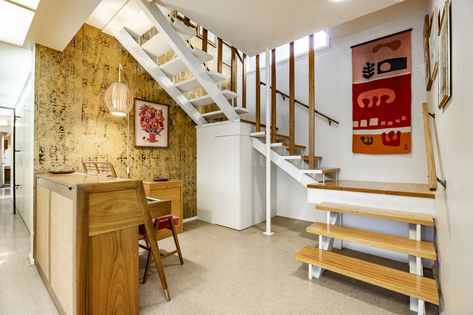 Intent on maximizing convenience, Frances ensured that the home included a main-floor laundry area, complete with a linen cabinet tucked neatly behind the washer and dryer—eliminating the need for trips downstairs. The kitchen is a model of mid-century efficiency, with custom cabinetry for china and linens, along with pull-out worktops at varying heights to accommodate any task. The floating staircase, a bold statement of the era, remains a beloved architectural centerpiece. The unique display window above the stairs offers a glimpse of the home's character, even from the street, teasing its blurred lines and angles. Downstairs, one bedroom includes an entire wall of integrated storage, while other rooms are equipped with built-in desks and drawers, all intended to maximize floor space. Frances enlisted her friend, Merline Leaming of Clark Leaming Design, to assist with the interior design. Together, they created a home that is as functional inside as it is beautiful. "There are 9,000 ways to do a room," Merline would say. "If you don’t like one, we’ll find another." Merline’s design expertise is evident throughout the home, including in the distinctive downstairs bar—a beloved feature for entertaining. Frances’s husband, meticulously planned and installed lighting throughout the house, ensuring every corner was beautifully illuminated and even wiring extra switches in anticipation of future needs.