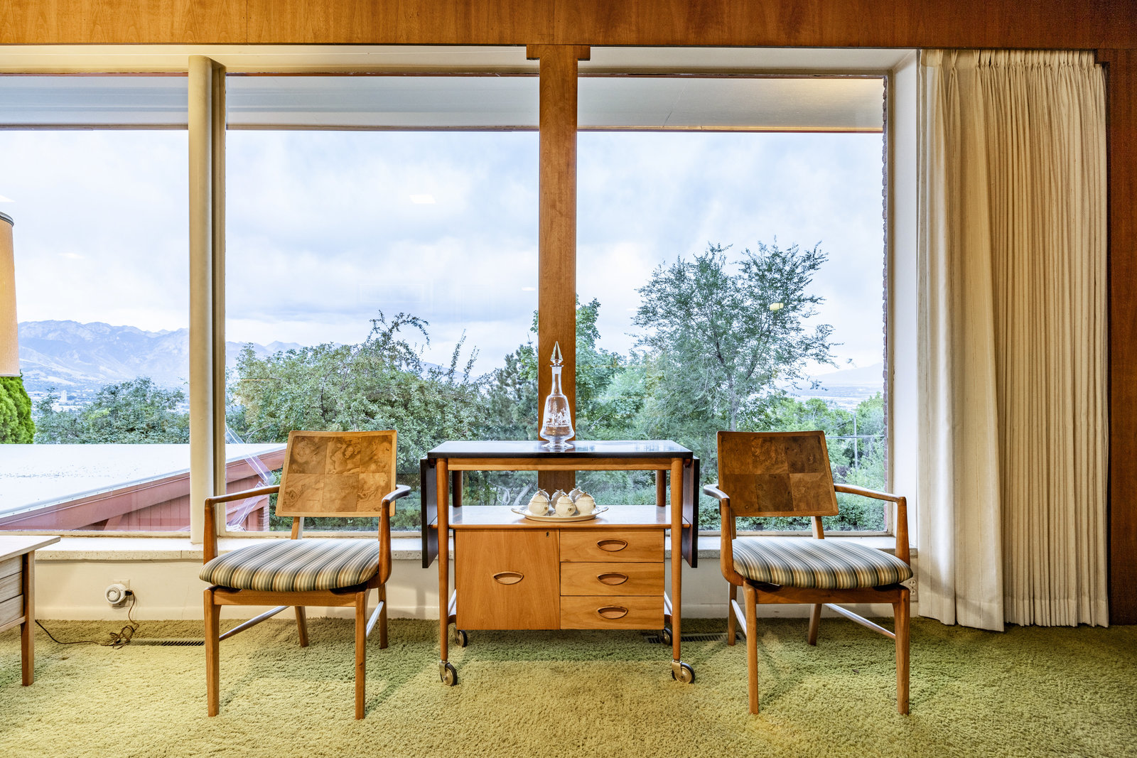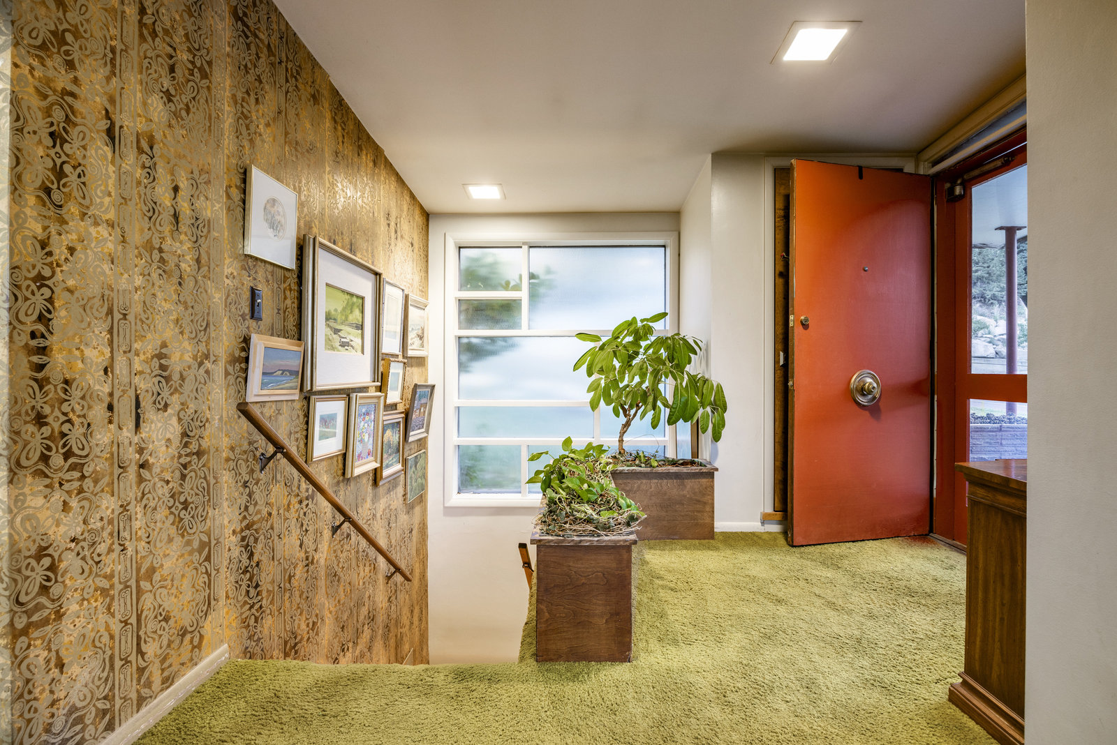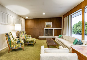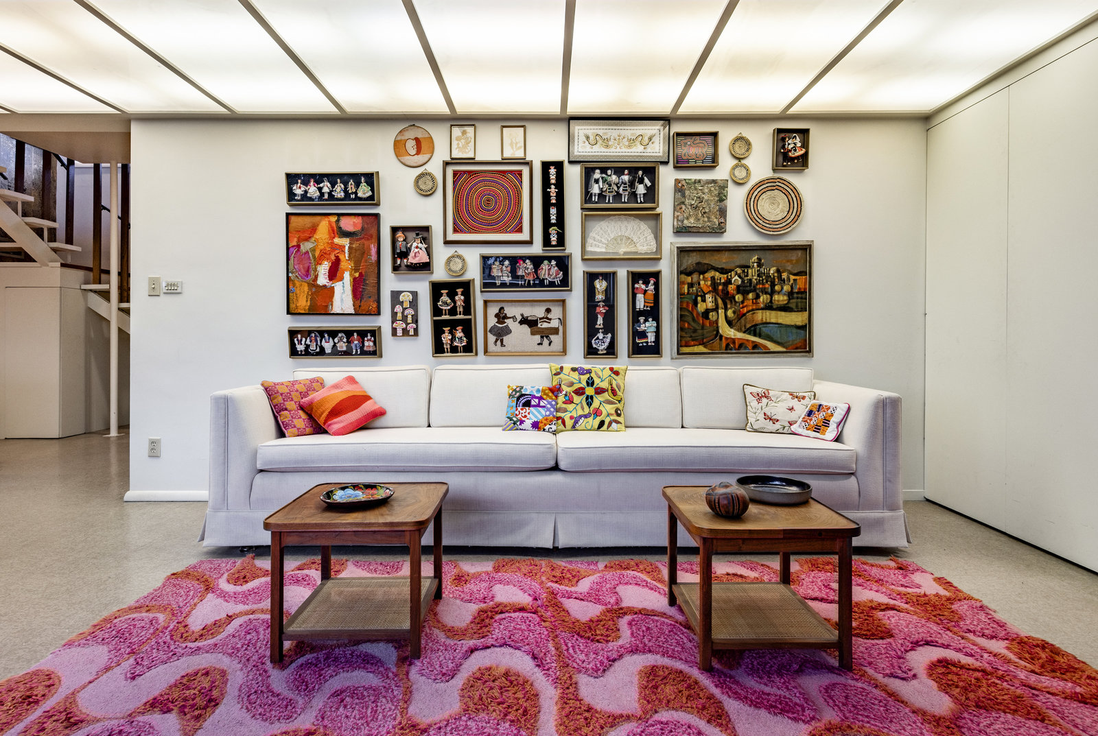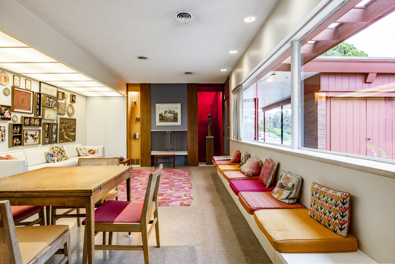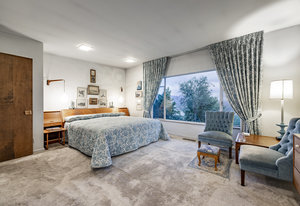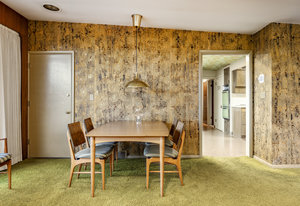 Intent on maximizing convenience, Frances ensured that the home included a main-floor laundry area, complete with a linen cabinet tucked neatly behind the washer and dryer—eliminating the need for trips downstairs. The kitchen is a model of mid-century efficiency, with custom cabinetry for china and linens, along with pull-out worktops at varying heights to accommodate any task. The floating staircase, a bold statement of the era, remains a beloved architectural centerpiece. The unique display window above the stairs offers a glimpse of the home's character, even from the street, teasing its blurred lines and angles. Downstairs, one bedroom includes an entire wall of integrated storage, while other rooms are equipped with built-in desks and drawers, all intended to maximize floor space. Frances enlisted her friend, Merline Leaming of Clark Leaming Design, to assist with the interior design. Together, they created a home that is as functional inside as it is beautiful. "There are 9,000 ways to do a room," Merline would say. "If you don’t like one, we’ll find another." Merline’s design expertise is evident throughout the home, including in the distinctive downstairs bar—a beloved feature for entertaining. Frances’s husband, meticulously planned and installed lighting throughout the house, ensuring every corner was beautifully illuminated and even wiring extra switches in anticipation of future needs.
