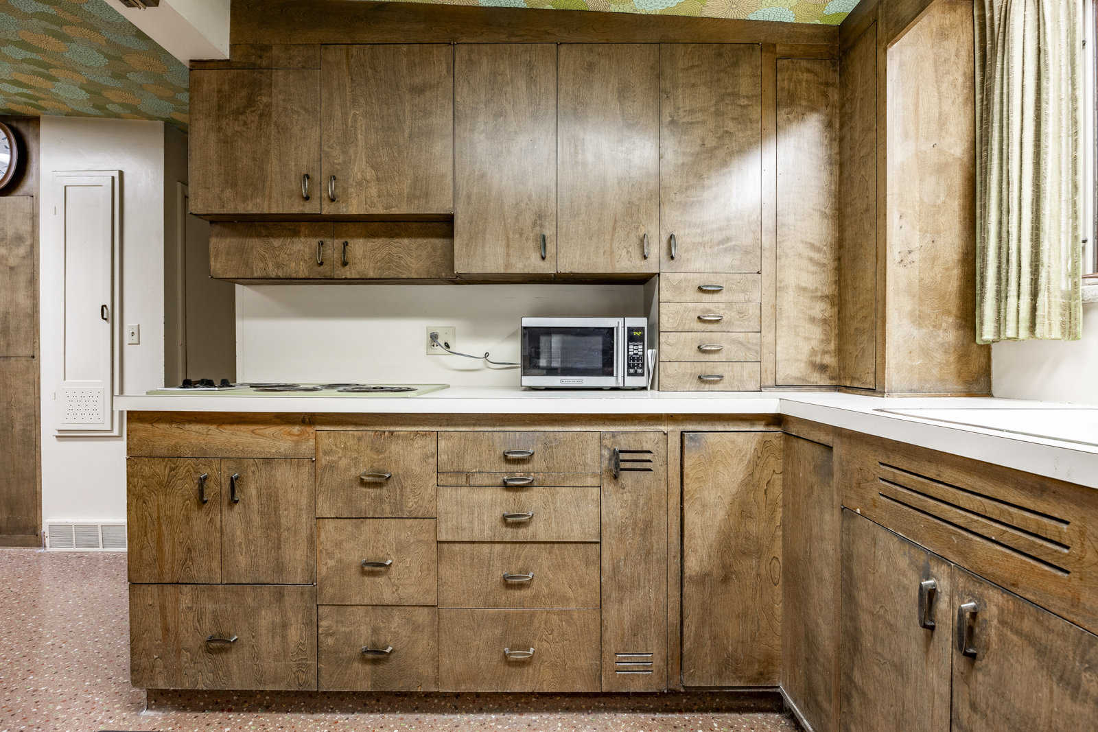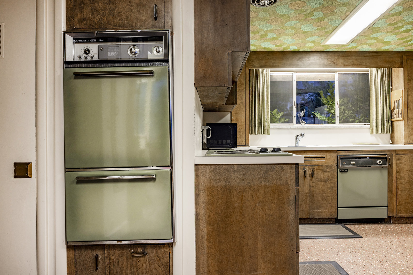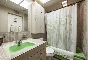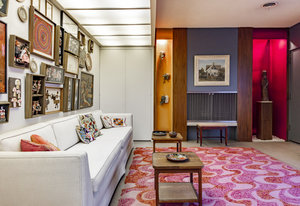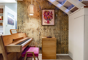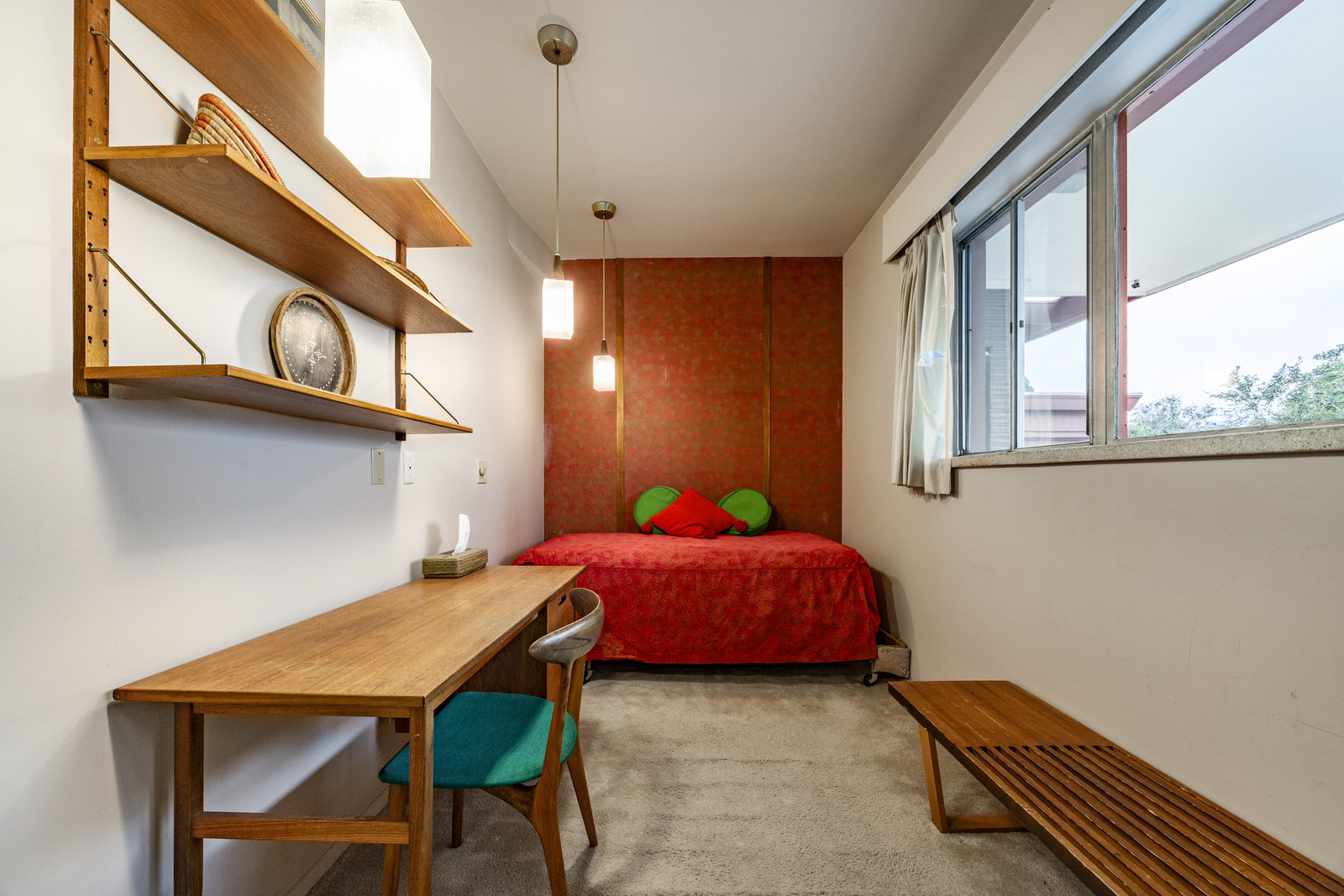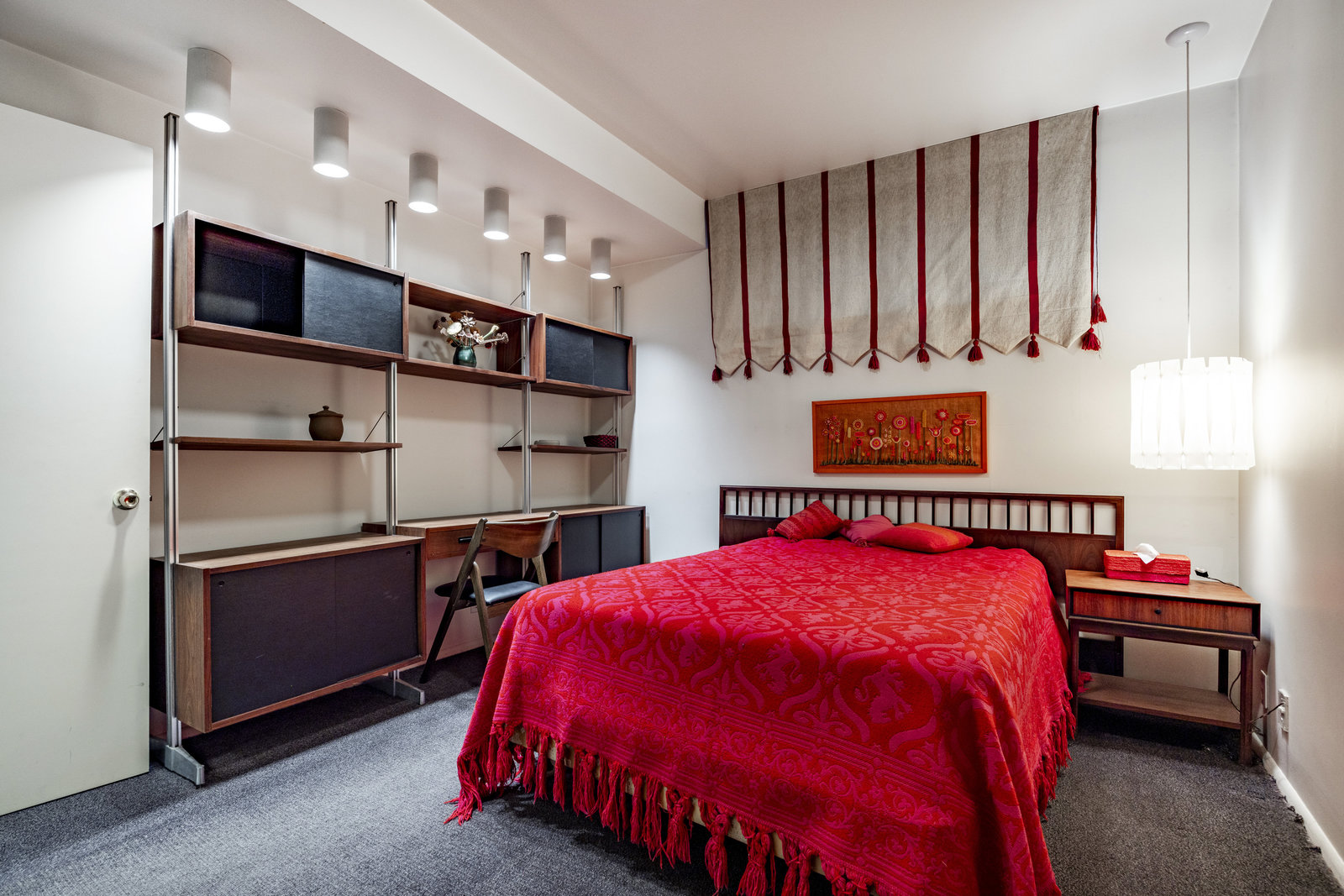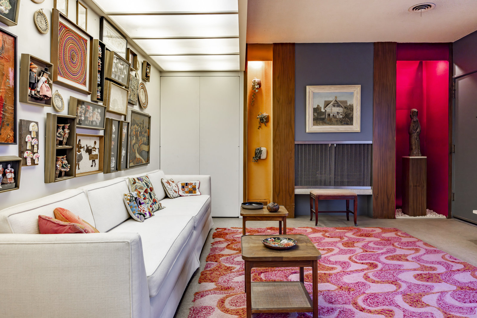 Intent on maximizing convenience, Frances ensured that the home included a main-floor laundry area, complete with a linen cabinet tucked neatly behind the washer and dryer—eliminating the need for trips downstairs. The kitchen is a model of mid-century efficiency, with custom cabinetry for china and linens, along with pull-out worktops at varying heights to accommodate any task. The floating staircase, a bold statement of the era, remains a beloved architectural centerpiece. The unique display window above the stairs offers a glimpse of the home's character, even from the street, teasing its blurred lines and angles. Downstairs, one bedroom includes an entire wall of integrated storage, while other rooms are equipped with built-in desks and drawers, all intended to maximize floor space. Frances enlisted her friend, Merline Leaming of Clark Leaming Design, to assist with the interior design. Together, they created a home that is as functional inside as it is beautiful. "There are 9,000 ways to do a room," Merline would say. "If you don’t like one, we’ll find another." Merline’s design expertise is evident throughout the home, including in the distinctive downstairs bar—a beloved feature for entertaining. Frances’s husband, meticulously planned and installed lighting throughout the house, ensuring every corner was beautifully illuminated and even wiring extra switches in anticipation of future needs.