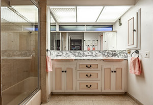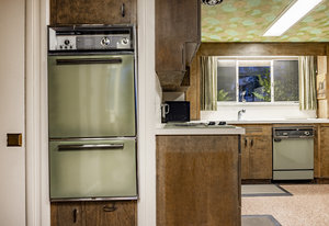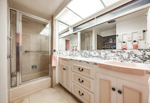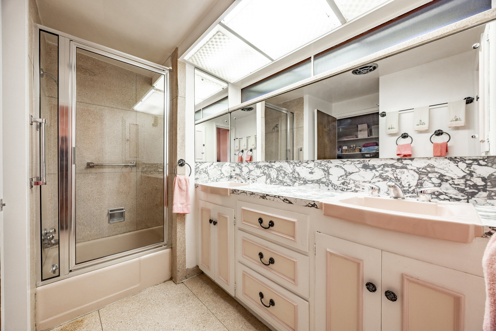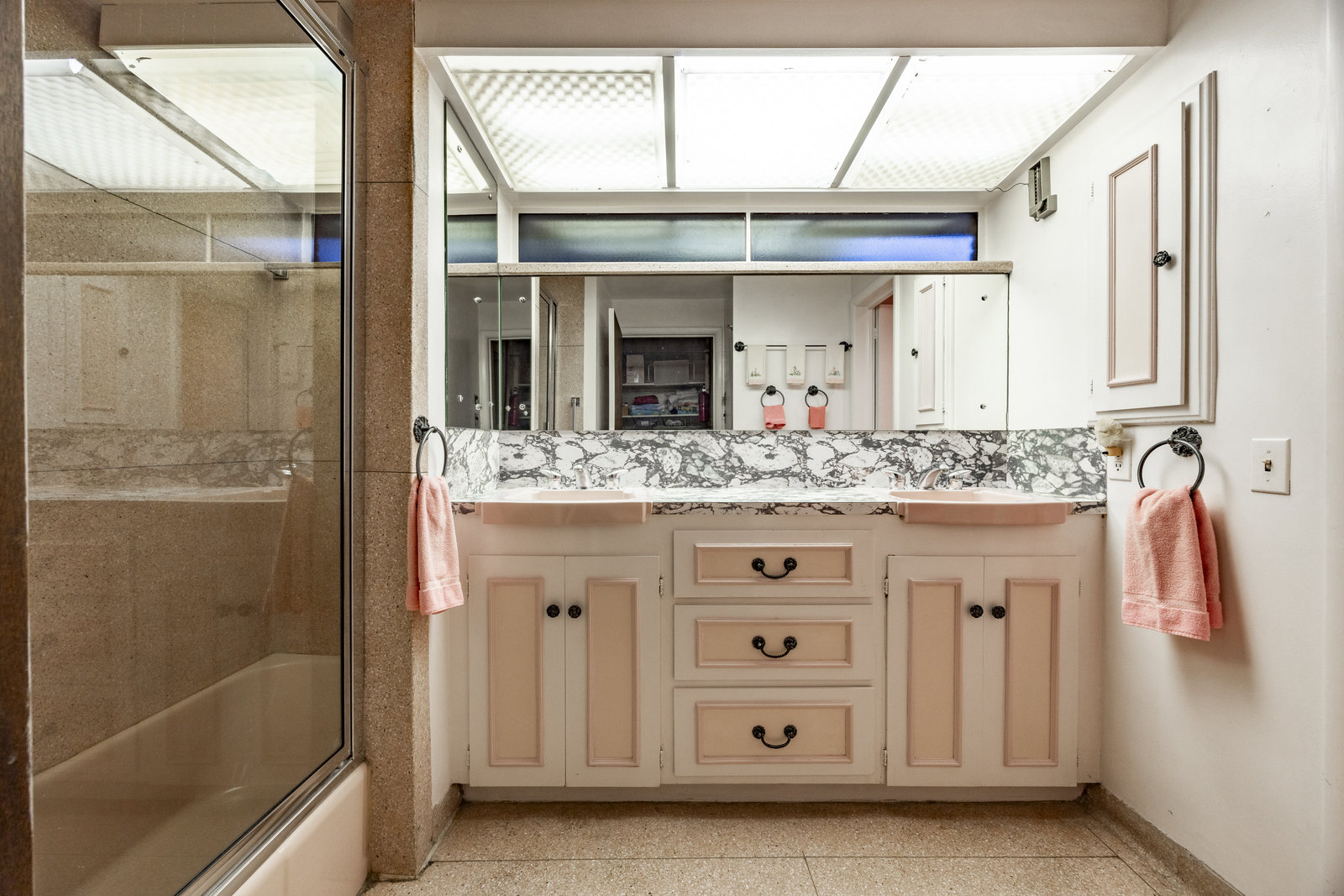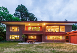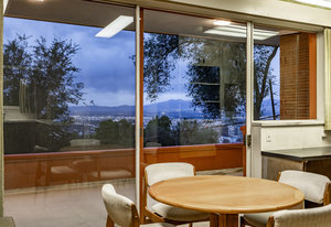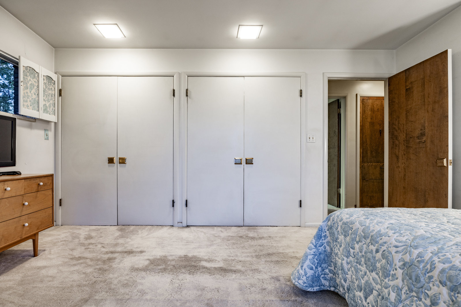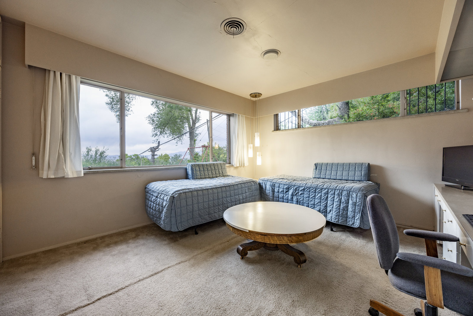 Intent on maximizing convenience, Frances ensured that the home included a main-floor laundry area, complete with a linen cabinet tucked neatly behind the washer and dryer—eliminating the need for trips downstairs. The kitchen is a model of mid-century efficiency, with custom cabinetry for china and linens, along with pull-out worktops at varying heights to accommodate any task. The floating staircase, a bold statement of the era, remains a beloved architectural centerpiece. The unique display window above the stairs offers a glimpse of the home's character, even from the street, teasing its blurred lines and angles. Downstairs, one bedroom includes an entire wall of integrated storage, while other rooms are equipped with built-in desks and drawers, all intended to maximize floor space. Frances enlisted her friend, Merline Leaming of Clark Leaming Design, to assist with the interior design. Together, they created a home that is as functional inside as it is beautiful. "There are 9,000 ways to do a room," Merline would say. "If you don’t like one, we’ll find another." Merline’s design expertise is evident throughout the home, including in the distinctive downstairs bar—a beloved feature for entertaining. Frances’s husband, meticulously planned and installed lighting throughout the house, ensuring every corner was beautifully illuminated and even wiring extra switches in anticipation of future needs.