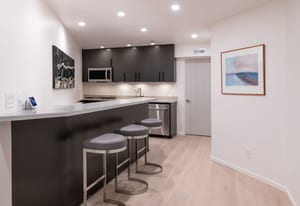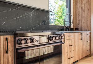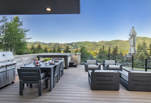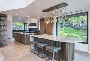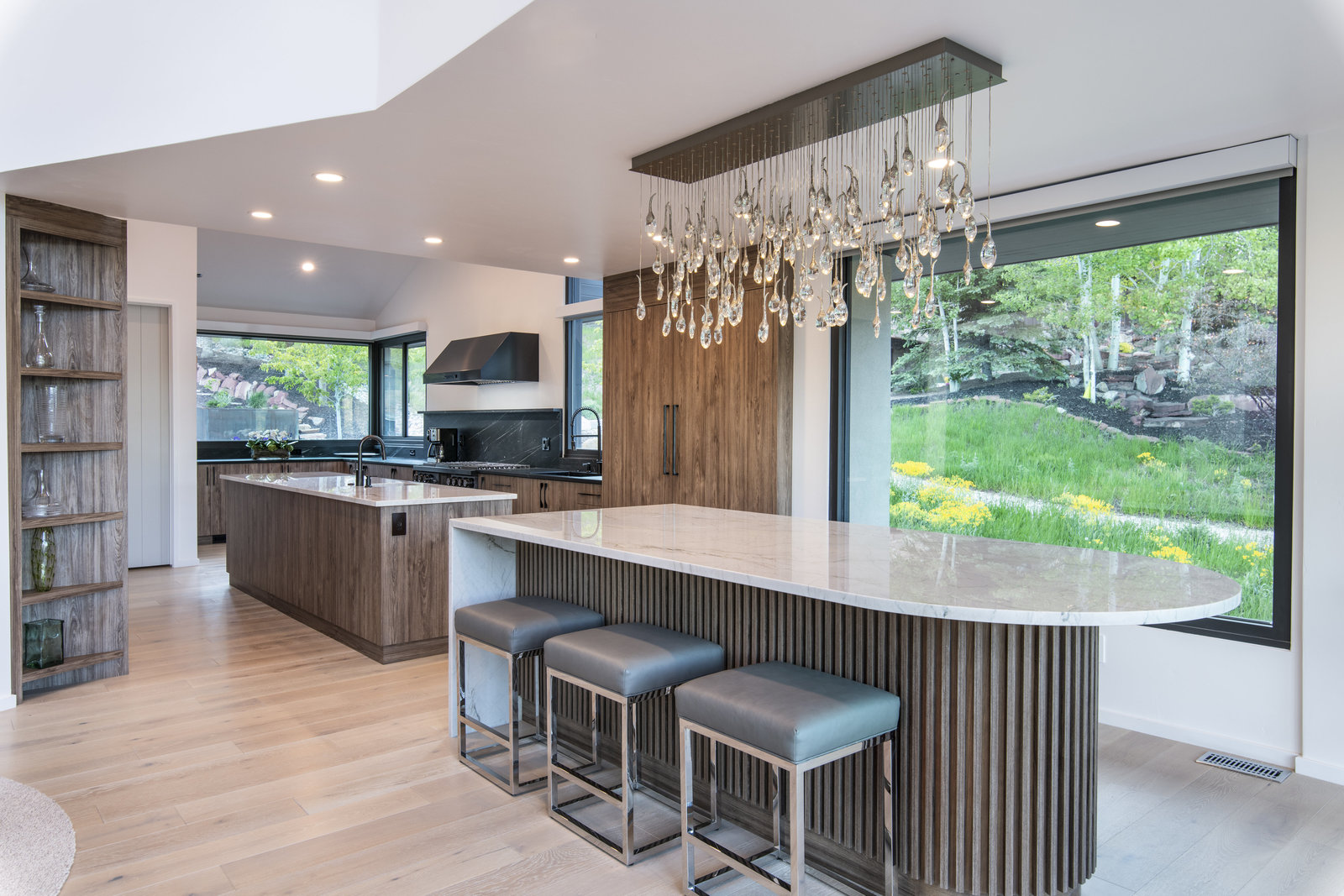 Just off the main living area, an open air alfresco dining and living space extends outdoors, with a hot tub positioned to take in unobstructed mountain and ski resort views across Park City's iconic terrain. The heart of the home is the chef's kitchen, designed to support both everyday living and larger gatherings. Two islands anchor the space, one dedicated to cooking and the other to dining, with a fluted quartzite waterfall island that comfortably seats ten.
