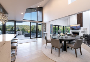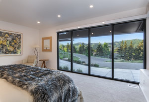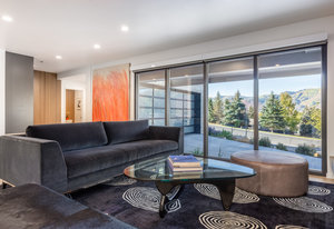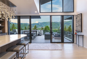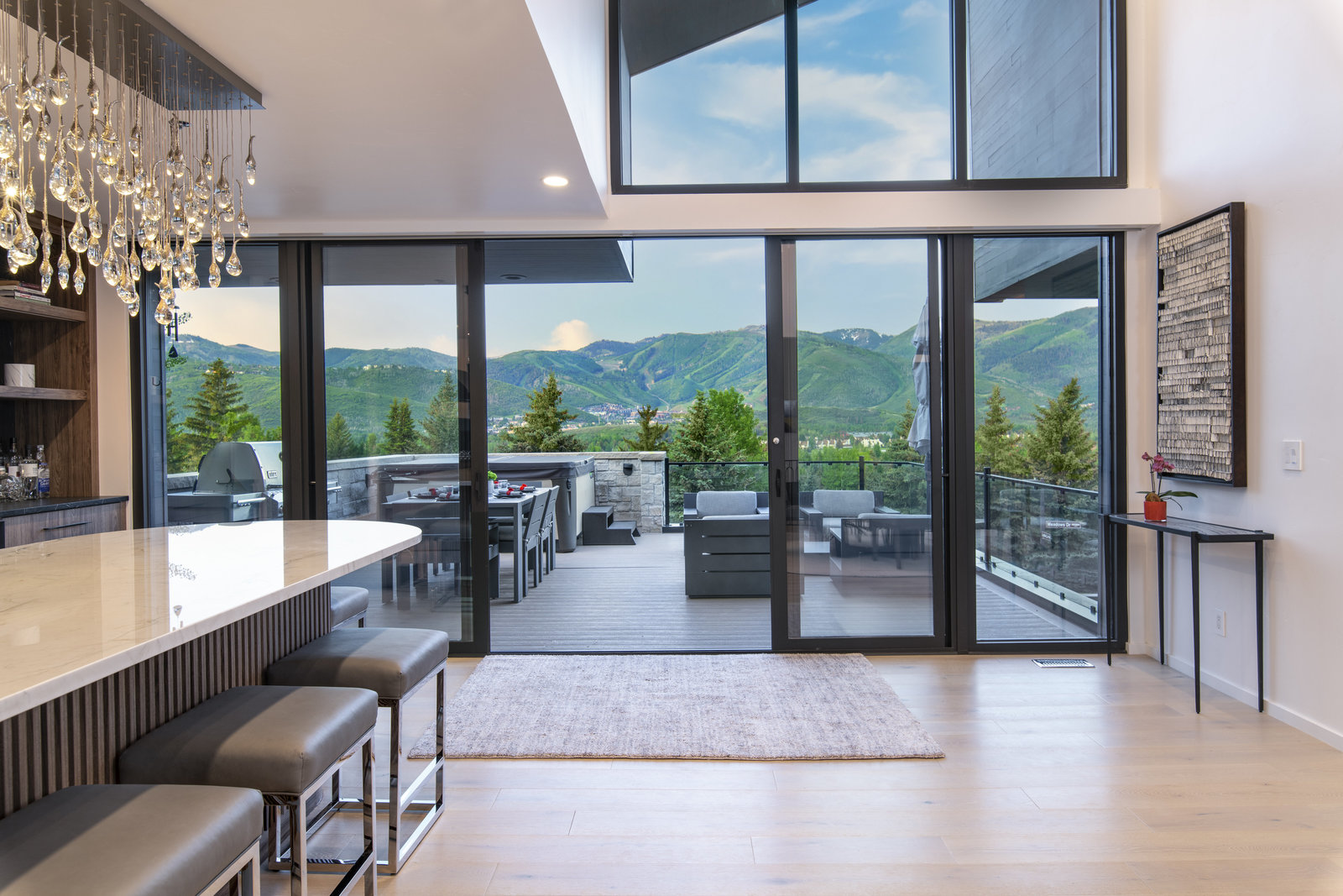Originally designed by Eduard Dreier, the residence was thoughtfully reimagined in 2021 and 2022 to honor its architectural roots while incorporating refined modern updates. Natural light moves intentionally through expansive glass and layered materials, creating interiors that feel grounded, warm, and timeless. The kitchen, dining, and great room flow seamlessly for gathering, framed by wide open, unobstructed ski resort views that span multiple Park City ridgelines.