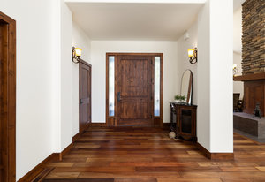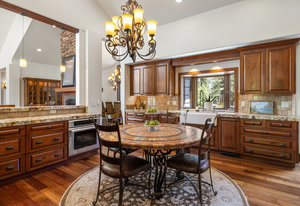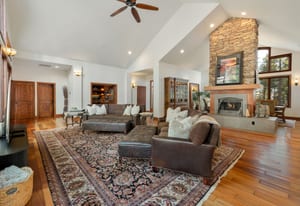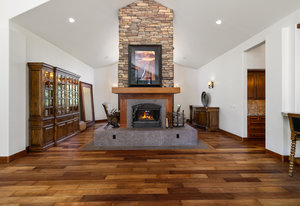 A grand entry welcomes you with soaring 22-foot cathedral ceilings and expansive windows that flood the home with natural light. Brazilian cherry solid hardwood floors run throughout, complemented by knotty alder doors and a dramatic double-sided stone wood-burning fireplace anchoring the great room open living and dining spaces. A brand-new Phillips Hue high-end lighting system, controlled by phone app with dimming for each space and color options, enhances the entire home.