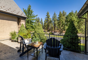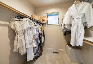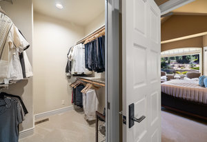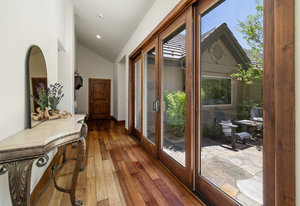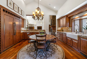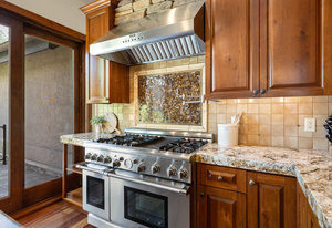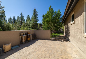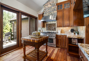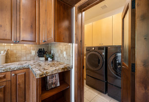At the heart of the residence, the entertainer’s European style dine-in kitchen features custom solid alder cabinetry with soft-close drawers, Rocky Mountain Hardware, granite countertops with a 2.5” drop-down edge, under-cabinet lighting, Shaws of Darwen 36” farmhouse sink, and a butcher block island. High-end appliances include a 48” Thermador Professional dual-fuel range with double ovens and pot filler, a 36” Thermador convection oven/microwave combo, Miele dishwasher, and a 30” Thermador Freedom refrigerator paired with a 30” Thermador Freedom freezer—with the majority of appliances custom-paneled in matching alder cabinetry for a sleek, hidden finish. Conveniently located off the kitchen, the laundry room features an LG front-loading electric washer and gas-powered dryer. A private patio just off the kitchen provides the perfect setting for sunrise coffee or evening grilling.