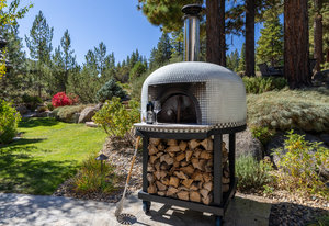 The backyard is a true private oasis with mature landscaping including fruit trees, herbs, and flowering plants, along with paver patios, new DG, LED lighting, and a wood-fired pizza oven. The rocky mountain quartzite stone patio off the great room offers built-in speakers and a TV mount, creating a seamless indoor-outdoor living experience with direct mountain views, an upper patio for dining, and a horseshoe pit. Additional exterior features include a dedicated dog run with paver access and doggy door adjacent to the garage, copper heated gutters with rooftop snow-stay technology, and a commercial-grade repaved U-shaped driveway with extra parking and turnaround.