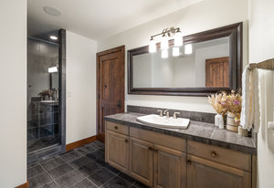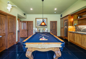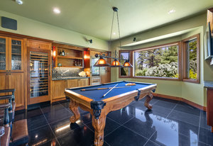 A versatile bonus room—currently used as a bar and media space—features custom mahogany cabinetry with Rocky Mountain Hardware, fossil marble countertops, two Sub-Zero wine and beverage refrigeration systems with storage for over 210 bottles of wine, wet bar with hand-hammered custom sink, and black granite flooring designed to complement the matching pool table. Behind-TV storage and an ensuite bath add exceptional flexibility—ideal for executive entertaining or après-ski gatherings.