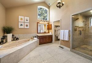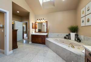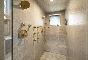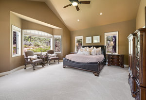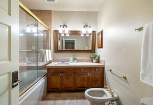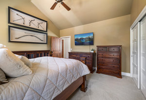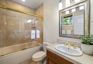 The primary suite serves as a private retreat with vaulted ceilings, gas fireplace, dual walk-in closets, and a spa-style bath featuring double vanities, bidet, and soft-close solid wood cabinetry. Each ensuite guest room is thoughtfully designed for privacy and comfort, including a junior suite with updated finishes and a bidet.
