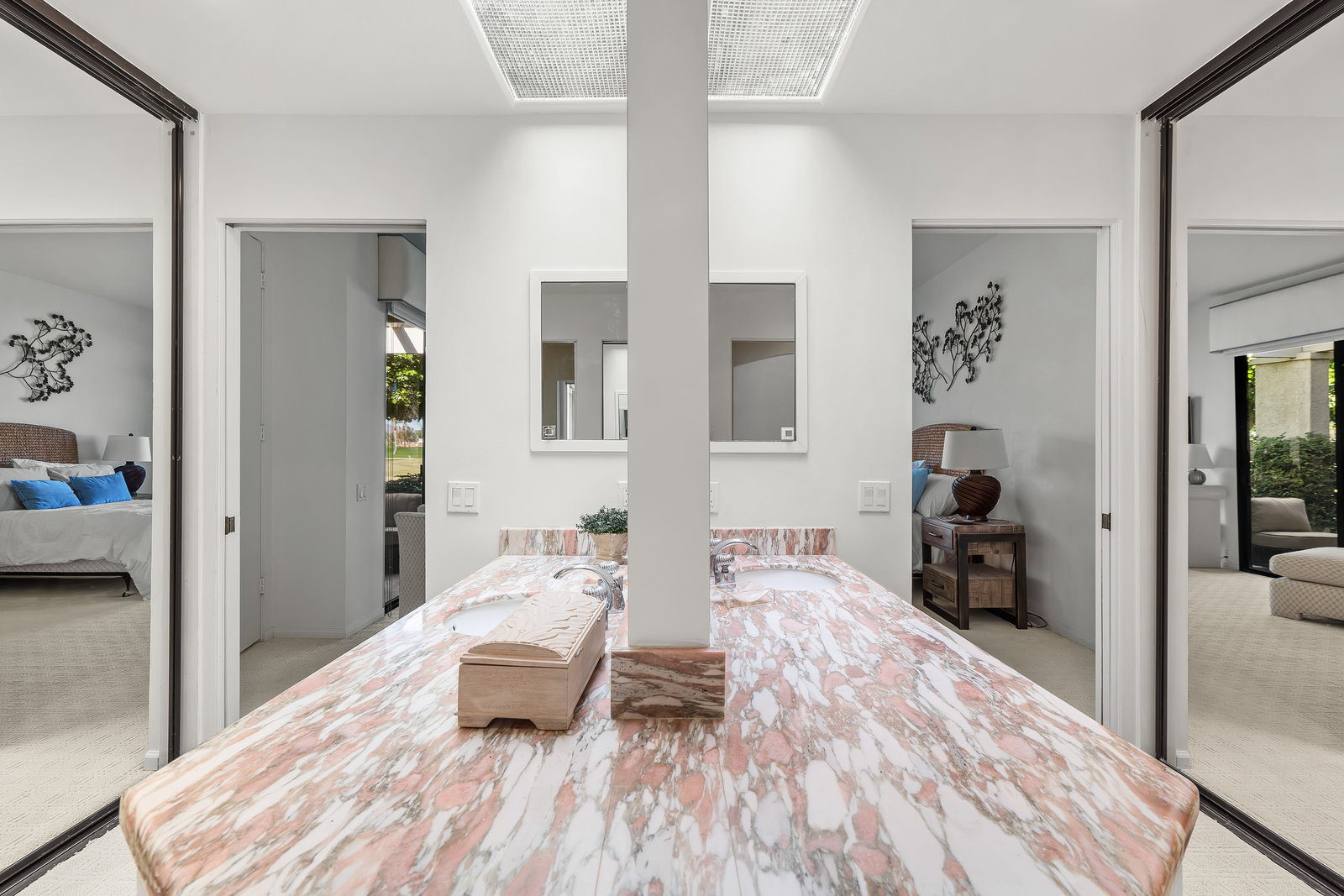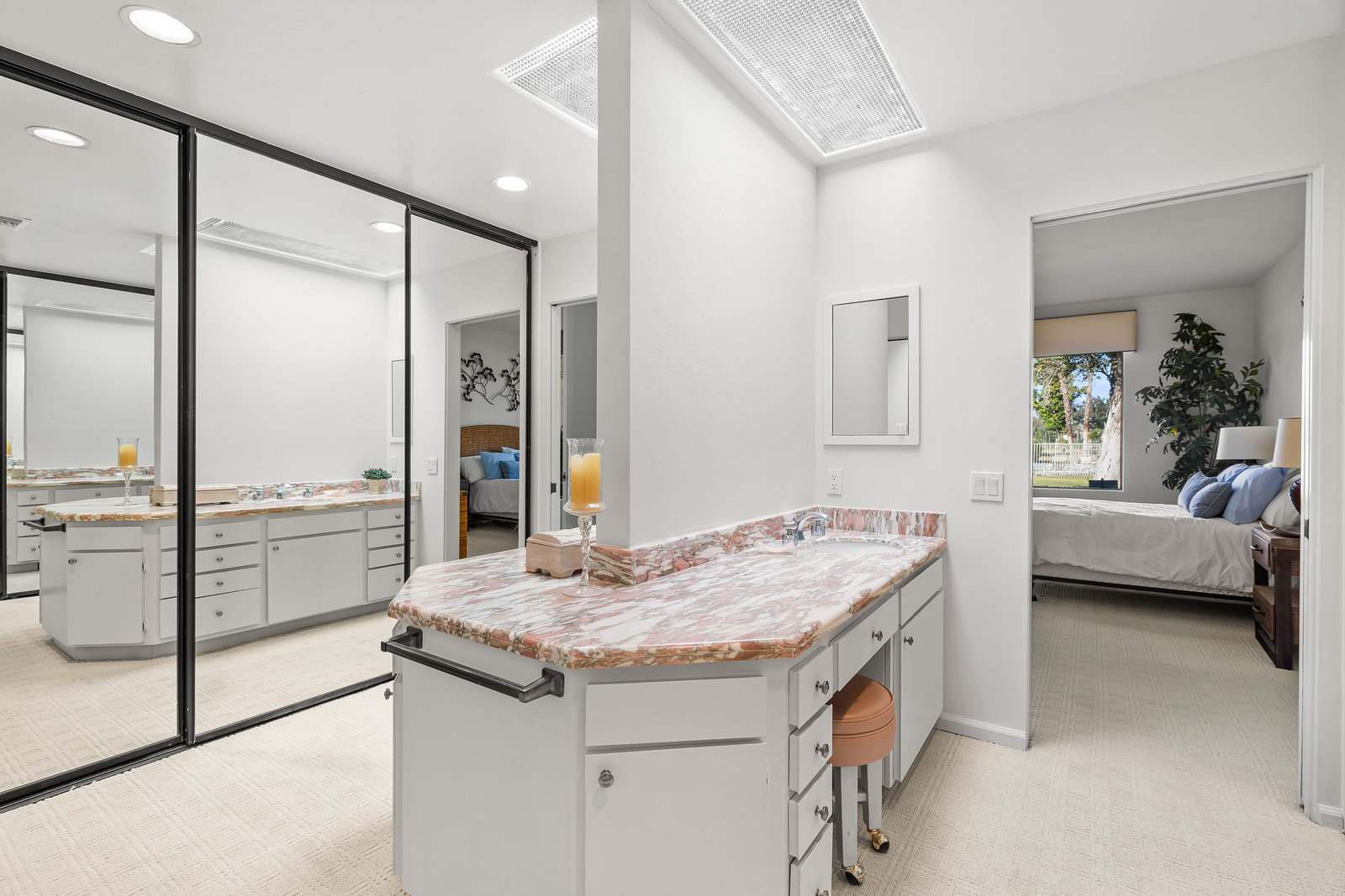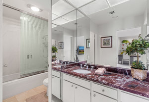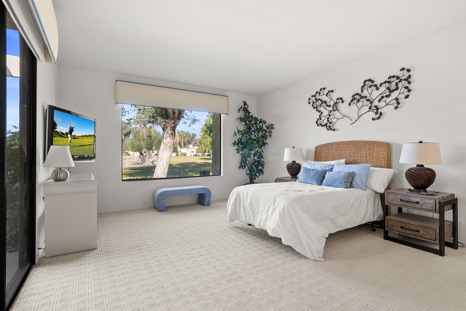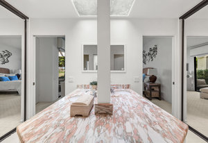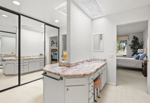 Tranquil living awaits while overlooking the famed Dinah Shore Tournament Course at Mission Hills Country Club, perhaps the most social club in the desert. Enjoy the views on an entertainer's back patio, just a stone's throw to a large community pool area. Featuring an ideal floor plan with well-sized areas and dramatic vaulted wood ceilings, this furnished residence is tucked off the road and very well-located near the amenities of Mission Hills Country Club residents. Notable attributes include: a spacious two-car plus golf cart garage; remodeled kitchen displaying quartz counters and vibrant backsplash with a bar and breakfast nook seating; three spacious bedrooms and three ...