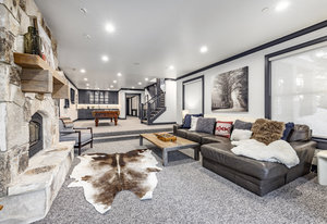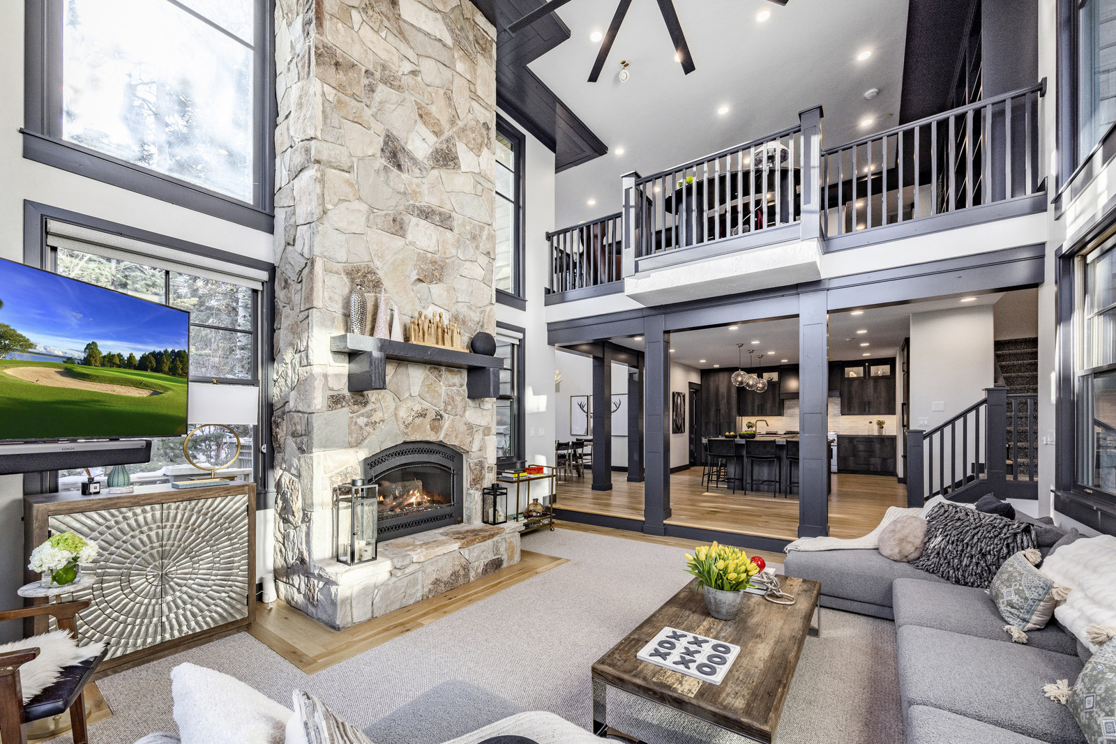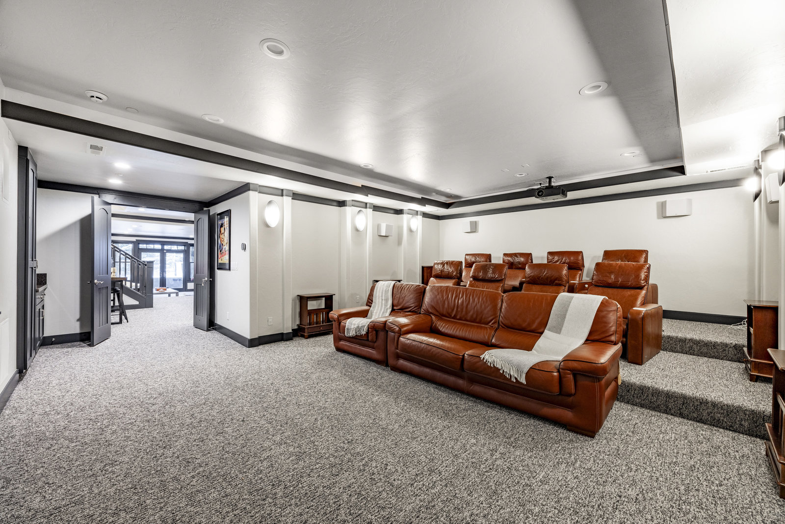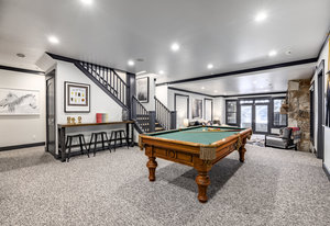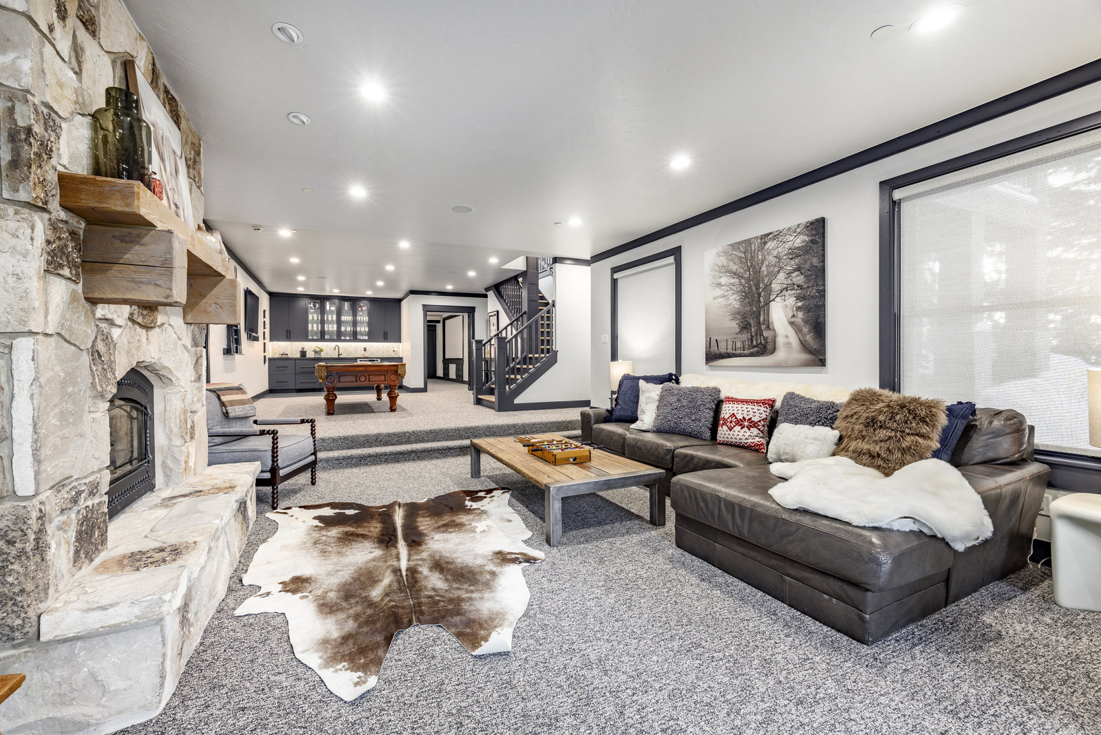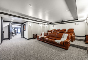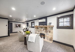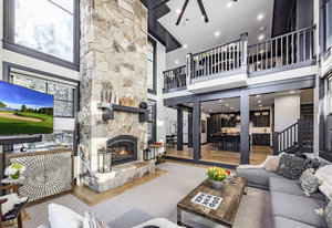 Upstairs, a bright landing with built-ins and an office nook leads to two private retreats: a spacious primary suite with a fireplace and seating area, and a guest bedroom with an ensuite bath. The lower level is designed for gathering, with a family room, wet bar, pool table, and a state-of-the-art movie theater. A covered patio with a hot tub, a spacious bunk room, and another ensuite guest bedroom complete the space. Five of the six bedrooms include ensuite bathrooms, three featuring luxurious stand-alone tubs. Generous decks and balconies offer easy indoor-outdoor living. Two laundry rooms, a three-car garage, and a heated driveway ensure comfort and convenience year-round.