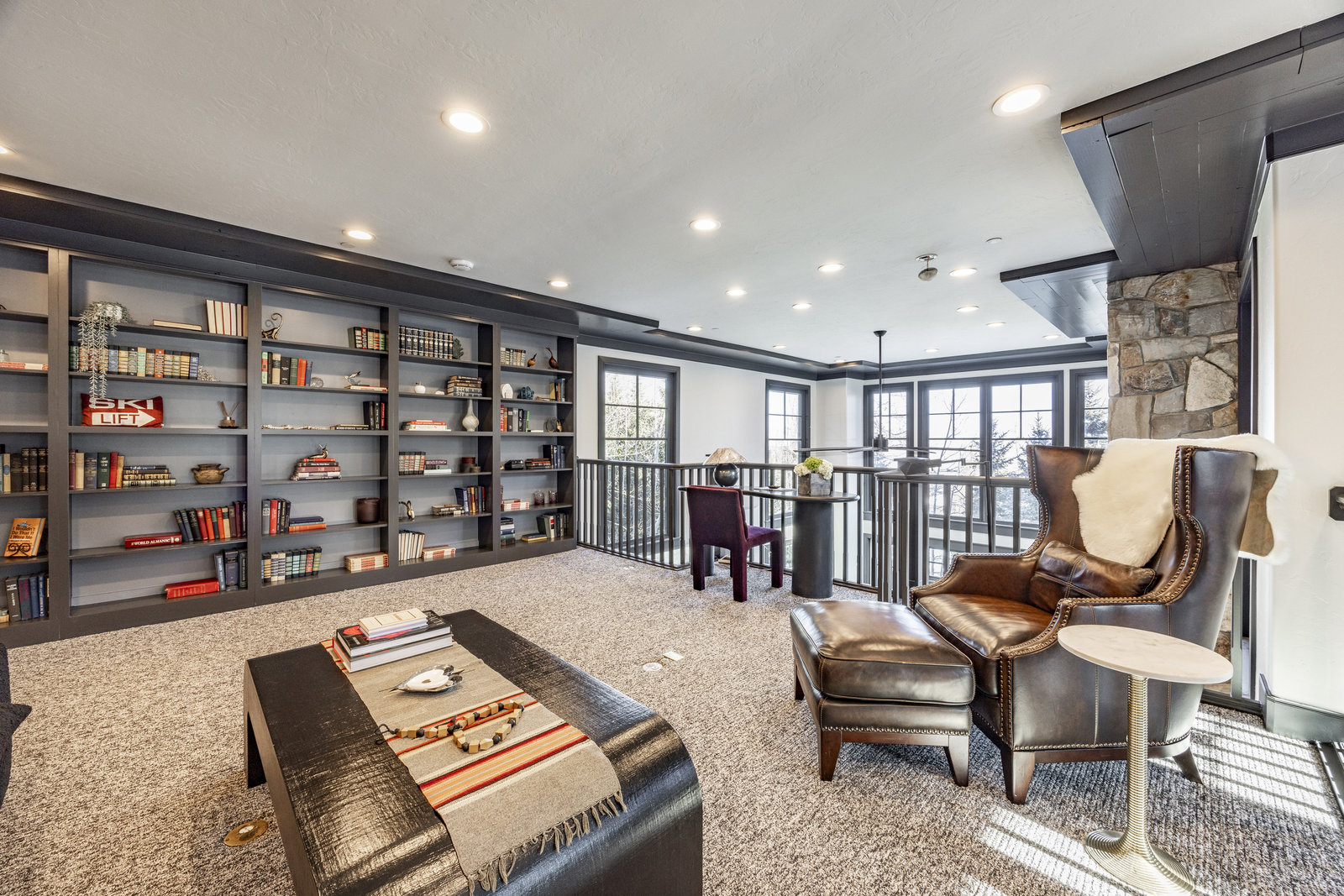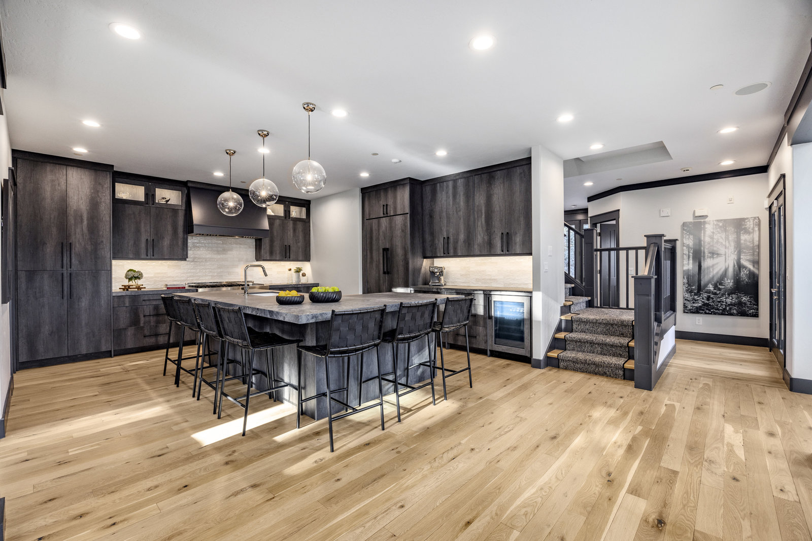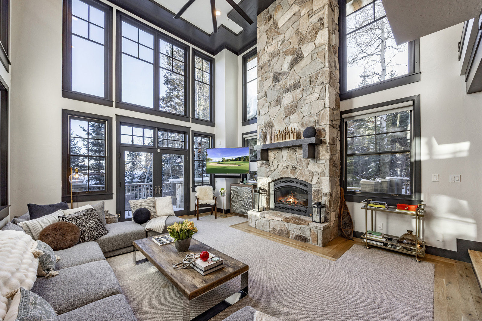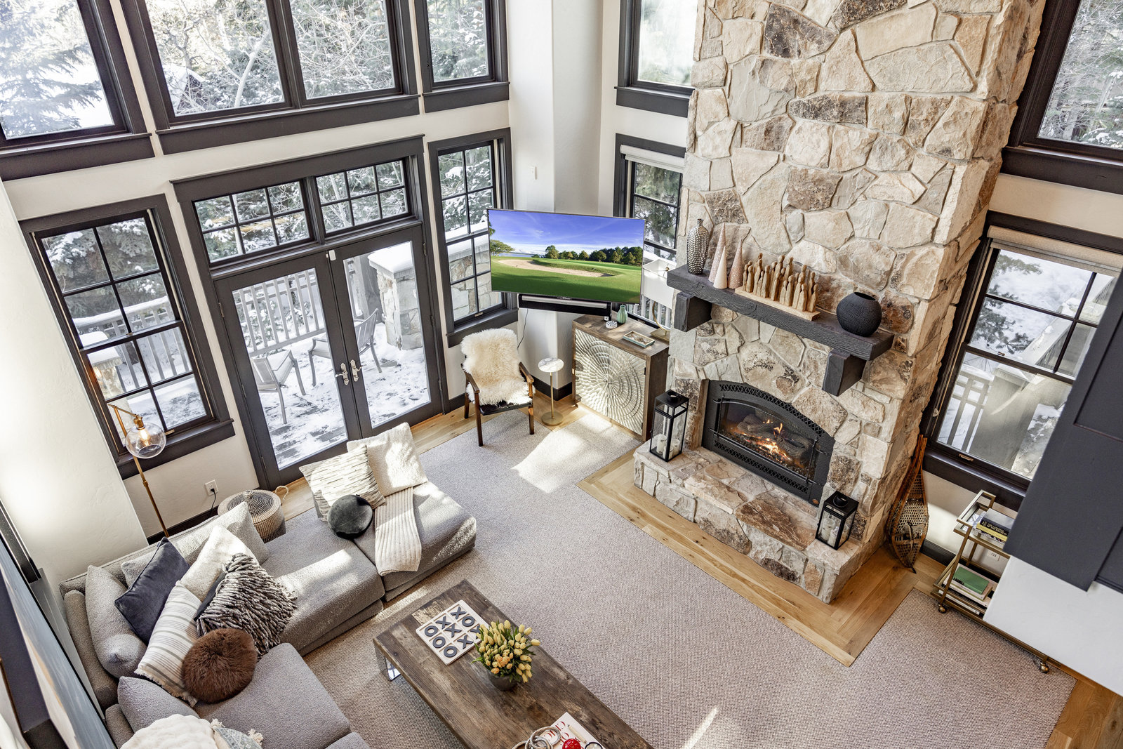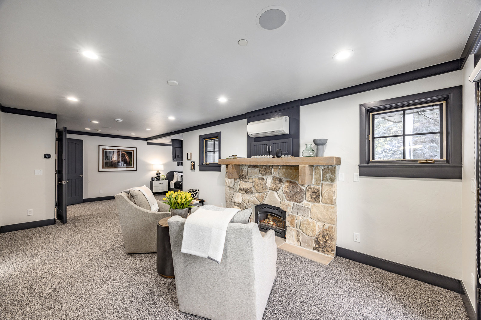 The main level is centered around an open living space featuring a striking stone fireplace, tall ceilings, and expansive windows. The dining area, with seating for eight, connects to a private patio surrounded by mature trees, while the fully remodeled chef’s kitchen includes state-of-the-art appliances, custom cabinetry, and a large island with seating for seven. A functional mudroom, guest suite with an ensuite bath, and an additional guest room with a nearby 3/4 bath complete this level.