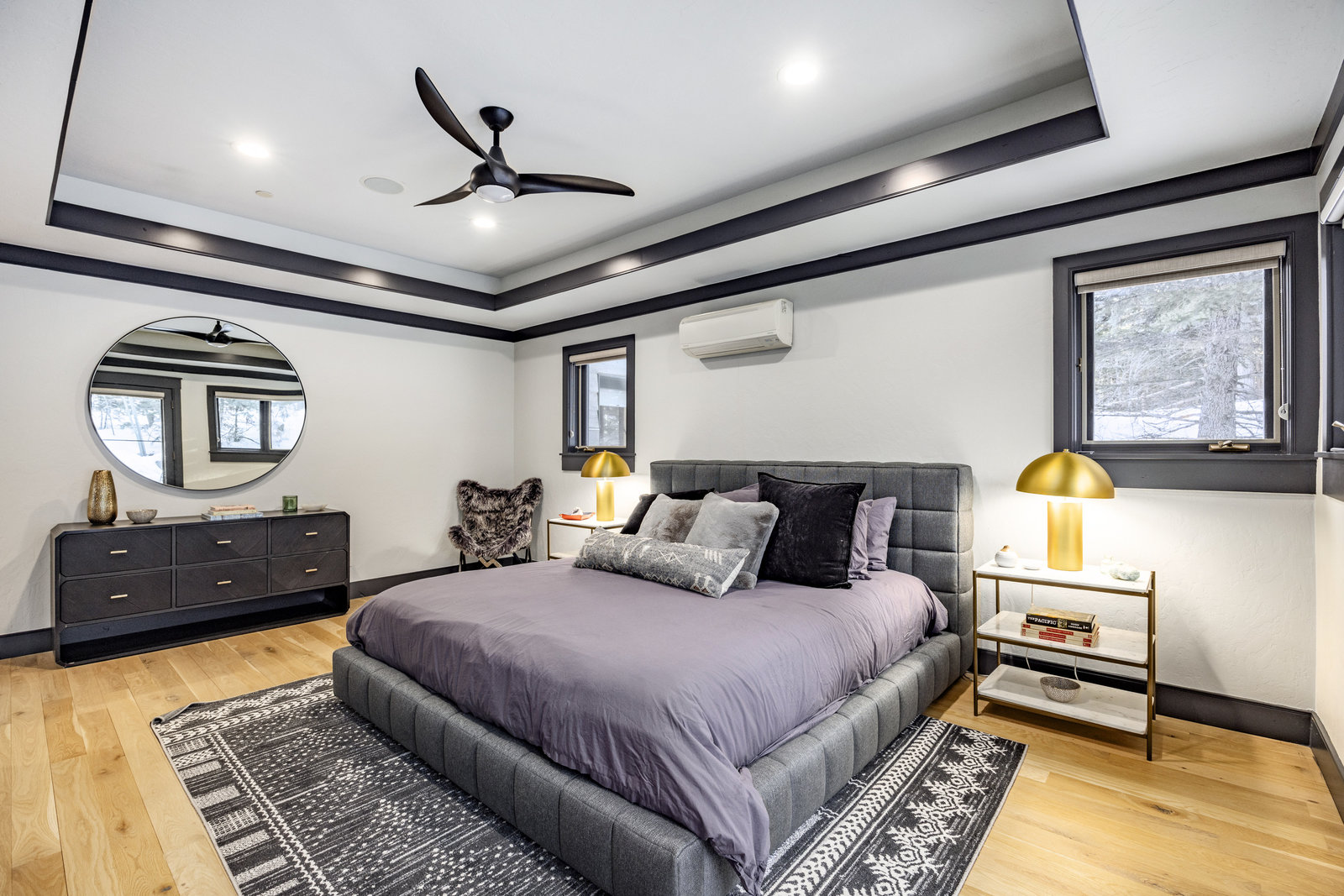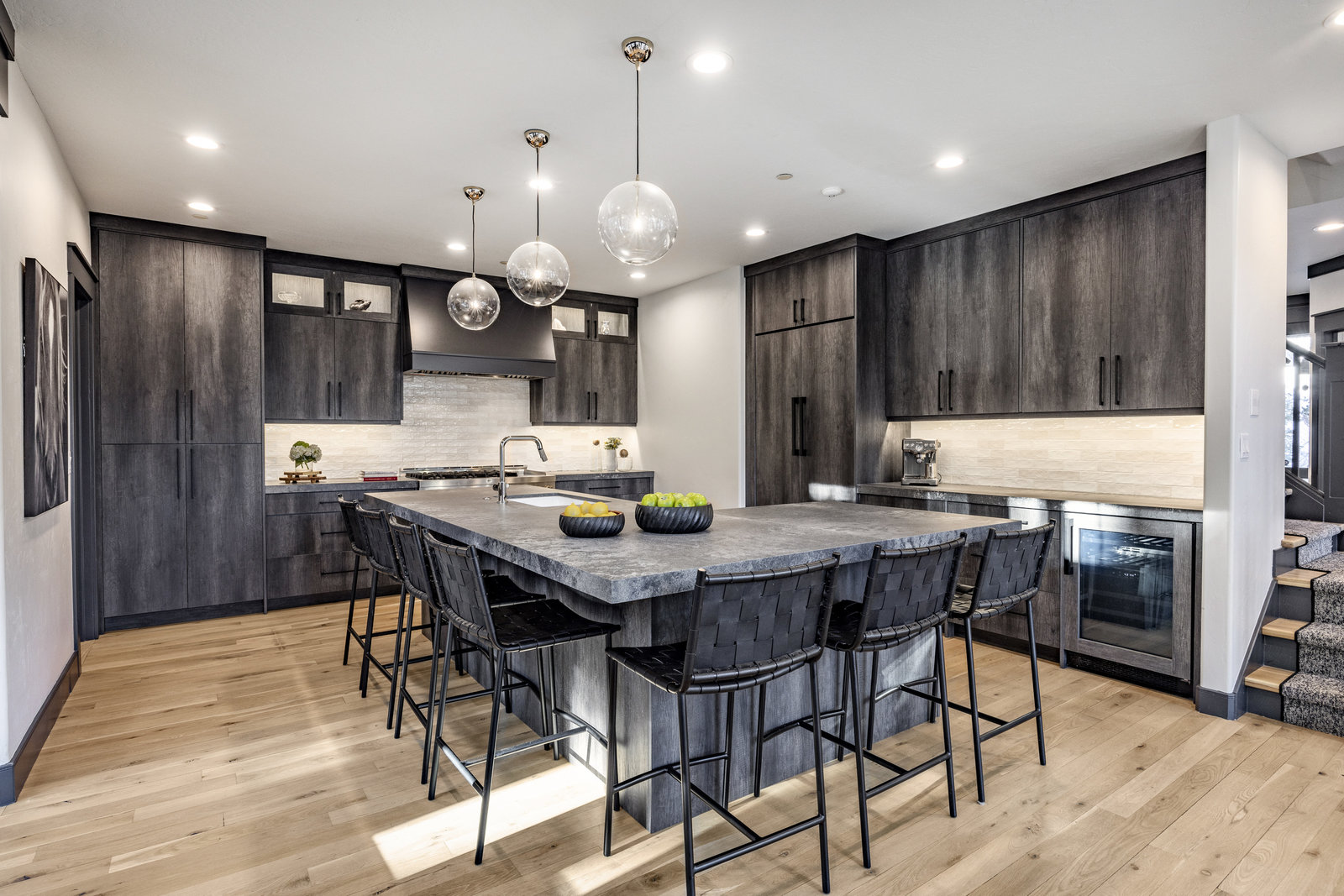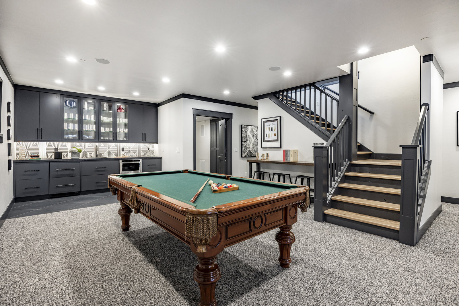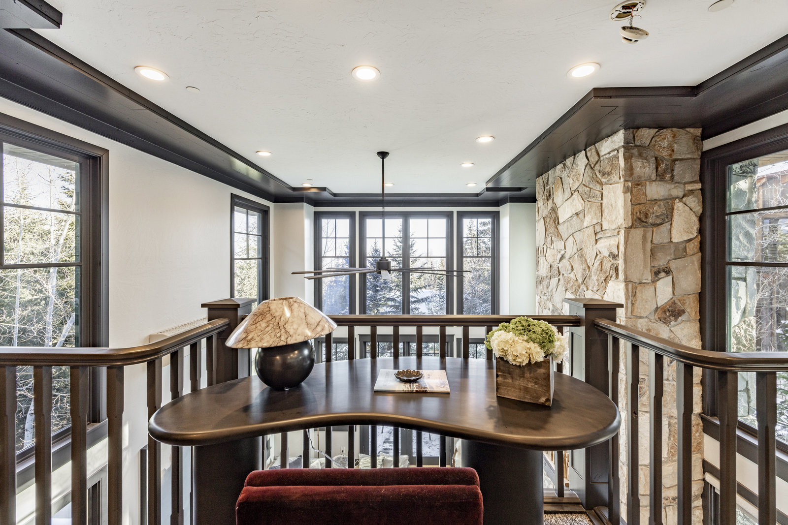 The main level is centered around an open living space featuring a striking stone fireplace, tall ceilings, and expansive windows. The dining area, with seating for eight, connects to a private patio surrounded by mature trees, while the fully remodeled chef’s kitchen includes state-of-the-art appliances, custom cabinetry, and a large island with seating for seven. A functional mudroom, guest suite with an ensuite bath, and an additional guest room with a nearby 3/4 bath complete this level.