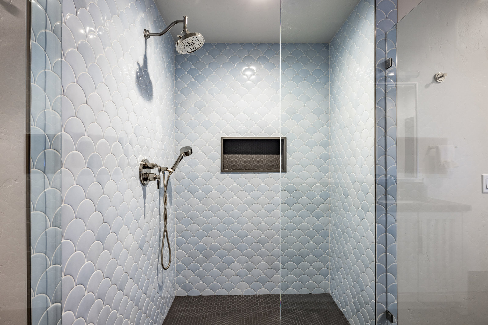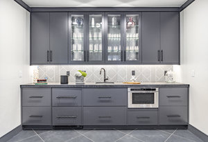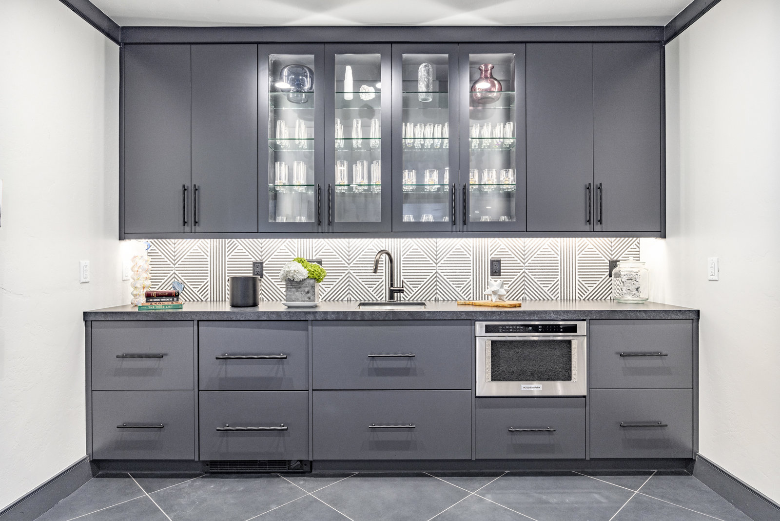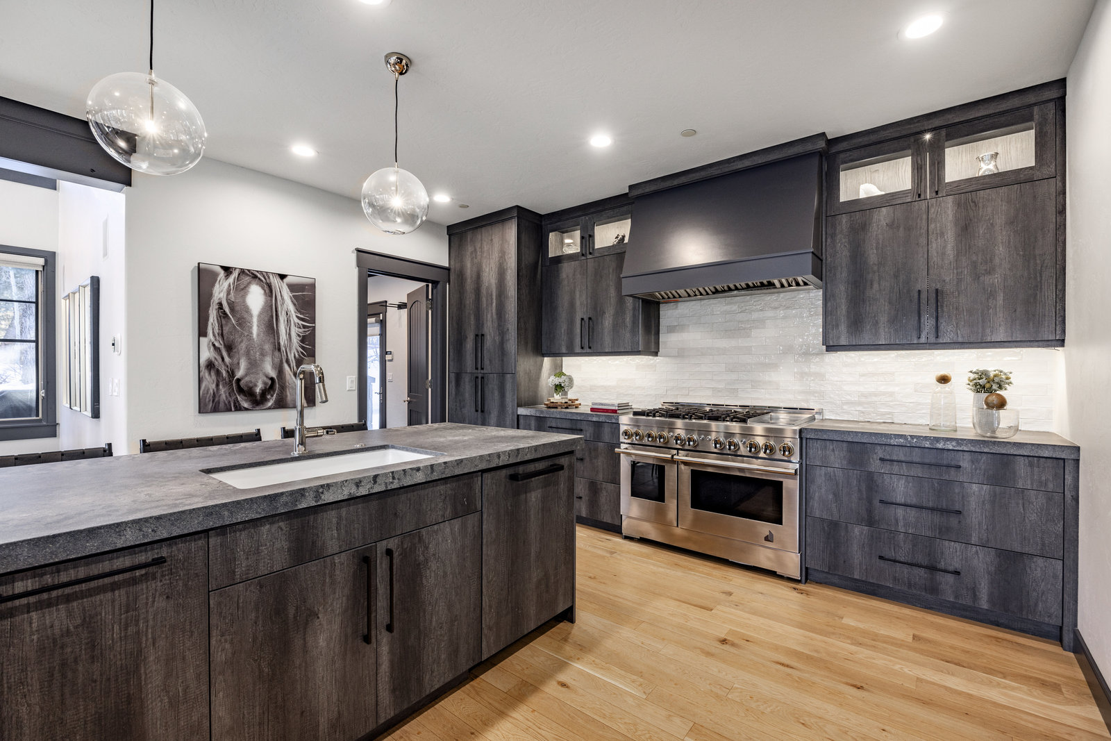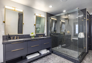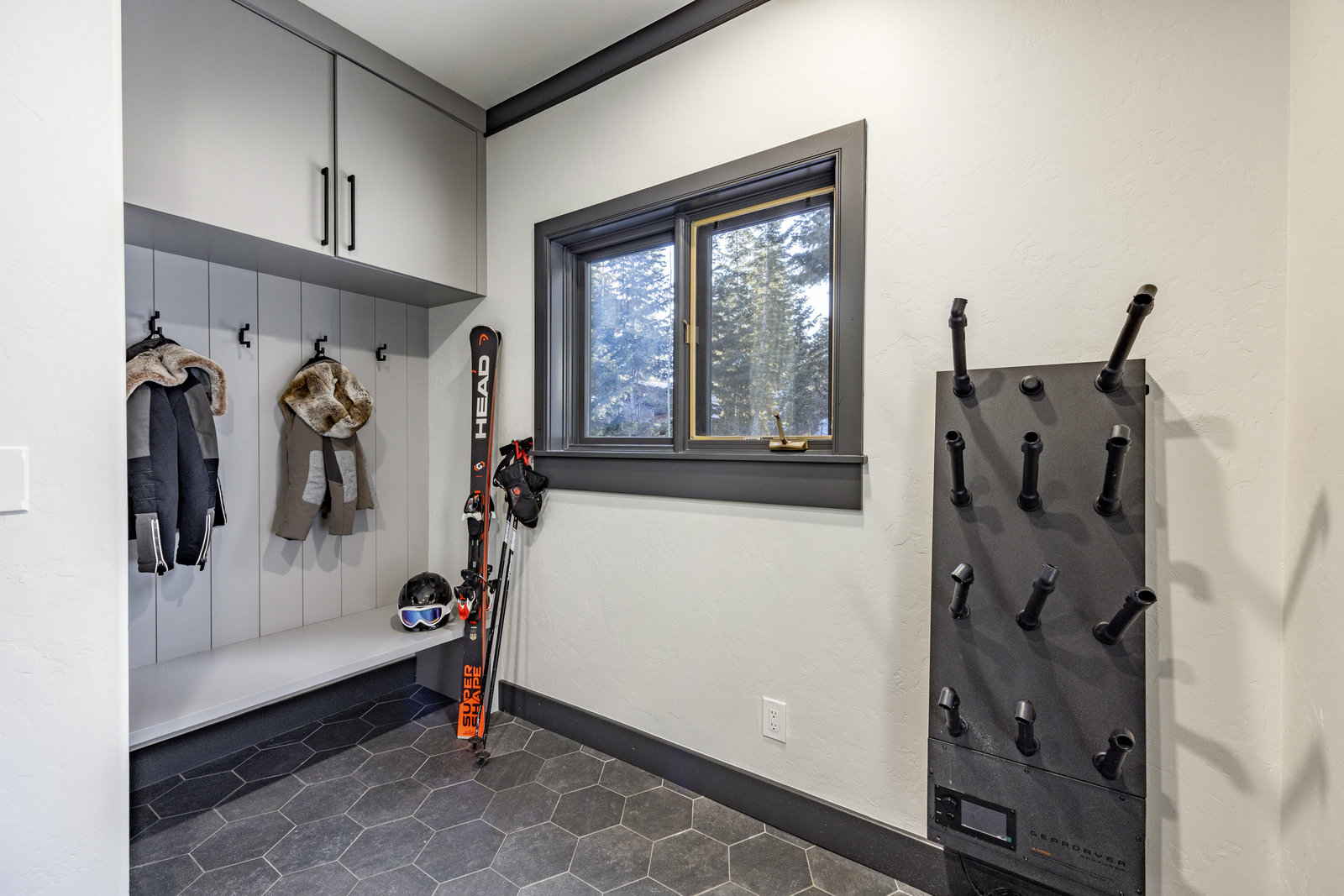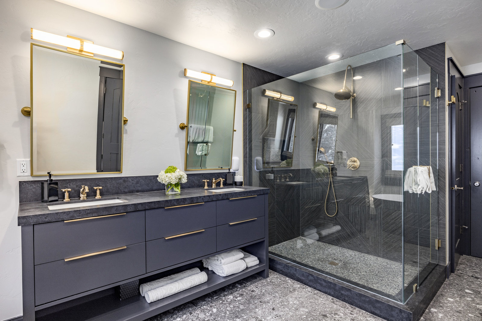 The main level is centered around an open living space featuring a striking stone fireplace, tall ceilings, and expansive windows. The dining area, with seating for eight, connects to a private patio surrounded by mature trees, while the fully remodeled chef’s kitchen includes state-of-the-art appliances, custom cabinetry, and a large island with seating for seven. A functional mudroom, guest suite with an ensuite bath, and an additional guest room with a nearby 3/4 bath complete this level.