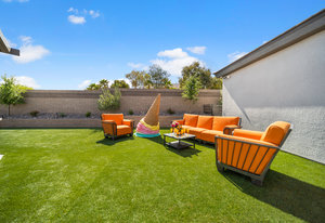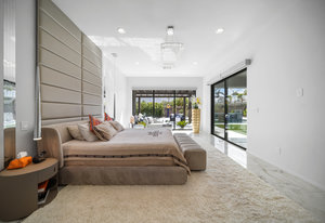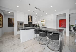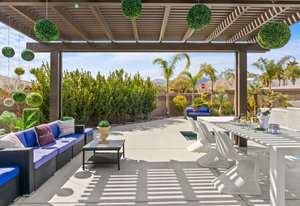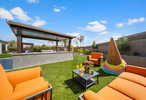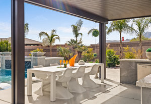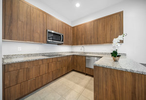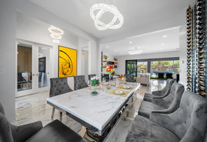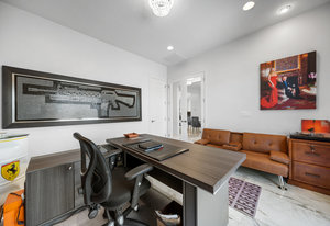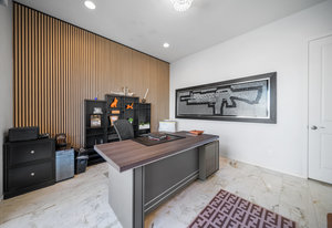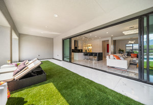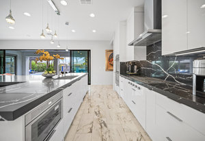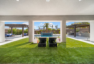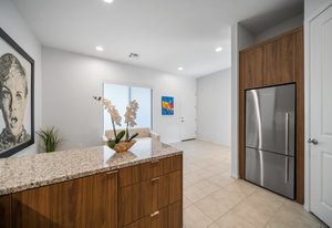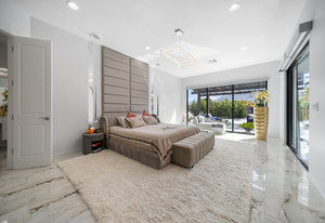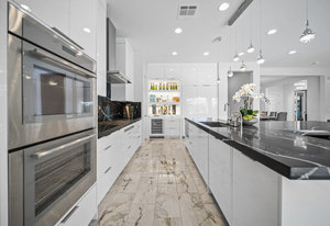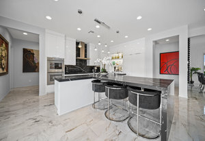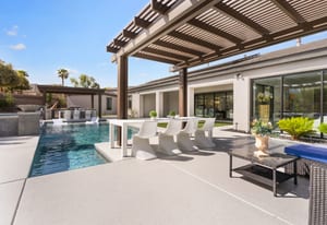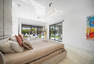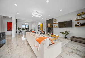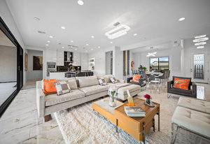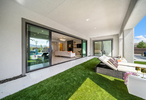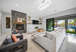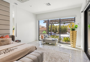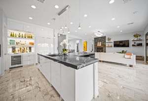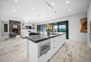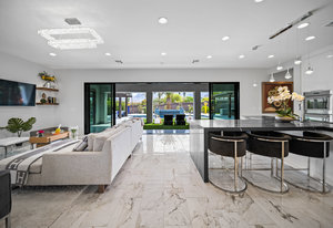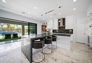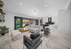 The thoughtfully designed open floor plan is filled with natural light, highlighted by sliding glass doors that connect the great room, primary suite, and office to the outdoors. At the heart of the home is a gourmet chef’s kitchen featuring Thermador appliances, an oversized island, custom cabinetry, an elegant onyx bar, and a built-in wine refrigerator—perfect for both everyday living and entertaining.