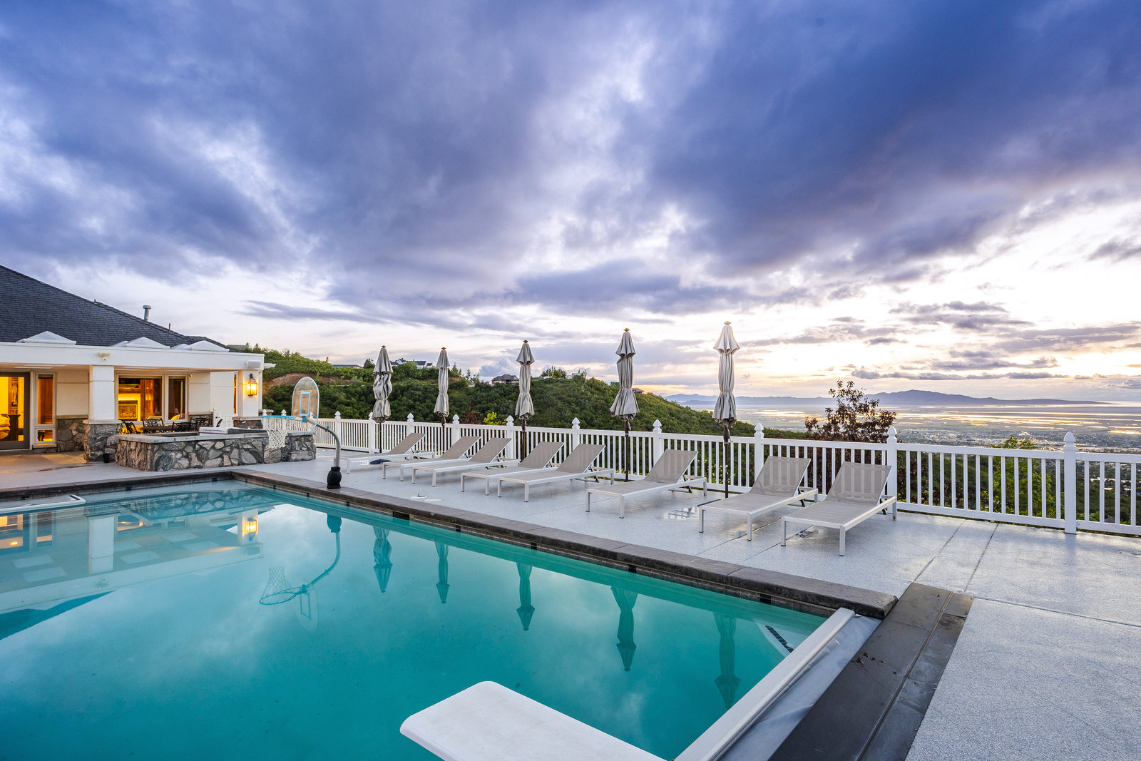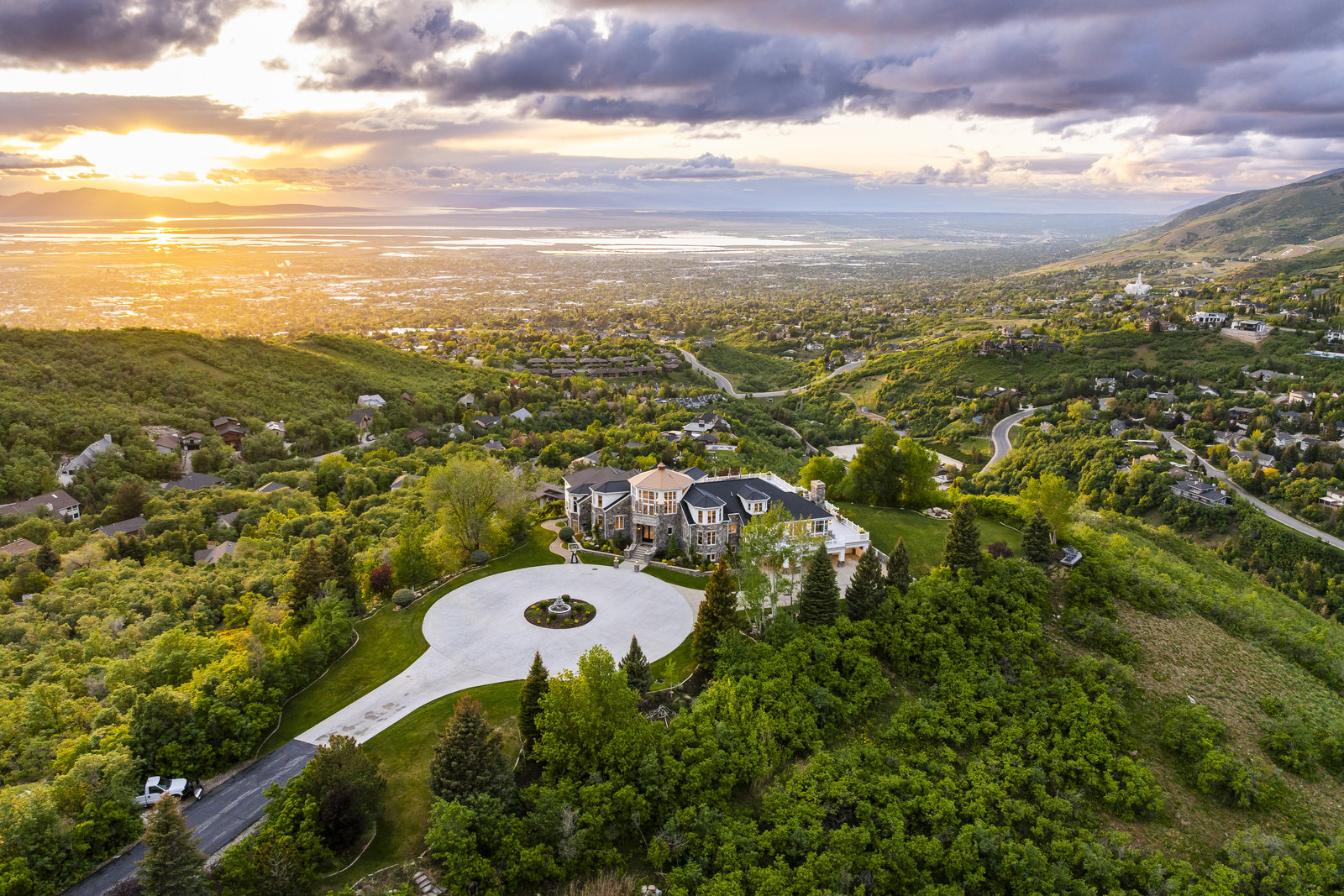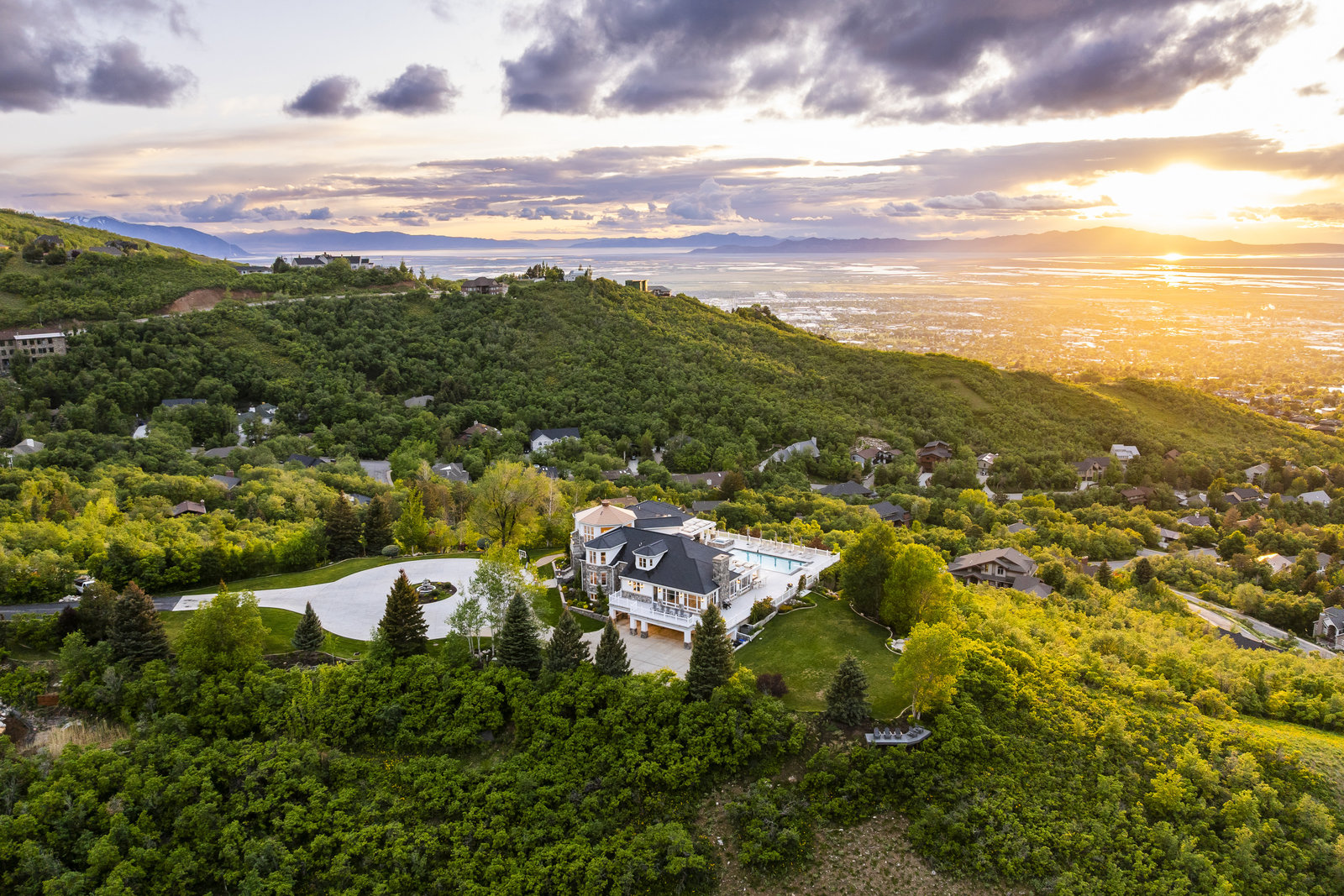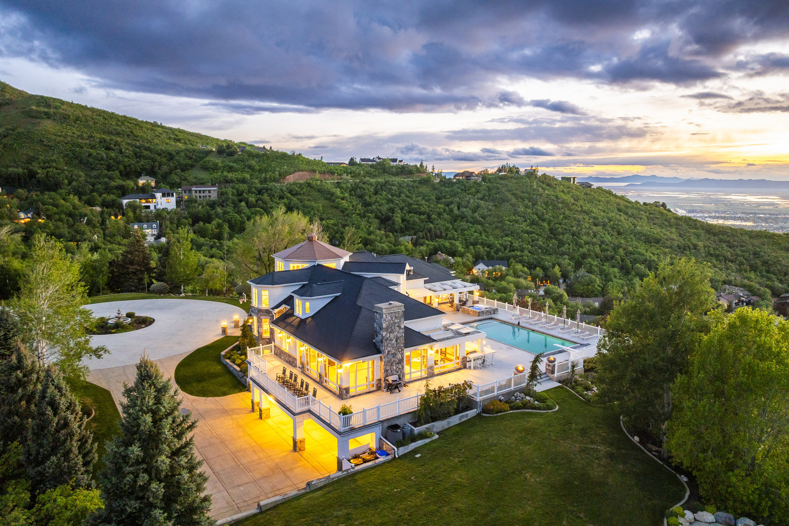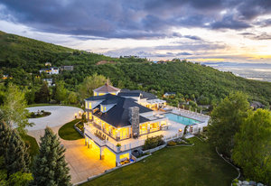 Perched on nearly seven private acres backing protected forest land, this expansive gated estate offers breathtaking panoramic views of the Great Salt Lake, Mueller Park Canyon, and the surrounding mountains. Thoughtfully designed for both grand entertaining and intimate living, the home features five bedrooms, seven bathrooms, and soaring ceilings that frame the stunning natural surroundings. Resort-style outdoor spaces include expansive decks with fire pits, a saltwater pool, in-ground hot tub, koi pond, outdoor kitchen, and lush, mature landscaping. Direct access to hiking and mountain biking trails enhances the estate's connection to nature. Inside, the fully renovated chef's kitchen boasts Wolf appliances and a butler's pantry, while the main-level primary suite offers his-and-hers dressing rooms, a spa-like bath, dry sauna, and steam shower. Additional highlights include a formal living and dining room, executive office, walk-out lower level, and an indoor basketball court. The six-car garage with a workshop provides ample space for vehicles, storage and projects. With the option to subdivide an additional building lot, this estate presents a rare opportunity for expansion of all kinds. Just 20 minutes from the growing vibrancy of downtown Salt Lake City and 45 minutes from world class skiing at Snowbasin, this is a once-in-a-lifetime offering of luxury, privacy with a lifestyle that is truly unmatched.