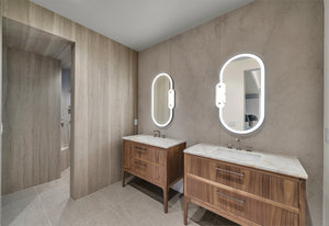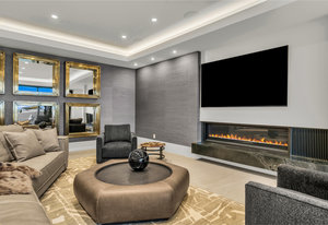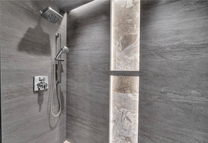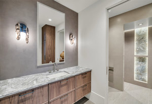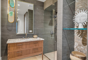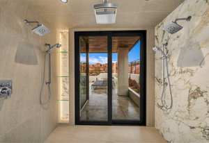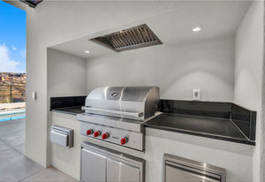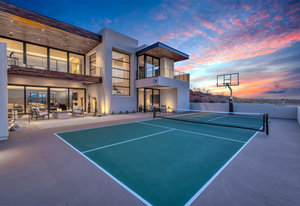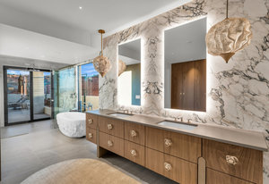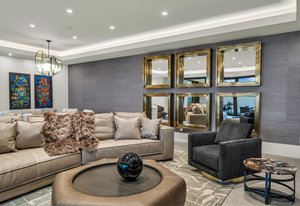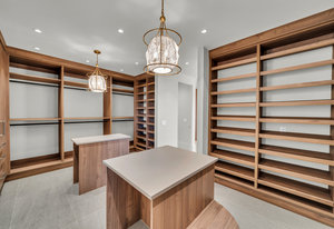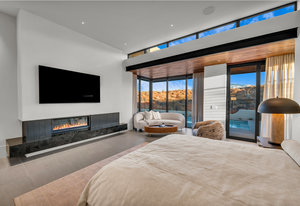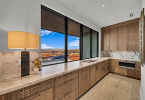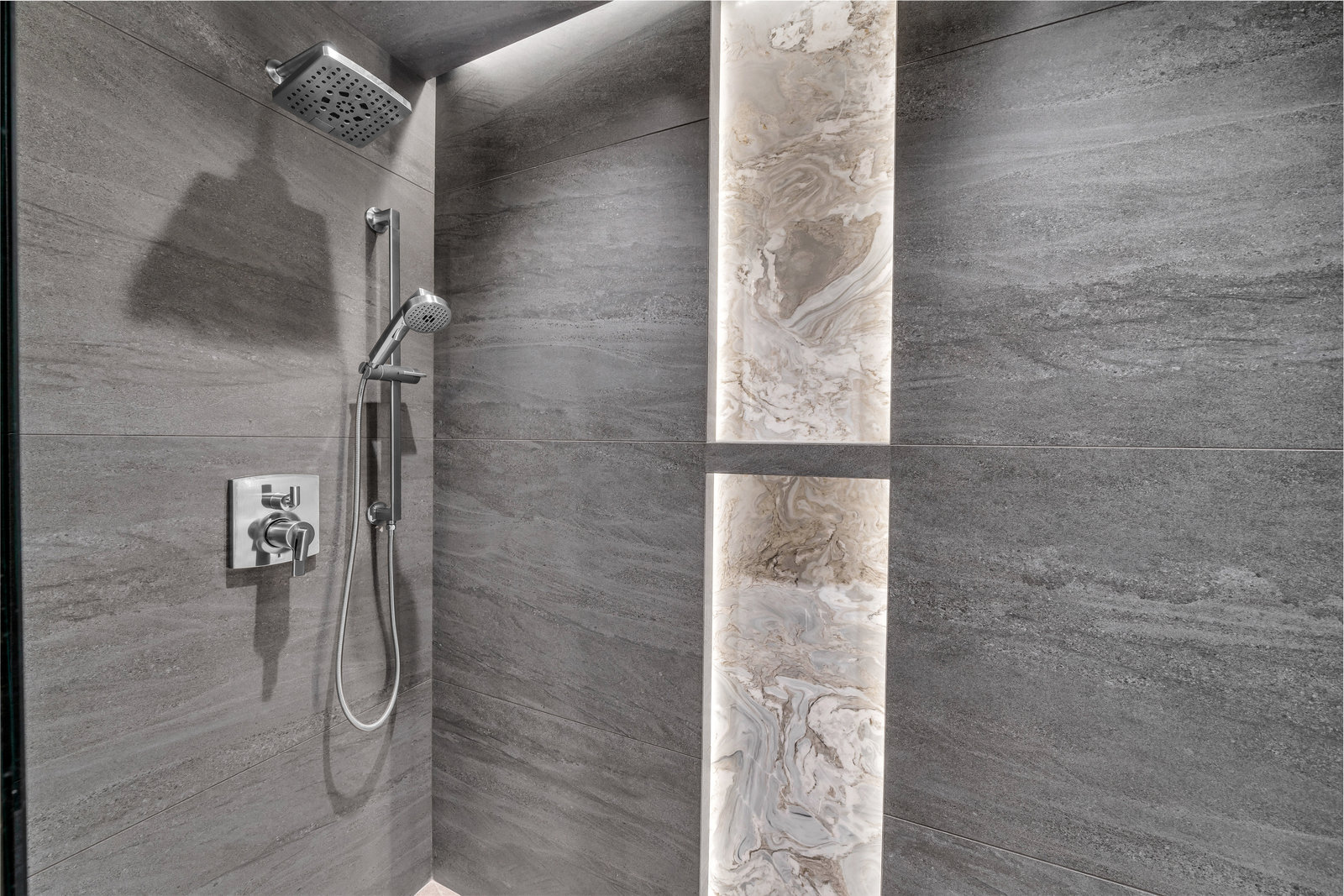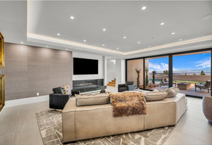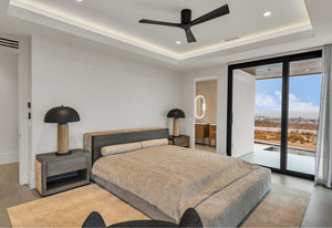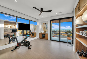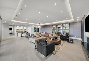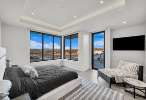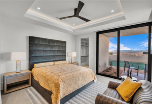 The home showcases custom walnut accents throughout the interior and exterior and intricate trim detailing on the bathroom walls. Each bathroom feels like a private spa, with backlit shelves in every shower. The bedrooms include elegant backlit ceiling trays and private outdoor seating areas, offering breathtaking views from every room.