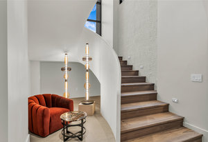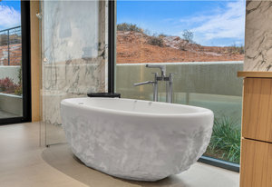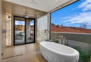 Art and design lovers will appreciate the custom artwork created by a local artist, bespoke furniture sourced from Los Angeles, and a striking Daniel Arsham sculptural bathtub in the primary suite. All are included in the purchase of this home. The exterior is equally impressive, with exposed aggregate concrete, C-channel steel beams, and warm walnut accents that harmonize beautifully with the surrounding natural landscape.