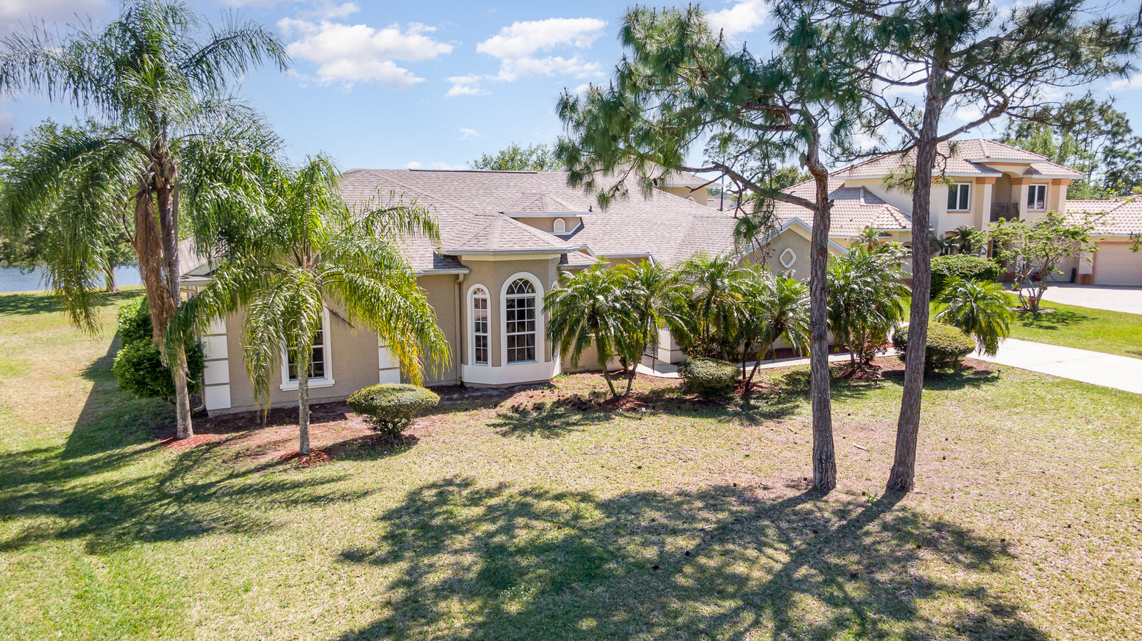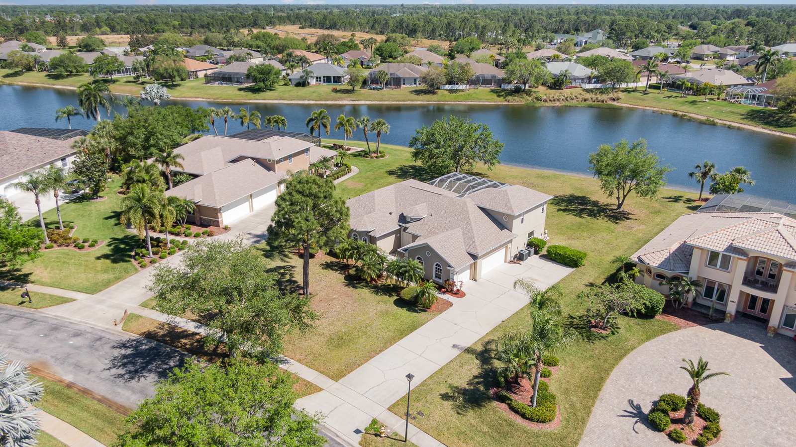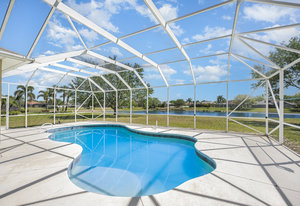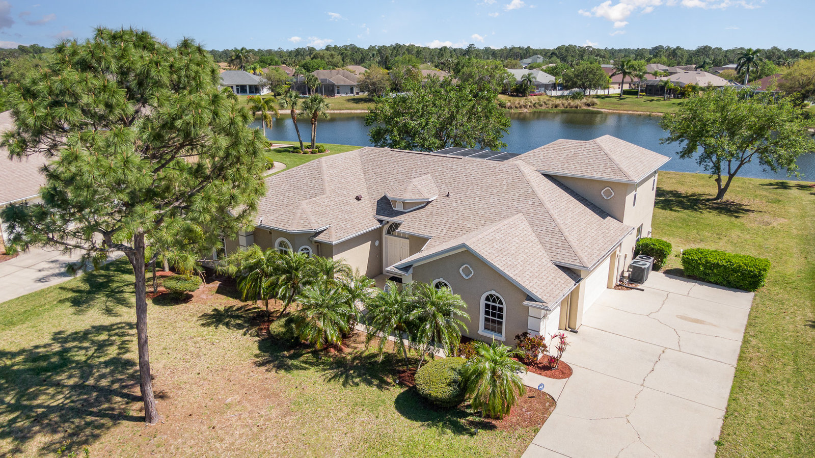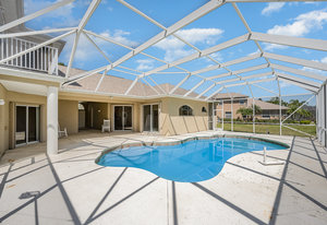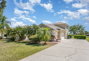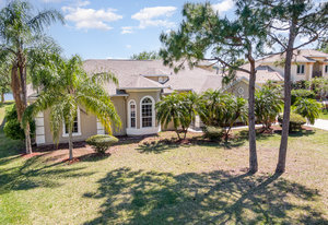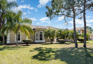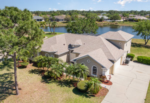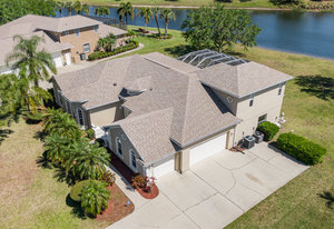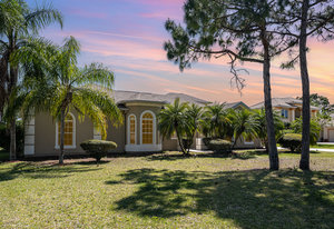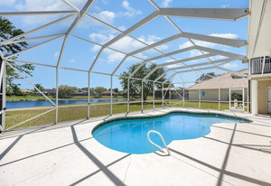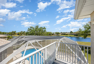 Welcome to Laurelwood, one of the nicest communities in Palm Bay with Beautiful tree lined streets featuring estate sized lots. This Courtyard style home is perfect for big or multigenerational families. When you walk thru the front door you are in the courtyard overlooking the screened in pool perfect for family gatherings and entertaining. To the left as you enter you will see the door to the main living area which features the main suite and a second bedroom. There is a large kitchen featuring an abundance of cabinets, granite countertops, GAS range, and a breakfast nook overlooking the beautiful front yard. The main bedroom has a slider overlooking the pool and Courtyard. Back out in the courtyard there is an entrance to the gigantic three car garage with tons of storage. There is a staircase leading to the supersizes guest bedroom with expansive views of the pool and lake out back .There is another sliding glass door off the courtyard that leads to the 4th bedroom with fantastic views of the pool and an attached bath that also doubles as a pool bath. Additional upgrades include roof (2024) dual AC units (2021), hot water heater (2020), accordion shutters, and a sprinkler system. Laurelwood is a desirable gated community with resort-style amenities, including a clubhouse, fitness center, basketball court, playground, RV/boat storage, and tennis courts. This is an awesome home worth checking out!