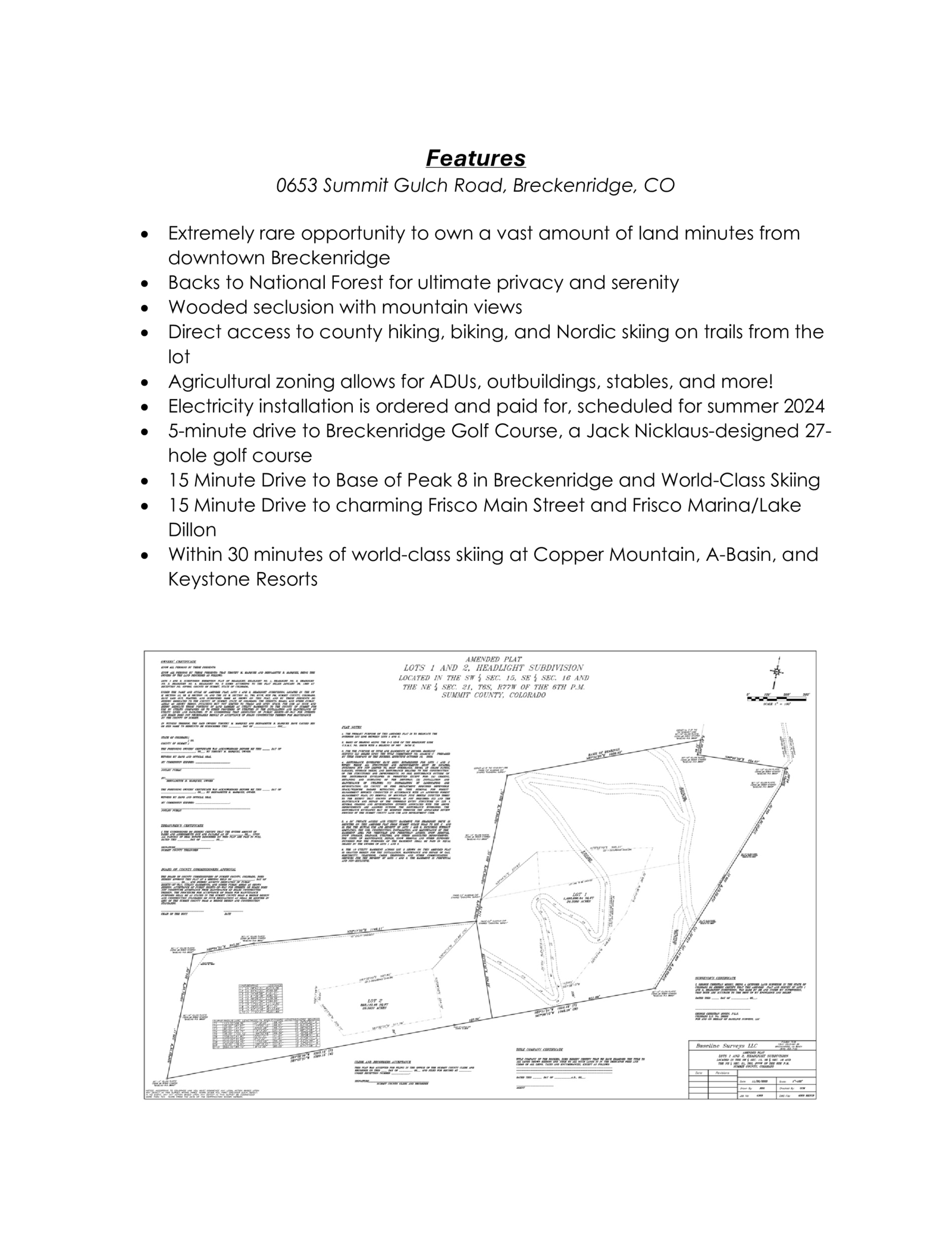 Build the mountain escape of your dreams on this 34.2 acre lot in Breckenridge. Backing directly to National Forest, this land provides natural seclusion, wooded serenity and expansive mountain views, offering the best of Summit County at the door of your future home! This lot grants direct access to hiking, biking, and cross country ski trails, while the Town of Breckenridge is less than 8 miles away for easy shopping, dining, and town events. Enjoy the Jack Nicklaus-designed, 27-hole golf course within a 5-minute drive, and world-class skiing at Breckenridge, Keystone, Copper Mountain, and A-Basin Ski Resorts in under 30 minutes. Agricultural zoning allows for a multitude of uses including stables, accessory dwelling units and outbuildings. Don’t miss this rare opportunity to own large acreage in a remarkable location!