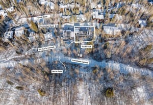 The home includes a primary suite with a fireplace, spa-caliber bath, and motorized drop-down hanging rods increasing linear storage by approximately 50%, along with four additional en suite guest accommodations, including a dedicated bunkroom. A lower-level recreation room with a wet bar, private guest suite, multiseason mudroom, heated two-car garage, and commercial-grade elevator providing effortless movement between levels.