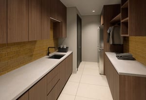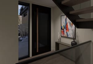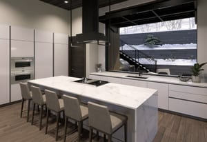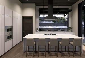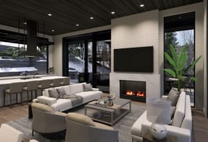 Inside, the open-concept great room is anchored by a fireplace and expansive glass, flowing seamlessly into a chef's kitchen with custom Italian cabinetry, Calacatta-inspired slab surfaces, a handcrafted Raw Urth steel range hood, and integrated Sub-Zero, Wolf, and Cove appliances.