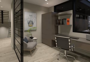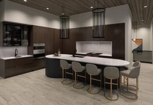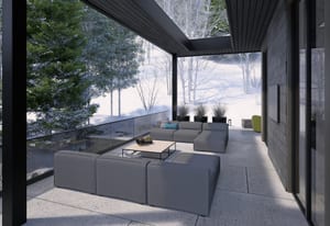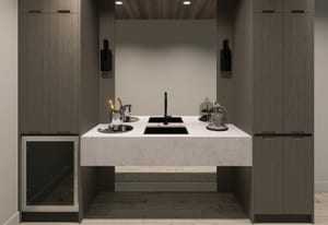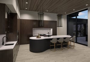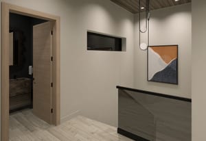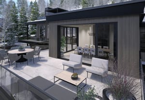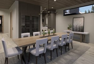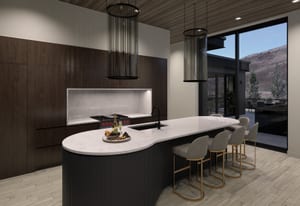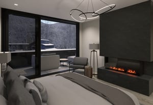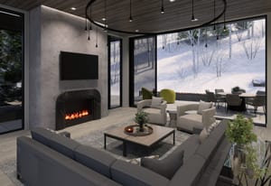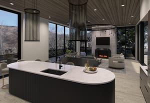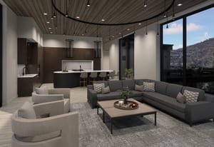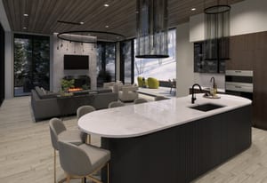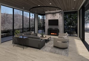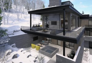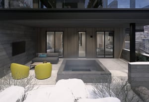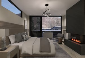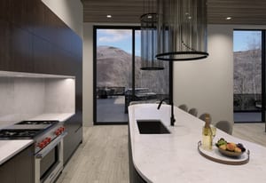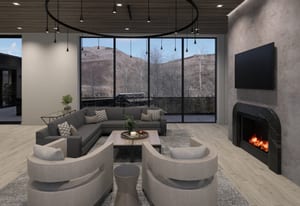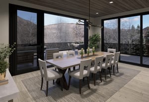 The heart of the home is a dramatic, open-concept great room designed for effortless entertaining and everyday living. Expansive glass walls connect the kitchen, dining, and living areas, while heated patios wrap three sides of the great room, creating an exceptional indoor-outdoor flow and allowing the space to open fully to the mountain air and views. This level offers sweeping perspectives of the Gore Range, Vail Village, and skiers descending Vail Mountain.