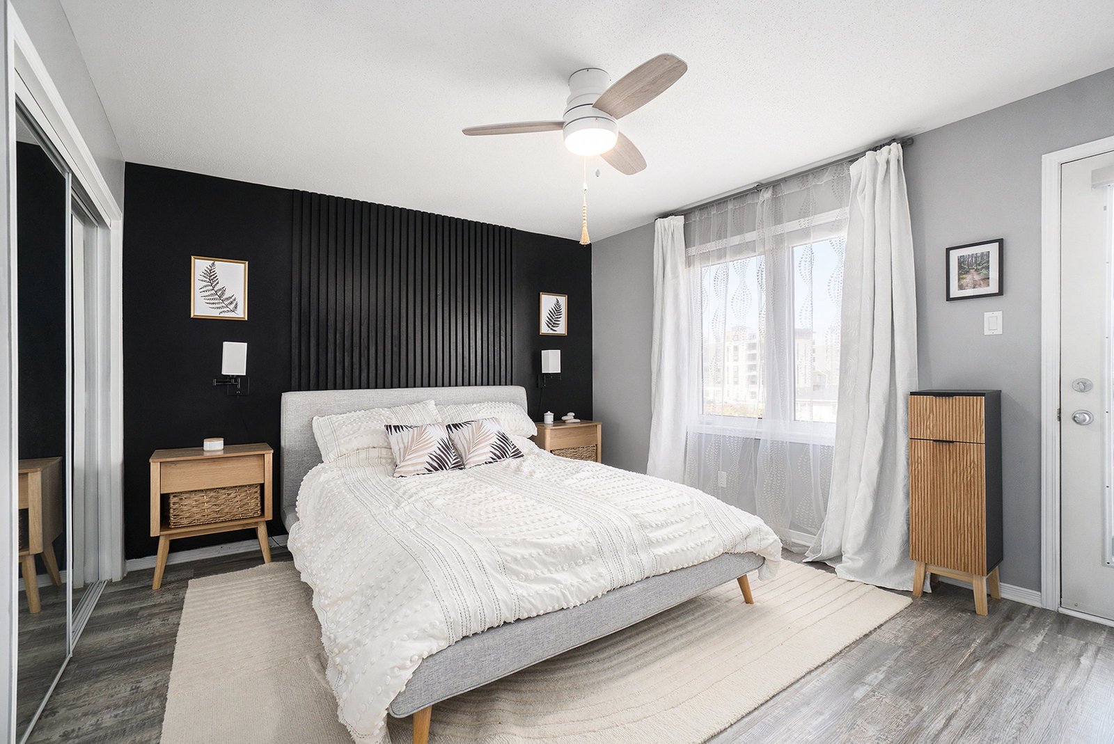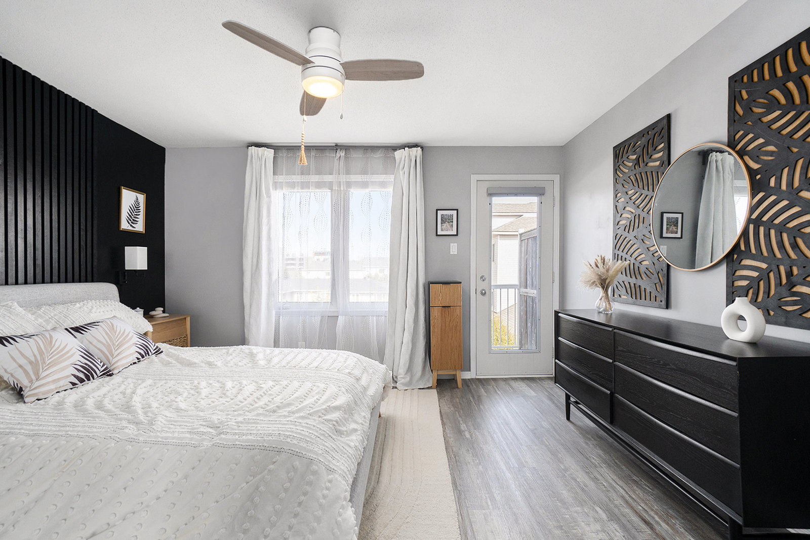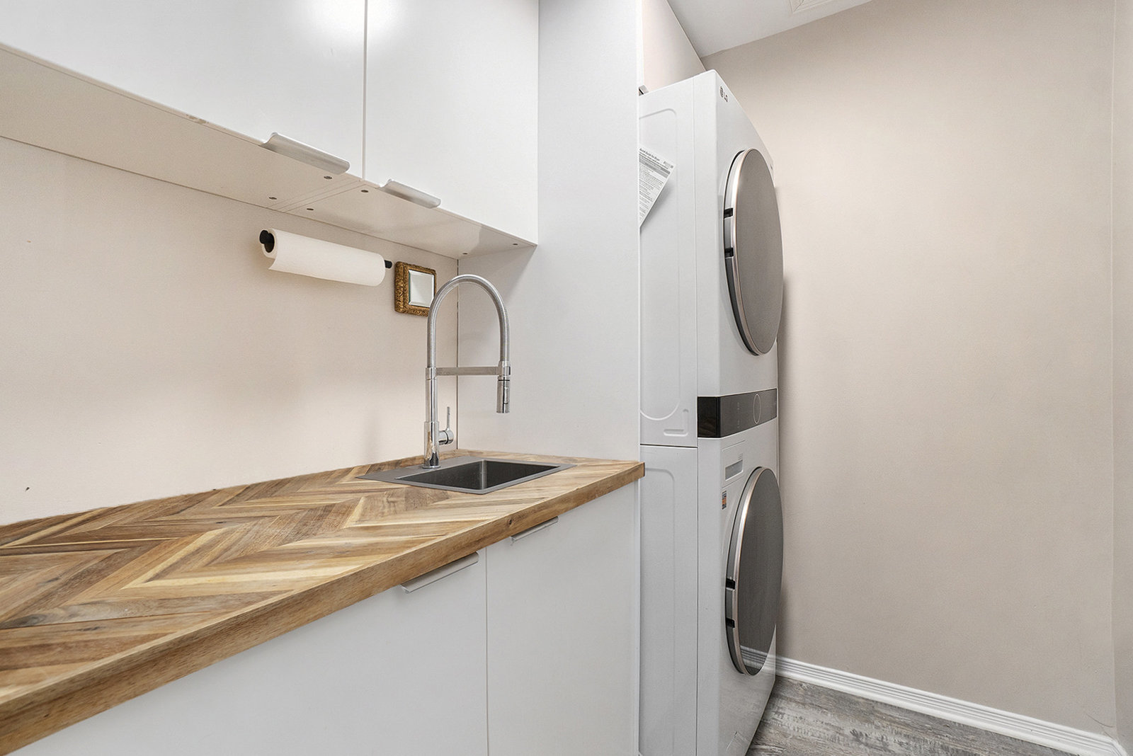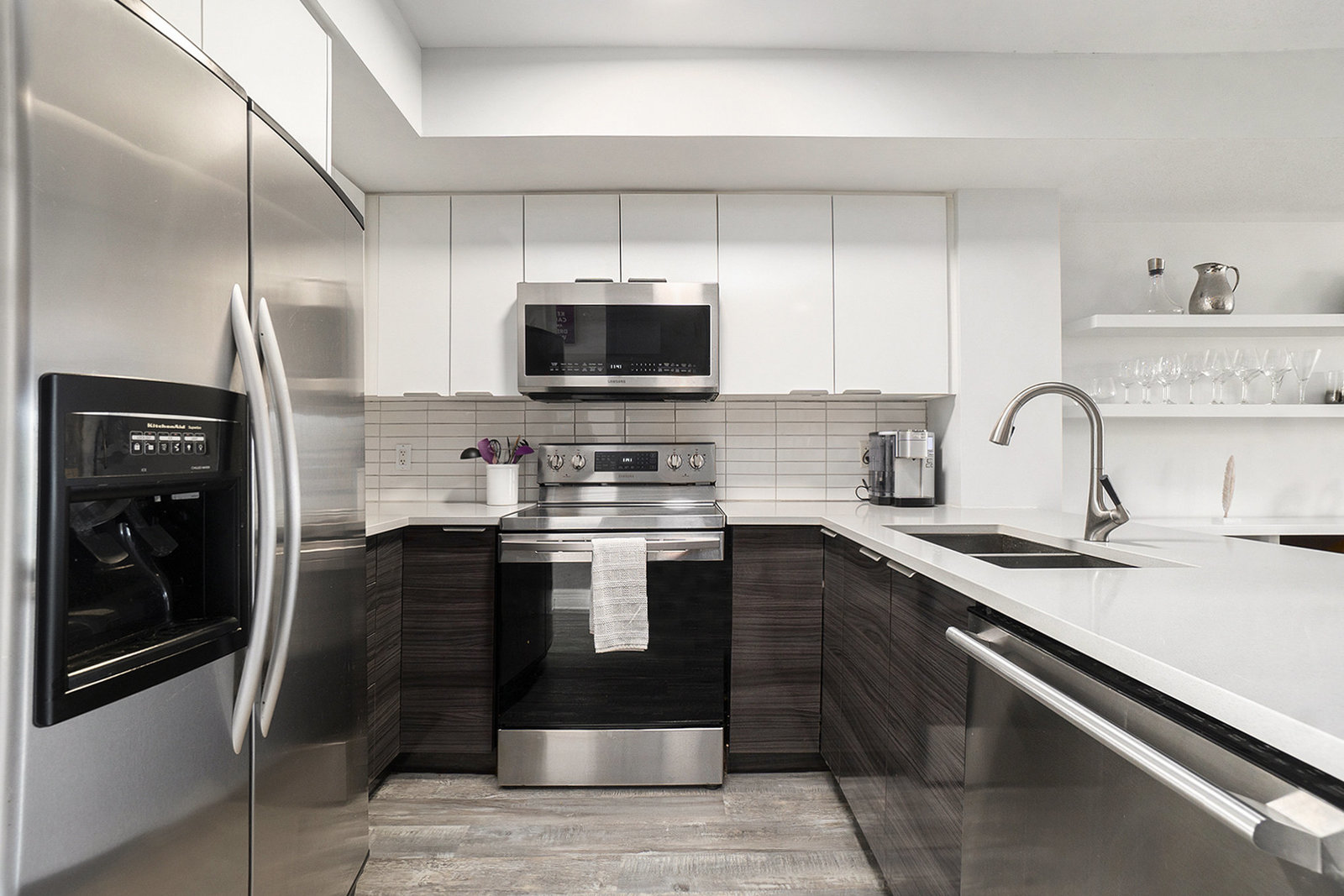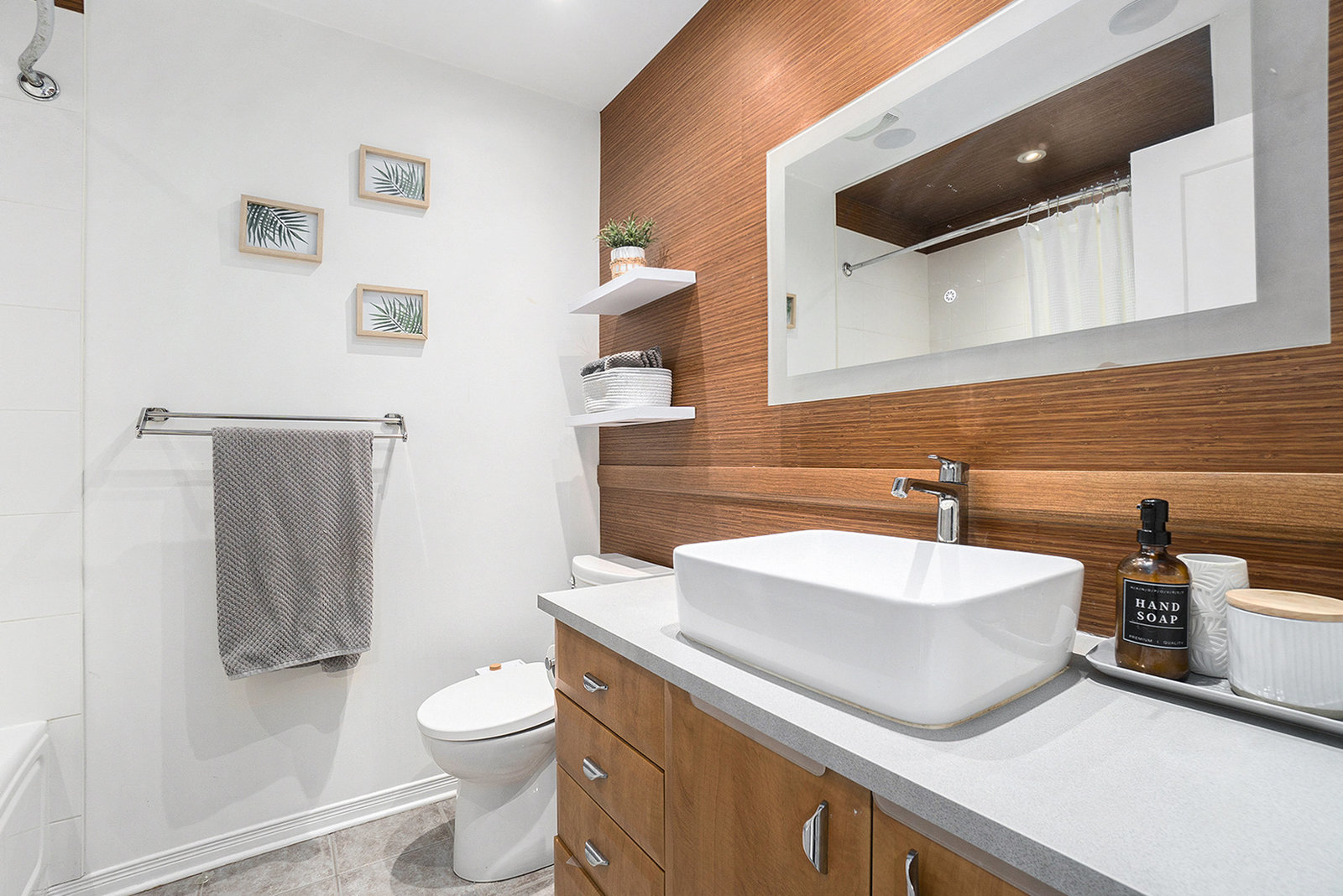 The fully modernized kitchen features sleek quartz countertops, updated cabinetry, chic backsplash, a double sink, and stylish fixtures. Every door, handle, and fixture throughout the home has been replaced to match the upgraded aesthetic. Both bathrooms shine with updated faucets, toilets, vanity mirrors, and contemporary finishes, with the main bathroom also featuring a bathtub, pot lights and ceiling speakers.