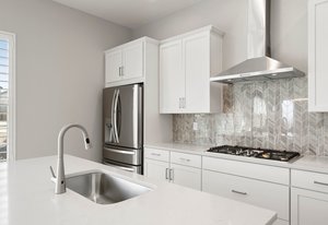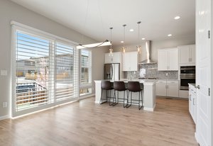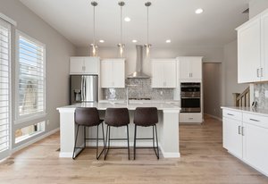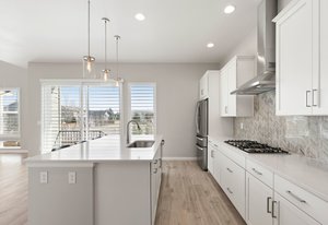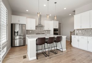 Pendant lights over kitchen island.