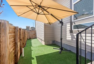 Enclosed fence space (dog run) with artificial turf + cantilever umbrella.