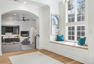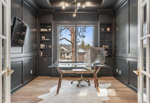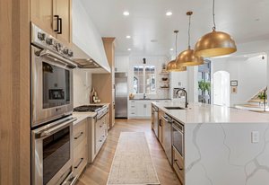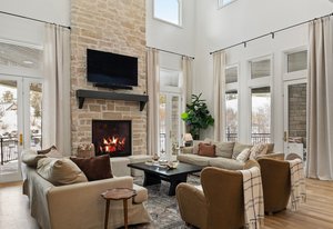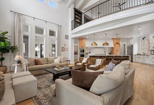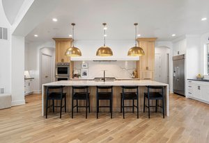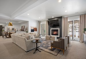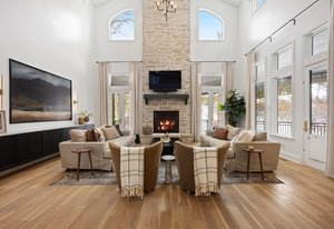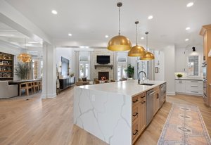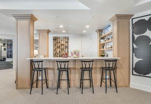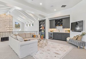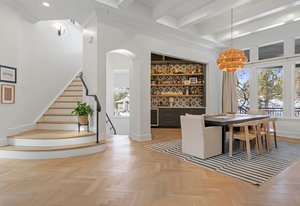 While a masterpiece of contemporary design and sophisticated elegance, this home exists to be lived in. The kitchen is gorgeous with its soft white tones, enhanced by white oak cabinetry, a striking Moroccan plaster range hood, and book-matched quartz that seamlessly flows across the waterfall island, countertops, and backsplash. High-end Thermador appliances, including a built-in, plumbed coffee system, complete the space. Adjacent to the kitchen, the great room soars with a two-story vaulted ceiling and a stone fireplace, with three sets of doors opening to the deck. The dining room, positioned just off the entry, features a wet bar that serves as a stunning focal point.