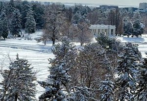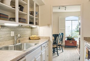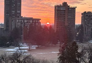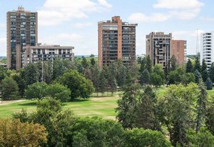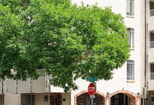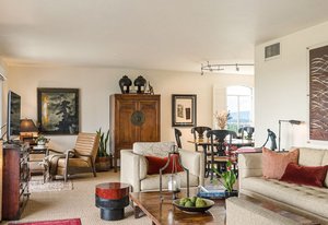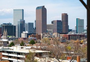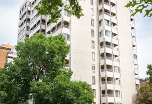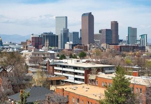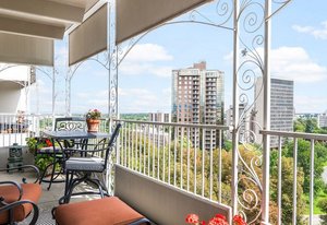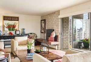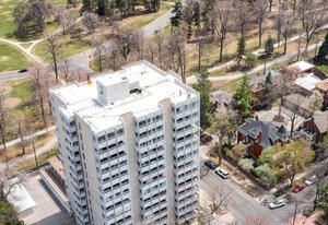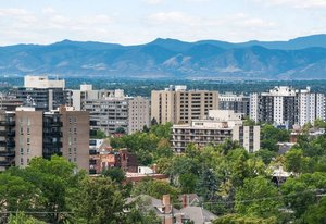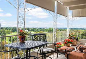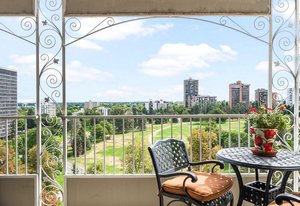 Welcome to this stunning 14th-floor corner unit, offering sweeping views of both Cheesman Park and Majestic Pikes Peak. As you step through the front door, you'll be greeted by an abundance of natural light streaming in through the expansive floor-to-ceiling windows, creating an inviting and warm atmosphere. The living area is anchored by a charming stone accent wall that surrounds a real wood-burning fireplace—perfect for cozy winter evenings.