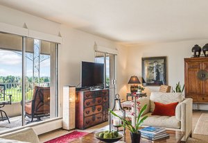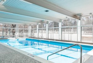 The secure lobby area of the building provides access to additional amenities including a billiards room, gym with steam room, and enclosed pool.