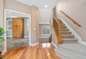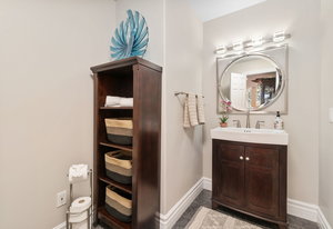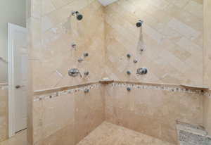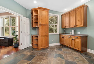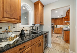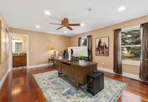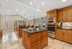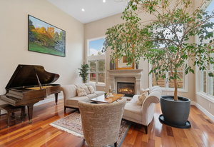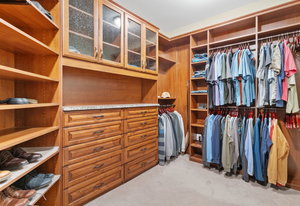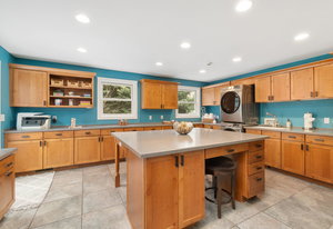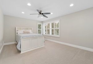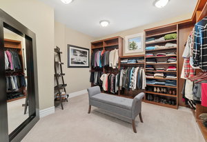 Designed for culinary excellence, the kitchen is outfitted with two oversized islands, three ovens, a pot filler, an industrial-grade six-burner gas range, and dual dishwashers. A generous walk-in pantry and separate butler’s pantry cater to both practicality and entertaining. Upstairs, two additional ensuite bedrooms feature custom California Closet shelving and plantation shutters, with one concealing a whimsical hidden playroom.