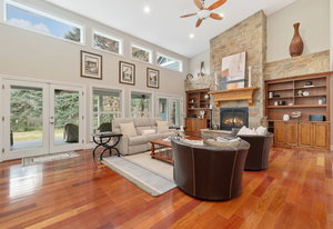 Outdoor spaces are designed for serenity and social gatherings, with three patios—two covered and one open—ideal for unwinding or hosting. For equestrian enthusiasts, the estate includes a one-stall barn with a tack room, fenced pasture, and hay shed. Once home to a thriving tree farm, the property is enveloped in lush greenery, offering unparalleled beauty and seclusion. A picturesque creek meanders along the back, enhancing the serene atmosphere.