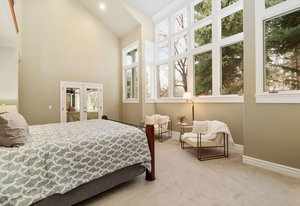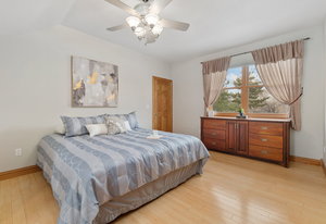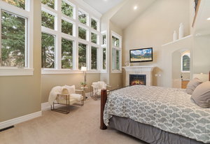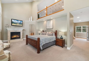 The main home features four ensuite bedrooms and 4.5 bathrooms, each designed for comfort and sophistication. The primary suite is a sanctuary of relaxation, complete with a fireplace, wet bar with a built-in refrigerator, and two expansive walk-in closets. The spa-like primary bathroom includes a five-piece layout, heated flooring, an additional fireplace, and a tranquil atmosphere for ultimate rejuvenation. A private loft within the suite provides a versatile space, ideal for a home office or wellness retreat. The main level also includes an elegant guest suite, ensuring visitors experience both privacy and luxury.