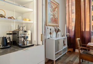 seating and wine/beverage fridge. Convenient hideaway coffee station. Walnut cabinet interiors with Wolf and SubZero