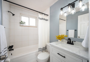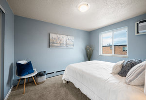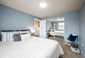 The bright and airy bedroom boasts generous closet space. The bathroom has been thoughtfully updated with a new vanity, contemporary fixtures, and modern tile work.
