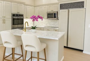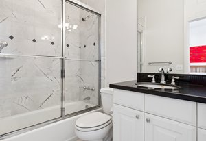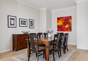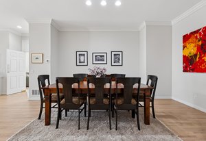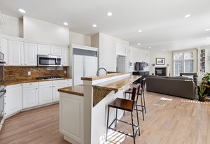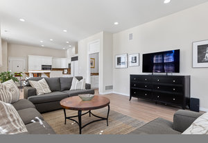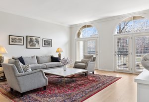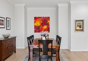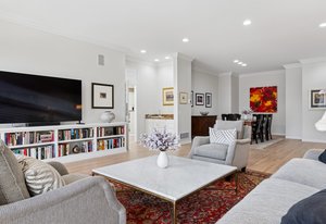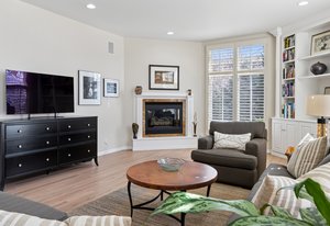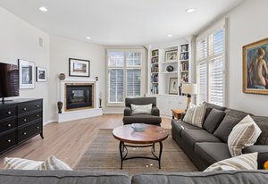 The home’s transitional design features 10-foot ceilings, smooth-coat walls, crown moulding, and newly refinished hardwood floors (2022). Expansive south- and east-facing windows fill the open living and dining areas with natural light. Built-in bookcases, a gas fireplace, and seamless flow to the covered patio create an inviting space for both everyday living and entertaining. The patio includes a natural-gas hookup for grilling, a water line for plants, and ample room for dining and lounging.