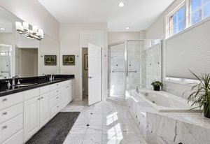 The well-appointed kitchen features granite counters, a Sub-Zero refrigerator, GE double ovens, and a spacious island with storage and seating. The primary suite opens to the patio and includes dual closets and a five-piece bath with large soaking tub, dual sinks, and custom linen cabinetry. A comfortable guest suite with ensuite bath offers privacy for visitors.