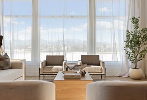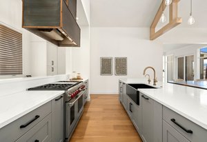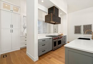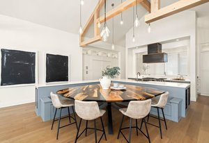 The gourmet kitchen features a butler’s kitchen for discreet storage of mess and appliances, integrated SubZero refrigeration system, Wolf gas stove, dual Cove dishwashers, and a custom dining table.