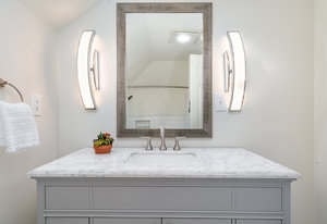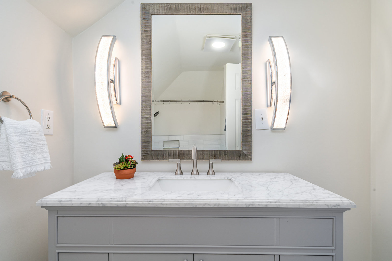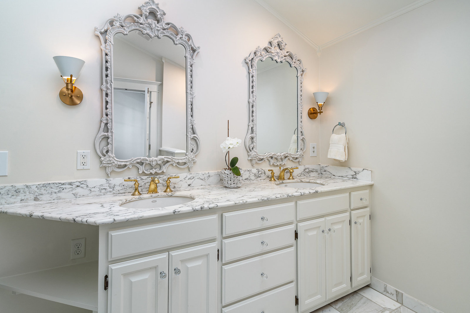 Upstairs Bath: Marble tub/shwer/Carrera marble vanity.