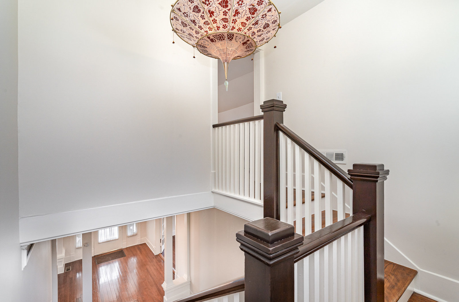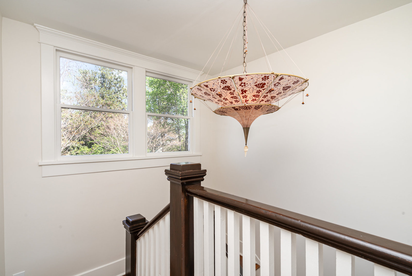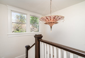 Wood stairs w/Venetian Fortuny glass chandelier.